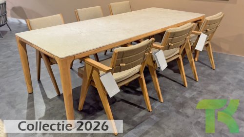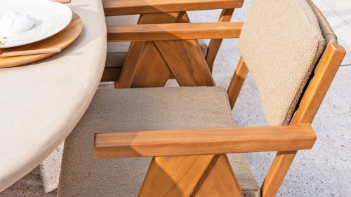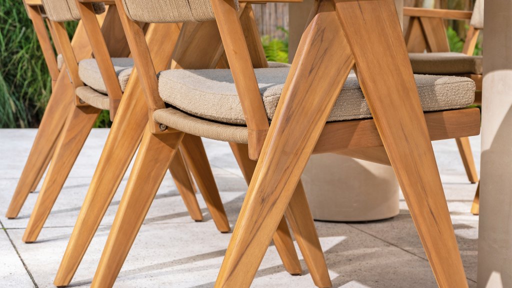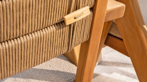- Stilvolles und zeitloses Design: Die Kombination aus Teakholz und taupefarbenem Bouclé schafft eine elegante und beruhigende Atmosphäre in jedem Garten.