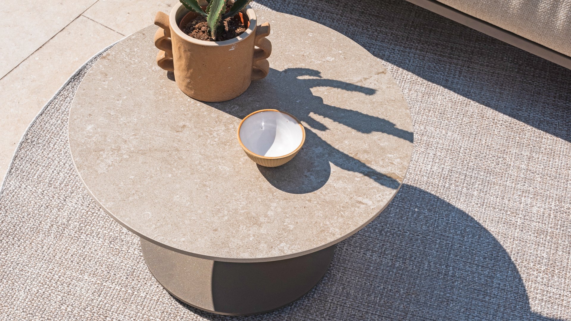 Entdecken Sie die Schönheit und Vielseitigkeit des runden Couchtisches 4 Seasons Outdoor Boaz mit seiner wunderschönen Keramiktischplatte und dem pulverbeschichteten Gestell. Dieser Tisch verleiht Ihrem Außenbereich einen Hauch natürlicher Eleganz und wurde mit Liebe zum Detail entworfen. Charakteristisch ist das zentrale Bein und die robuste Bodenplatte, die den 4Seasons Boaz Tisch äußerst stabil machen.