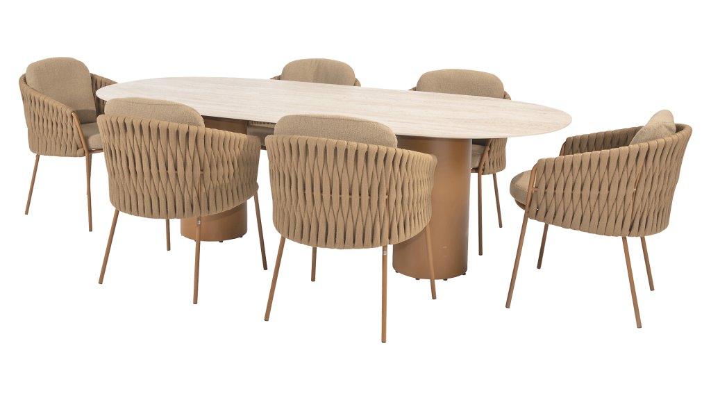Der Rahmen besteht aus pulverbeschichtetem Edelstahl in einem warmen, erdigen Bernsteinton, kombiniert mit einem auffallend dicken Seilgeflecht. Diese handwerkliche Verarbeitung verleiht der Amber-Serie ein robustes und zugleich edles Aussehen. Die wetterbeständigen Olefin-Kissenbezüge sind UV- und schimmelresistent – ideal für jahrelangen Einsatz im Freien. Die Stuhlschale bietet bequeme Rücken- und Armstütze.