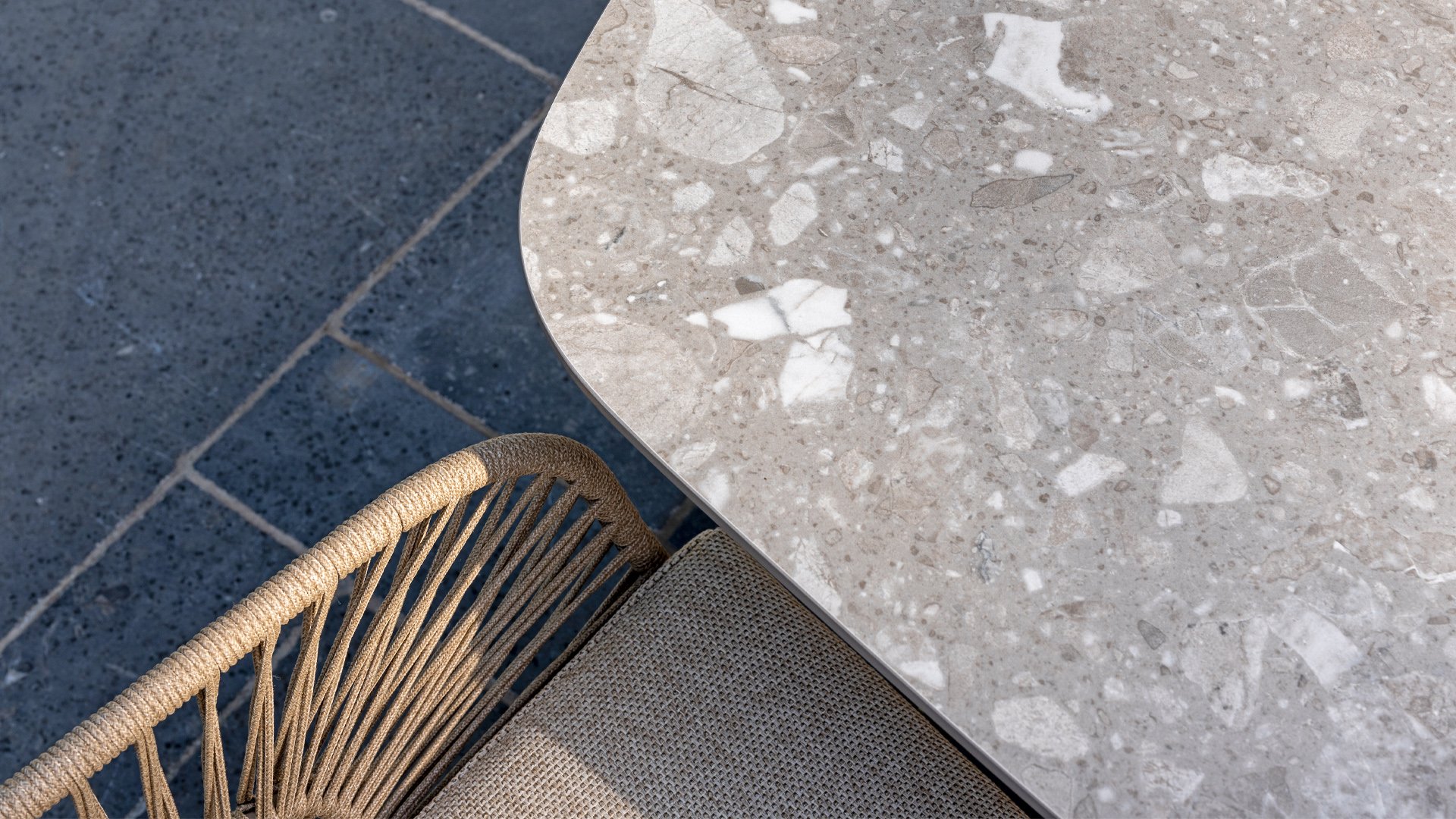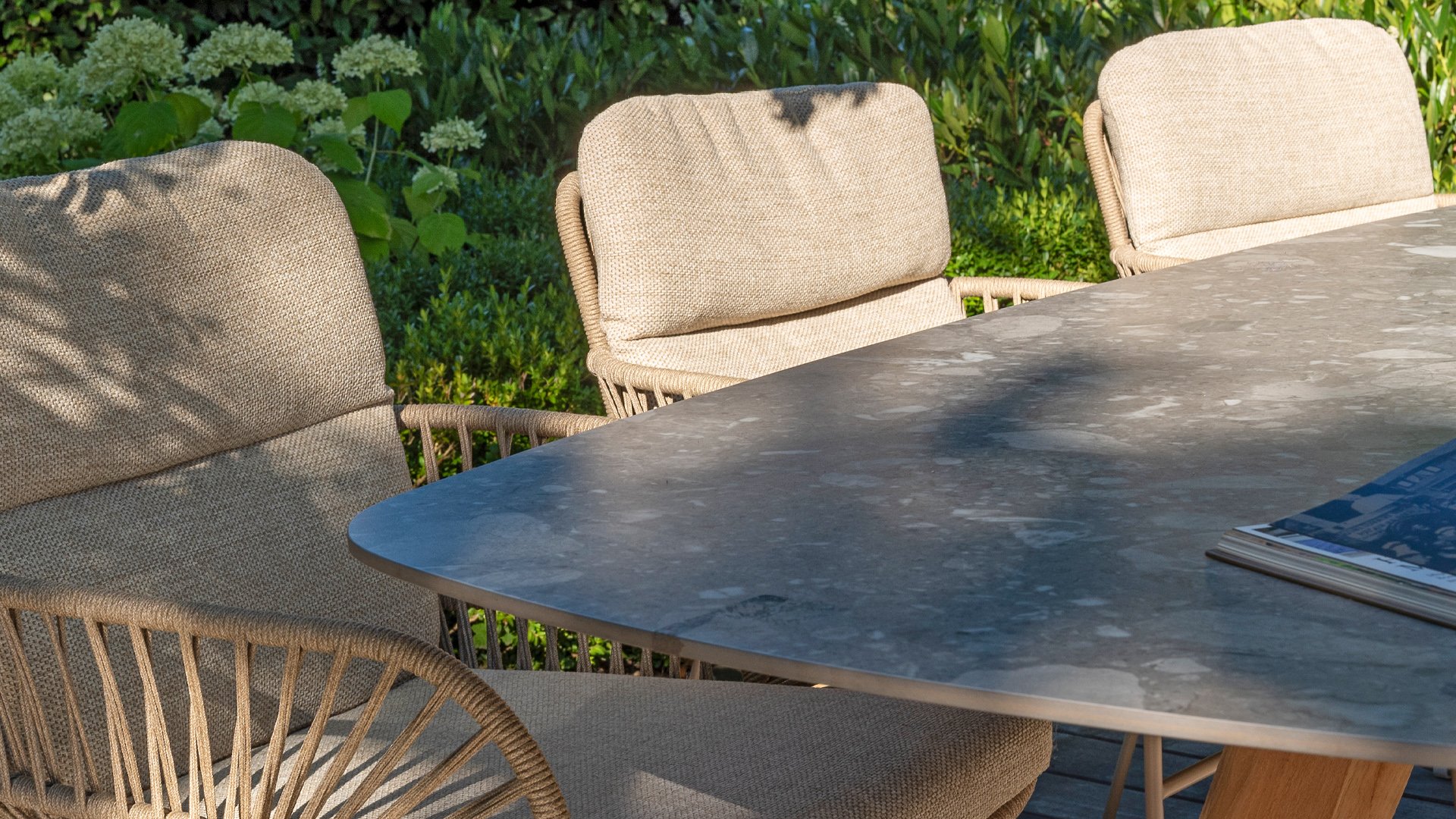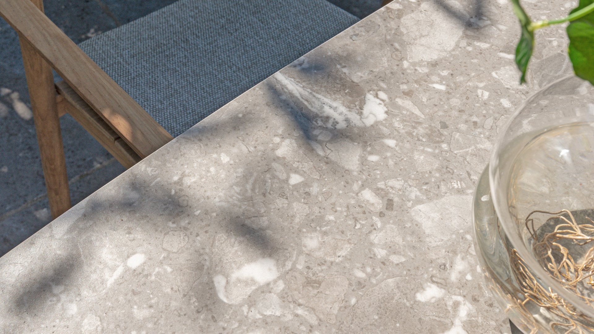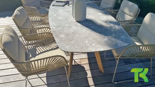 Der 4Seasons Outdoor Montana ist ein wunderschöner Tisch, der sofort ins Auge fällt. Er sieht nicht nur modern aus, sondern ist aufgrund der Form der Tischplatte auch äußerst praktisch. Der Tisch zeichnet sich durch die ovale dänische Tischplatte aus, wodurch an allen Seiten des Tisches ausreichend Platz entsteht. Innerhalb der Montana-Serie gibt es verschiedene Optionen; Die 240 cm Terrazzo-Keramikplatte der Montana-Serie kann mit einem RVS- oder Teakholzgestell kombiniert werden. Innerhalb der Montana-Serie gibt es auch einen 280 cm Tisch mit HPL-Platte.