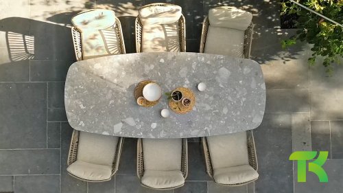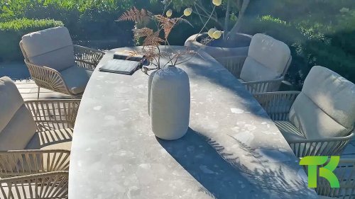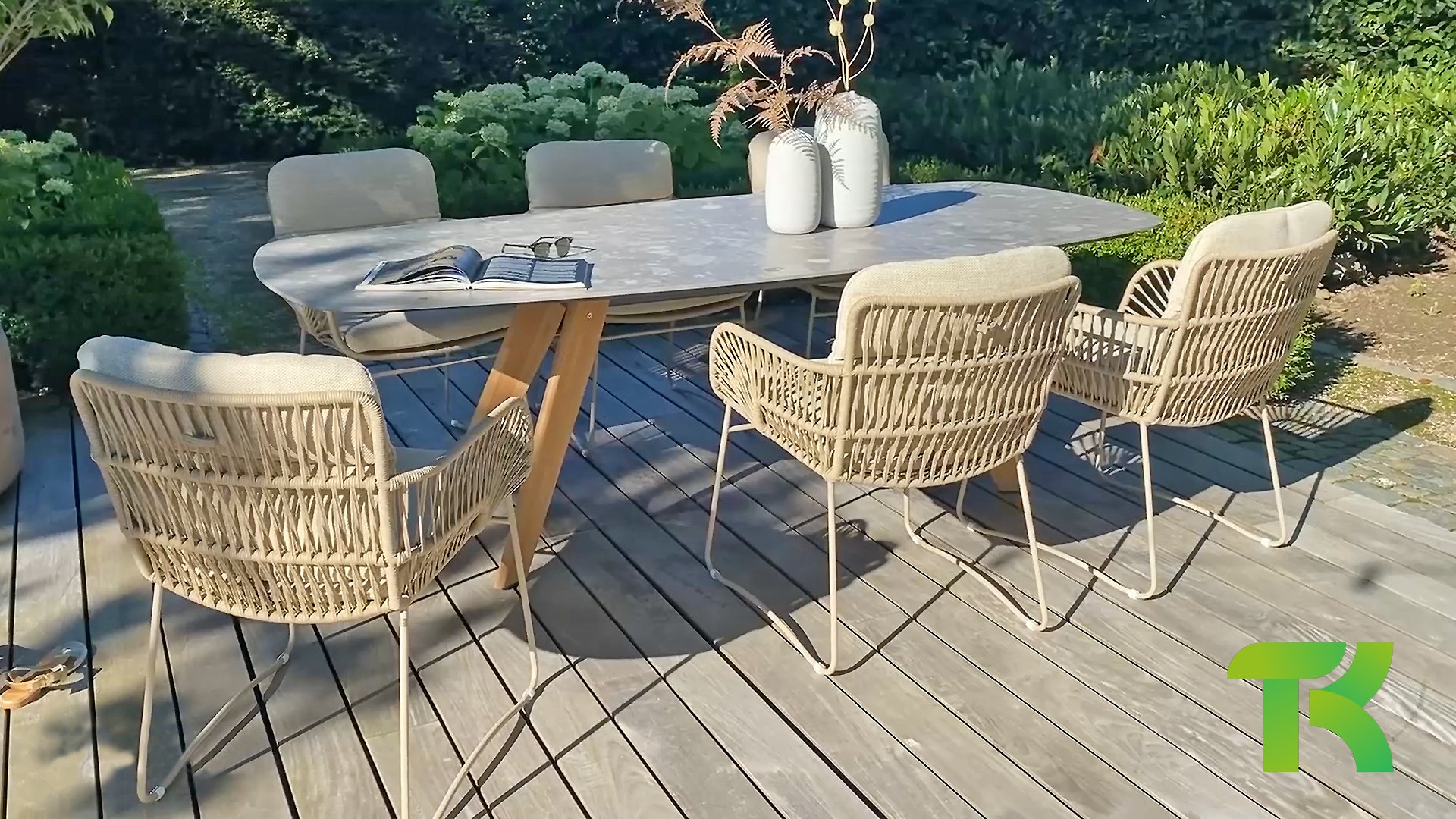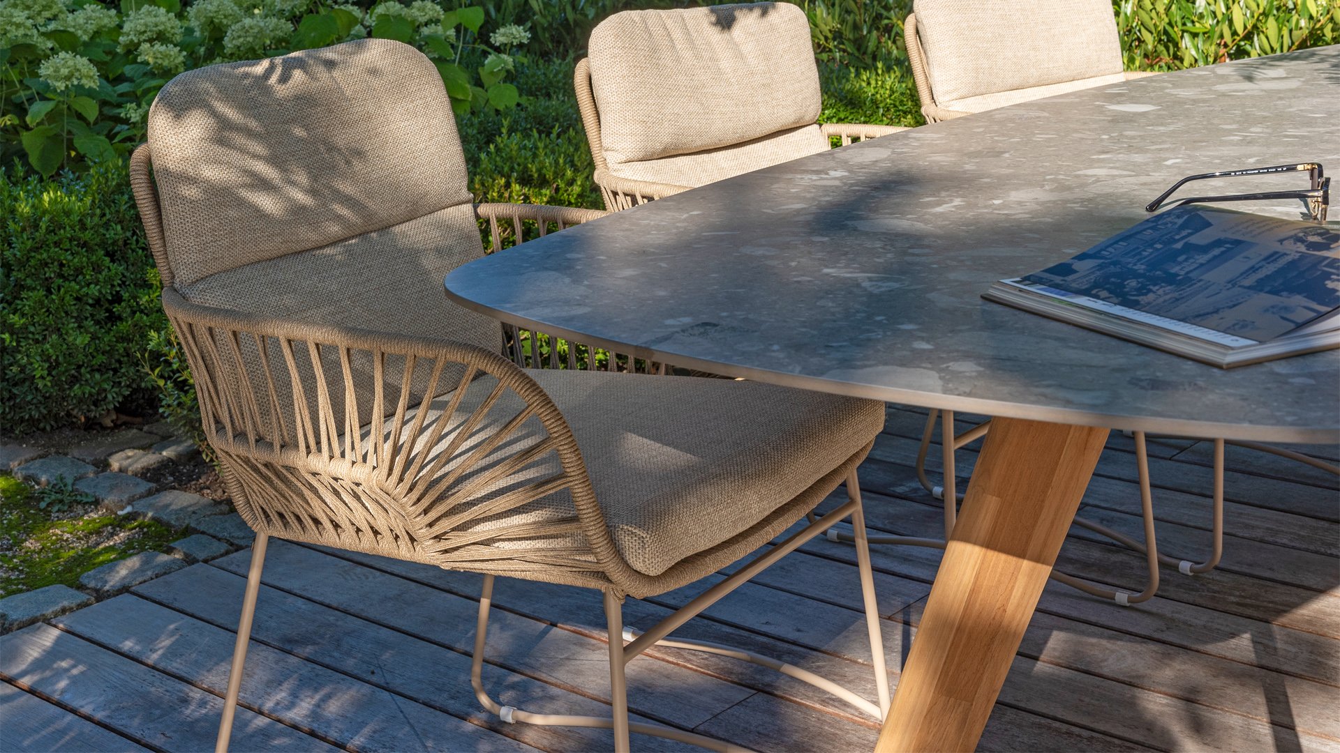 Der 4Seasons Outdoor Montana ist ein wunderschöner Tisch, der sofort ins Auge fällt. Er sieht nicht nur modern aus, sondern ist aufgrund der Form der Tischplatte auch äußerst praktisch. Der Tisch zeichnet sich durch die ovale dänische Tischplatte aus, wodurch an allen Seiten des Tisches ausreichend Platz entsteht. Innerhalb der Montana-Serie gibt es verschiedene Optionen; Die 240 cm Terrazzo-Keramikplatte der Montana-Serie kann mit einem RVS- oder Teakholzgestell kombiniert werden. Innerhalb der Montana-Serie gibt es auch einen 280 cm Tisch mit HPL-Platte.