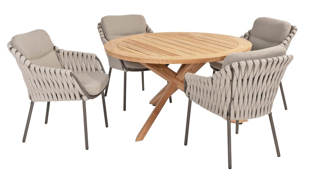 Lernen Sie das 4 Seasons Outdoor Montera Dining kennen. Hergestellt mit einem Edelstahlrahmen in der Farbe Terre. Der Seilfaden sowie die Kissen sind in der Farbe Clay gehalten, die Polsterung der Kissen ist zur Abwechslung einmal Boucle! So sieht es nicht nur schick aus, sondern auch schön, trendig und verspielt.