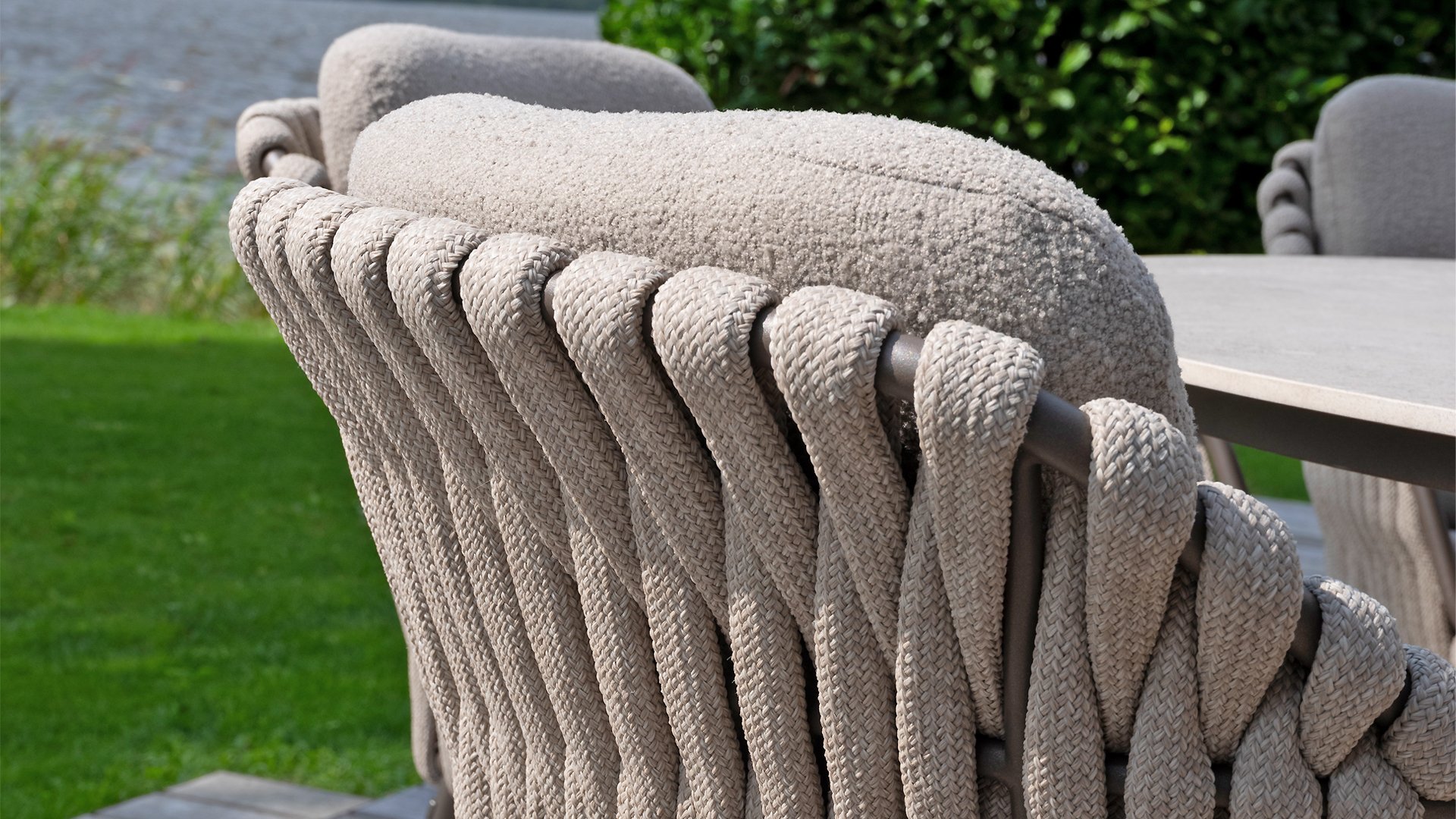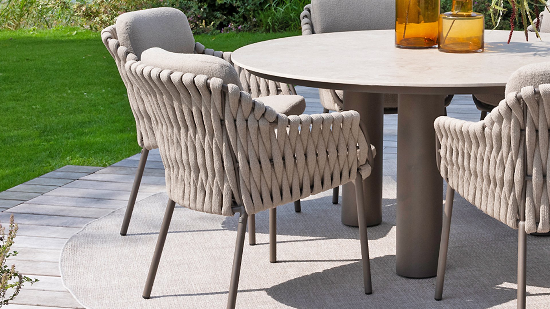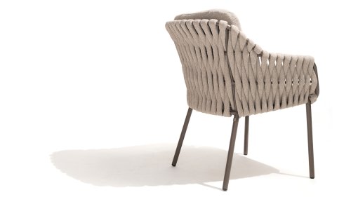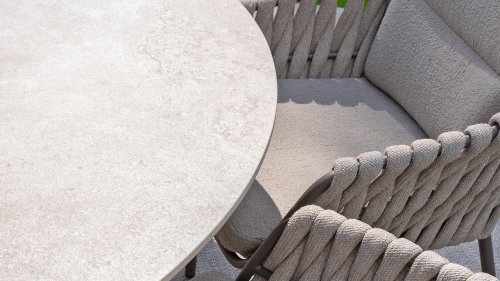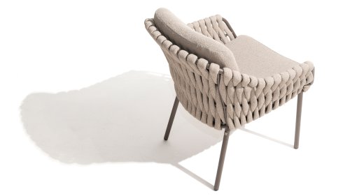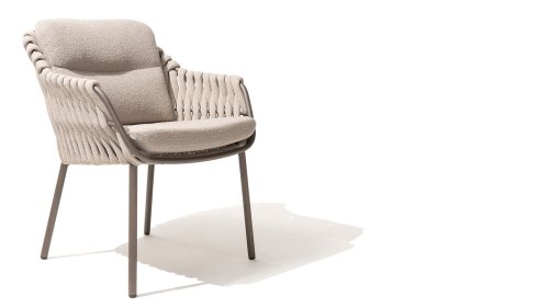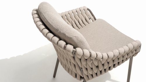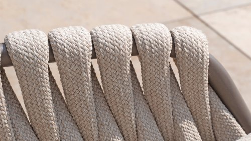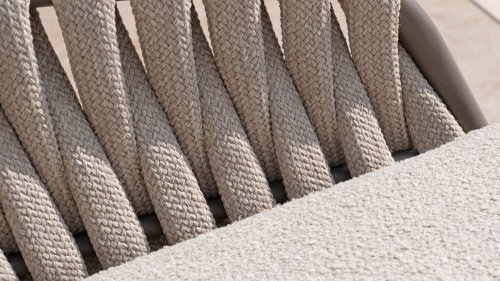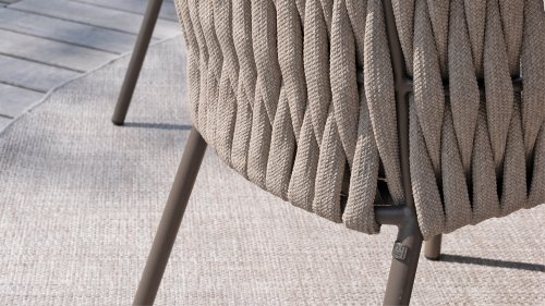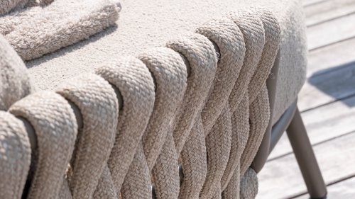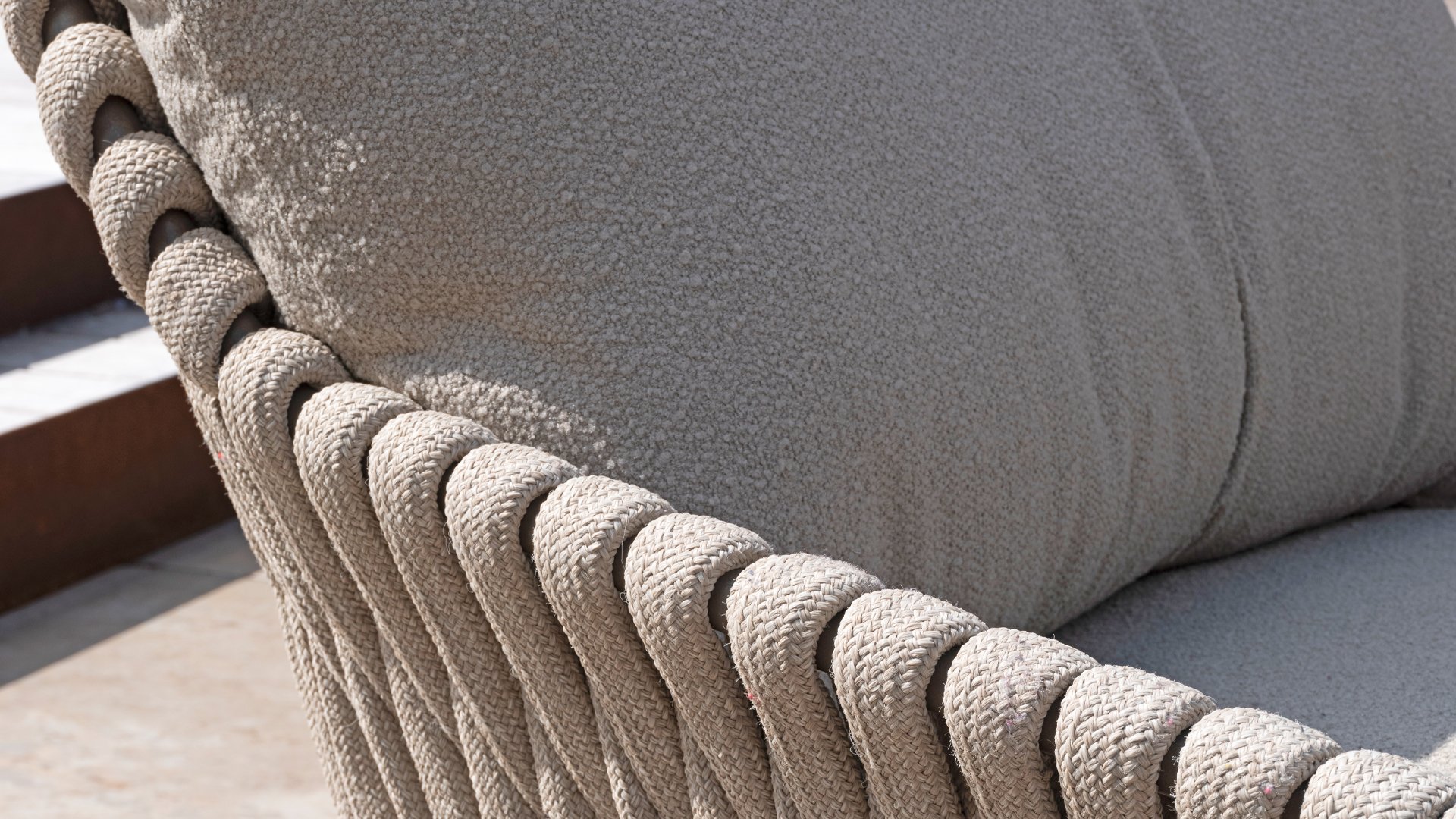 Der Sitz ist aus Seilgewebe gefertigt, das nicht nur stilvoll, sondern auch wetterfest ist, wodurch der Stuhl perfekt für den Gebrauch im Garten ist. Der Rahmen besteht aus pulverbeschichtetem Stahl/Aluminium in der Farbe Terre, zusammen mit Taupe-Bouclé-Kissen und Clay-farbenem Seilgewebe bietet ein stimmiges und elegantes Gesamtbild. Neben dem Gartenstuhl gibt es auch eine Lounge-Variante des Montera, die ideal für entspannte Momente im Freien ist.