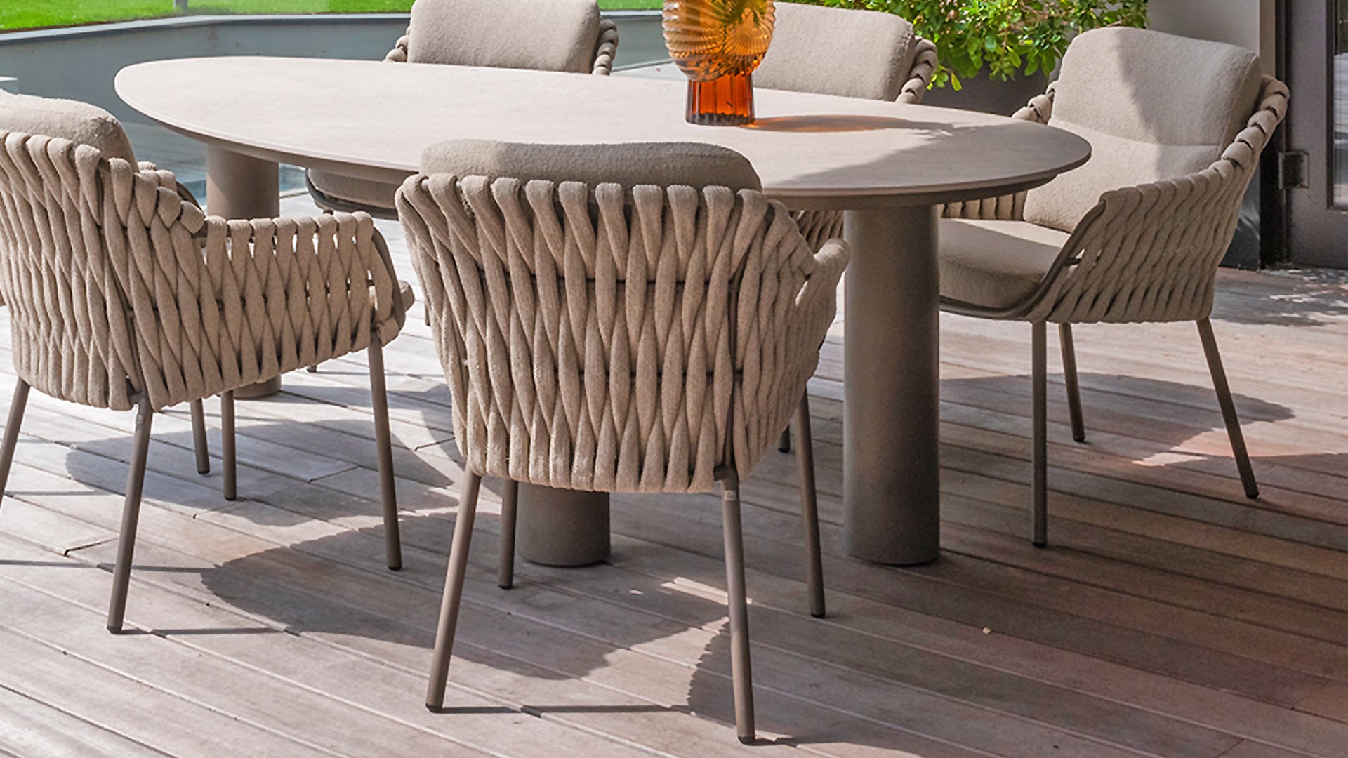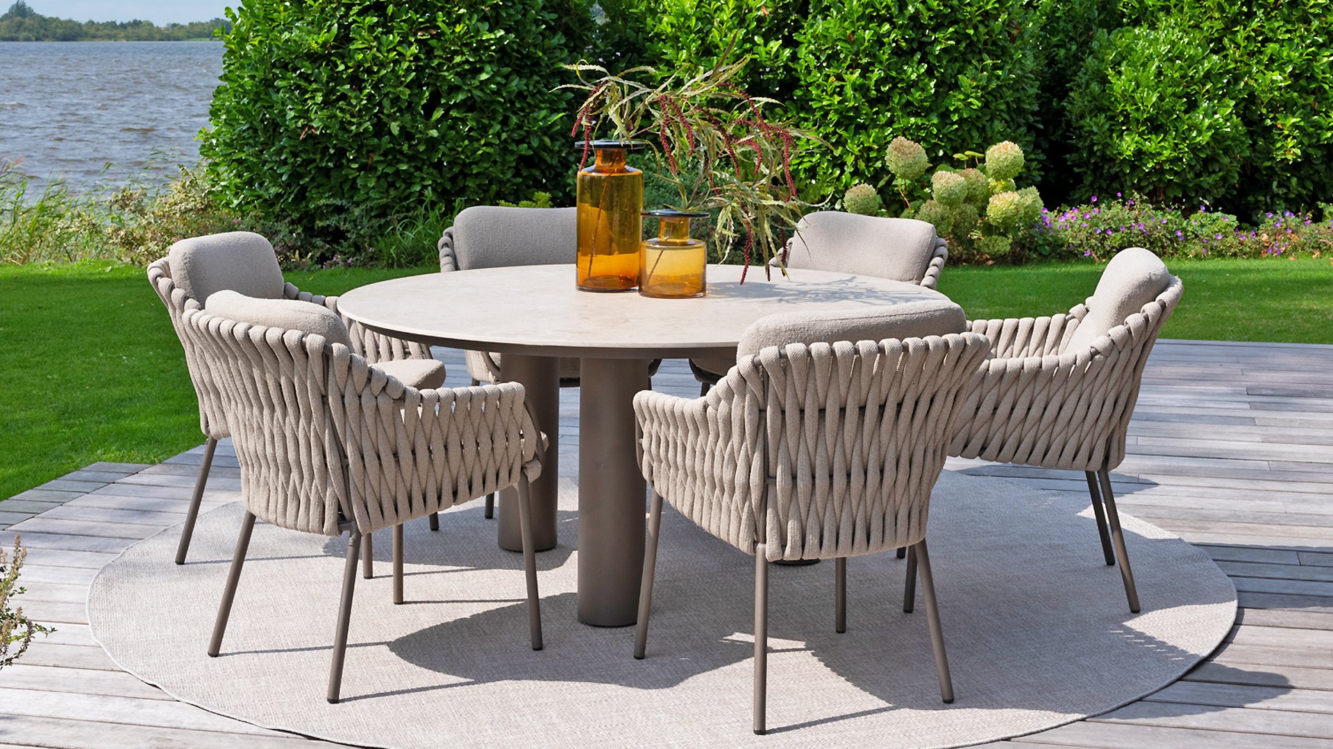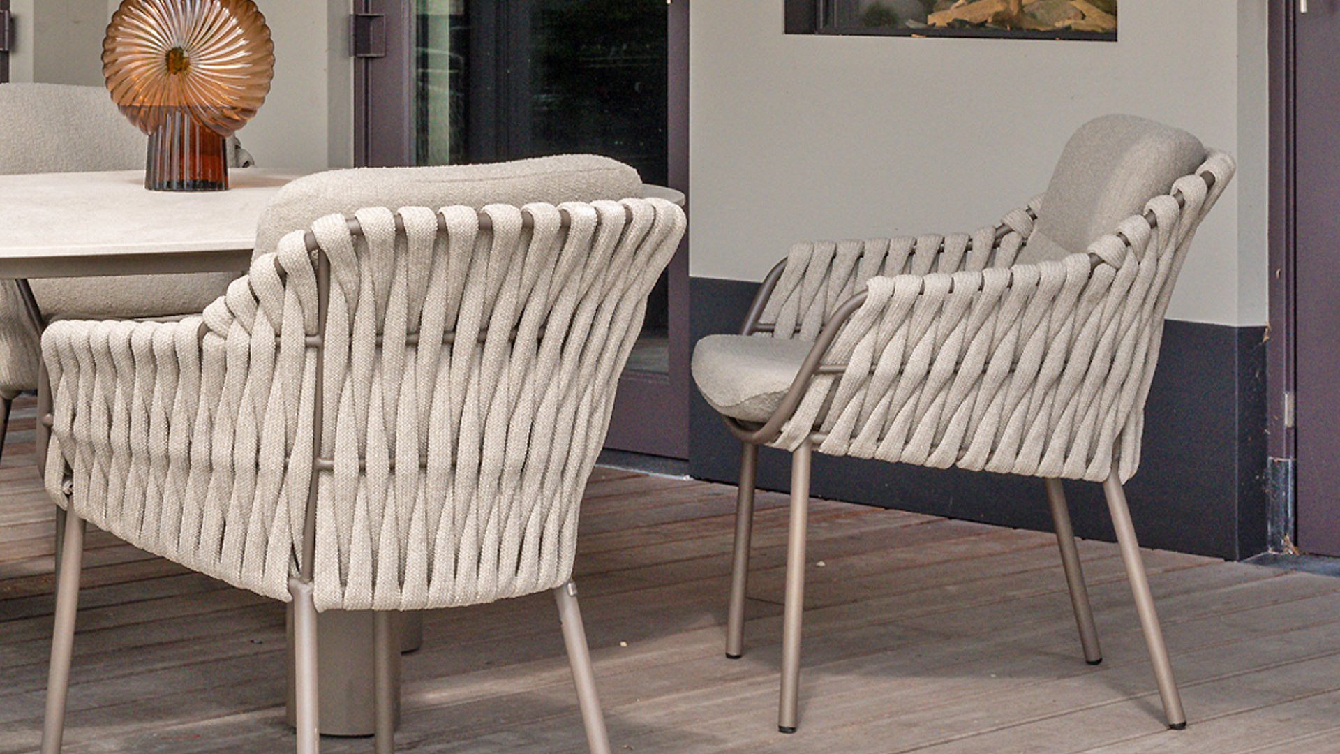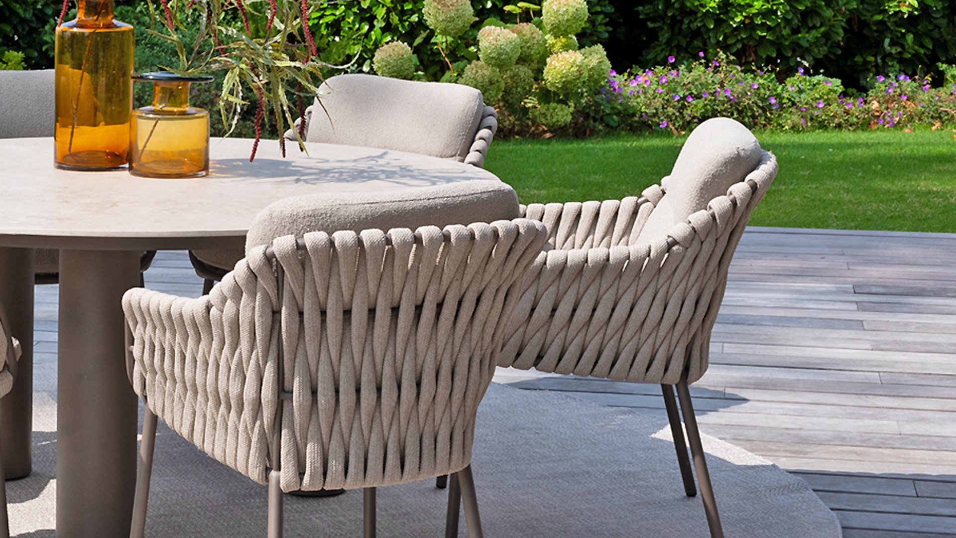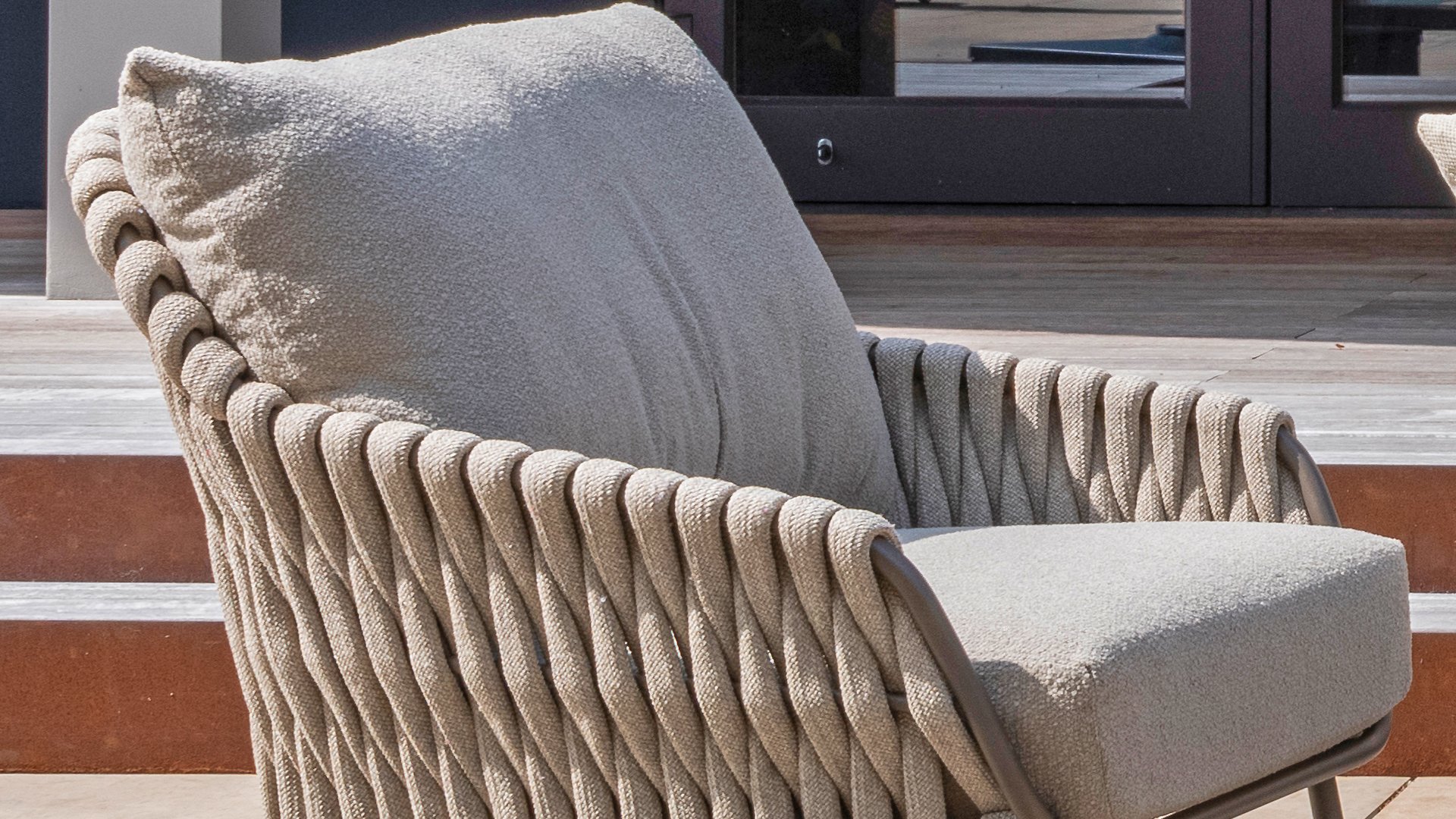 Der Sitz ist aus Seilgewebe gefertigt, das nicht nur stilvoll, sondern auch wetterfest ist, wodurch der Stuhl perfekt für den Gebrauch im Garten ist. Der Rahmen besteht aus pulverbeschichtetem Stahl/Aluminium in der Farbe Terre, zusammen mit Taupe-Bouclé-Kissen und Clay-farbenem Seilgewebe bietet ein stimmiges und elegantes Gesamtbild. Neben dem Gartenstuhl gibt es auch eine Lounge-Variante des Montera, die ideal für entspannte Momente im Freien ist.