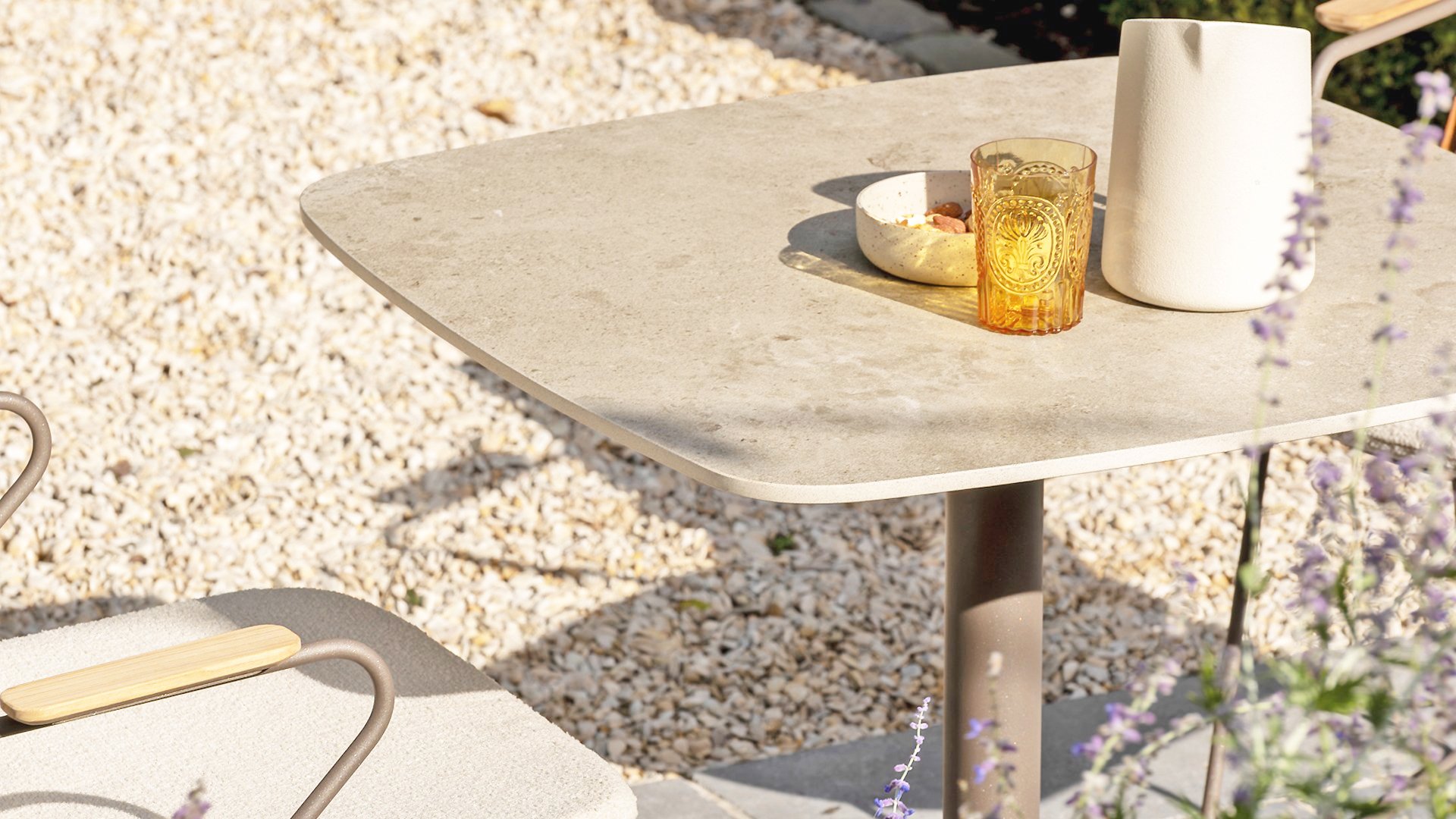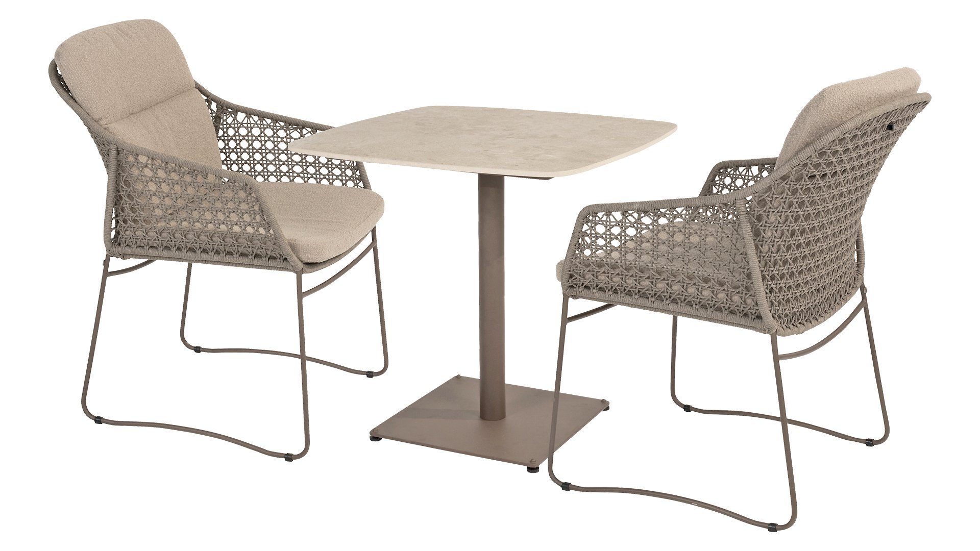 Dieser 75x75cm große Tisch verfügt über eine elegante Keramikplatte, die sowohl stilvoll als auch praktisch ist. Die Keramik ist nicht nur langlebig und leicht zu reinigen, sondern bietet auch eine luxuriöse Optik. Die Basis ist in einem warmen, erdigen Farbton namens Terre gehalten, der perfekt zu modernen und rustikalen Innenräumen/Gärten passt.