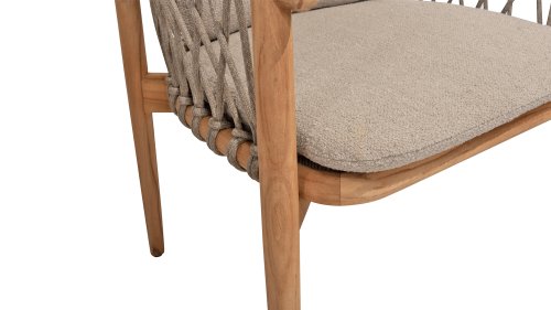 Die 4 Seasons Outdoor Nora ist eine stilvolle und komfortable Ergänzung für Ihren Außenbereich. Hergestellt aus strapazierfähigem Teakholz und mit einem eleganten Seilzug, bietet dieser Stuhl nicht nur ein schönes Aussehen, sondern auch eine stabile Konstruktion. Die Kissen sind mit Olefin bezogen und mit einem trendigen Bouclé-Bezug veredelt, der ein luxuriöses Gefühl und Komfort bietet.