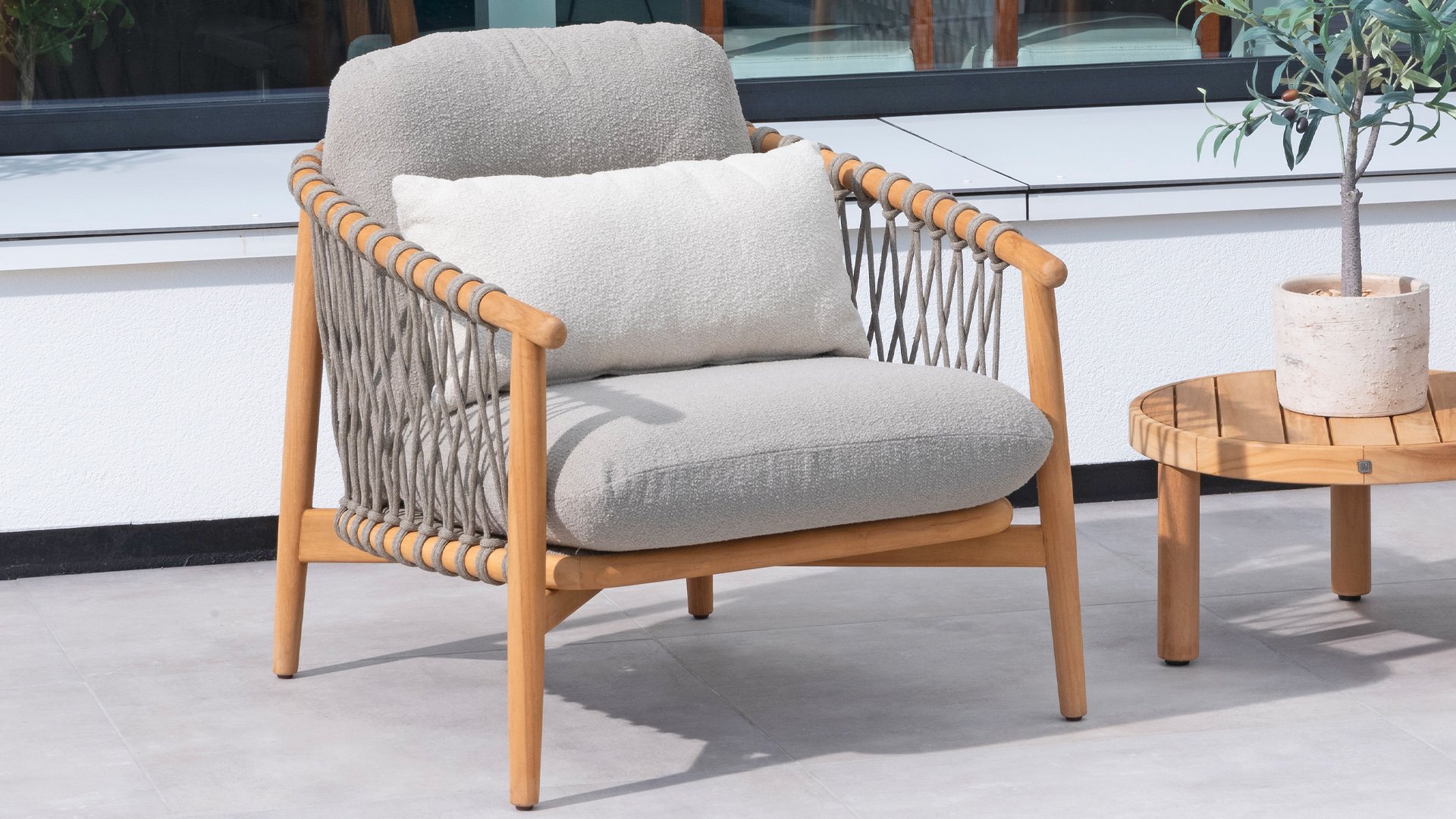 4Seasons Nora Lounge:Entdecken Sie die perfekte Kombination aus Stil und Komfort mit der Nora Lounge von 4 Seasons Outdoor. Dieses Loungeset ist ein wunderschönes Beispiel für Design bis ins Detail, bei dem alle Leidenschaft in die Nora Lounge Serie einfließt. Der Teakholzrahmen mit eleganten Rundungen wird durch auffällige Rope-Muster hervorgehoben, was diesen Stuhl zu einem echten Blickfang in Ihrem Außenbereich macht.