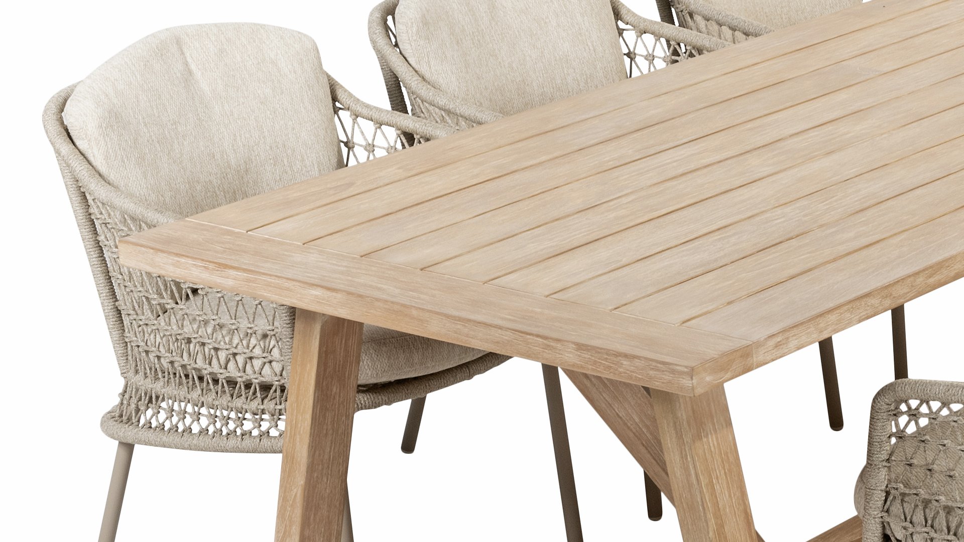 Gartenmöbel aus Teakholz bieten einen atemberaubenden Blick.Teakholz eignet sich besonders gut für den Einsatz im Außenbereich. Es ist resistent gegen Schädlinge und Pilze und widerstandsfähig gegen Sonne, Regen und Schnee. Mit der Zeit entwickelt das Teakholz eine silbergraue Patina. Gartenmöbel aus Teakholz bieten einen atemberaubenden Blick. Darüber hinaus ist es starkes Material und erfordert nur wenig Wartung. Wer die ursprüngliche Farbe des Teakholzes bevorzugt, kann durch regelmäßiges benutzen unser Pflegemittel ganz einfach das Vergrauen des Holzes verhindern.Darüber hinaus können Sie Teak mit grüner Seife reinigen. Durch Temperaturunterschiede und durch den Wechsel von Feuchtigkeit und Trockenheit können kleine Haarrisse entstehen. Es ist üblich, dass Man in dies Unvollkommenheiten findet, diese Unregelmäßigkeiten sind kennzeichnend für dieses Produkt. Diese Unregelmäßigkeiten können nie einen Anlass zu Reklamation, Garantie oder Claim formen. Es betrifft eine Unterschrift von Originalität! Wir gewähren Garantie auf alle Produktions- und Konstruktionsfehler. Die Wirkung von Teakholz ist nicht enthalten. Wenn Sie sich für Teakholz entscheiden, erwarten wir, dass Sie diese Eigenschaften zu schätzen wissen. Eventuell auftretende Haarrisse, Äste im Teakholz und raue Oberflächen im Laufe der Zeit fallen nicht unter unsere Garantie. Diese Eigenschaften verleihen dem Teakholz seinen eigenen Charakter und sind Teil der Optik. Seien Sie vorsichtig mit einem Blumentopf oder einer Vase auf Ihrem Gartentisch aus Teakholz, da dies zu hartnäckigen Kreisen oder Farbunterschieden führen kann.