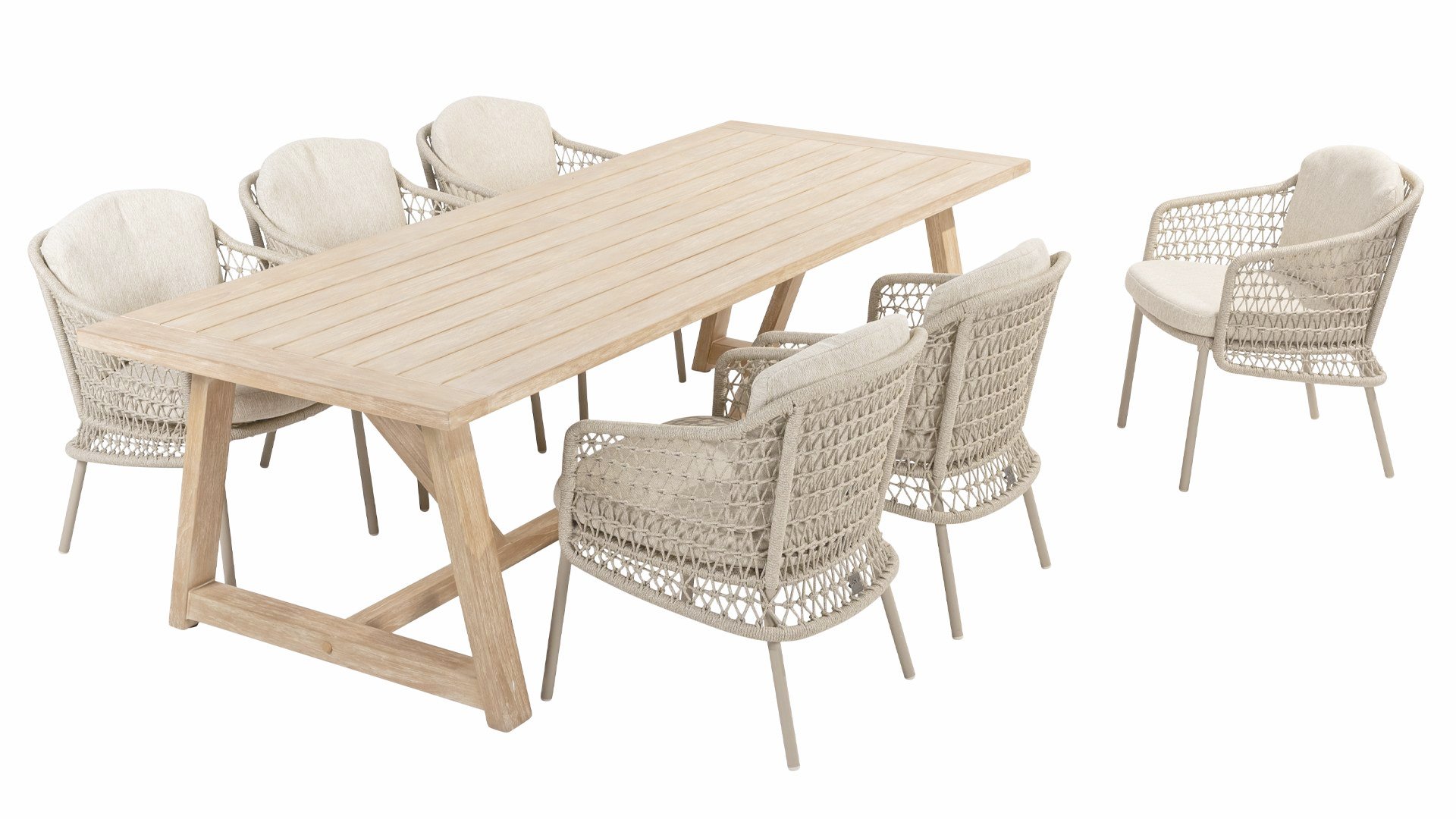 Der Noah-Tisch aus gebürstetem Teakholz von Taste 4SO ist ein robuster Tisch, der Eleganz ausstrahlt. Das Teakholz ist gebürstet, was bedeutet, dass es eine raue, natürliche Oberfläche mit leichten Akzenten in den Rillen hat. Dieses Finish verleiht dem Tisch ein einzigartiges Aussehen. Die Größe 260 bietet ausreichend Sitzfläche an diesem Tisch. Der Noah-Tisch ist auch im normalen Teakholz-Finish und mit einem Edelstahlgestell erhältlich.