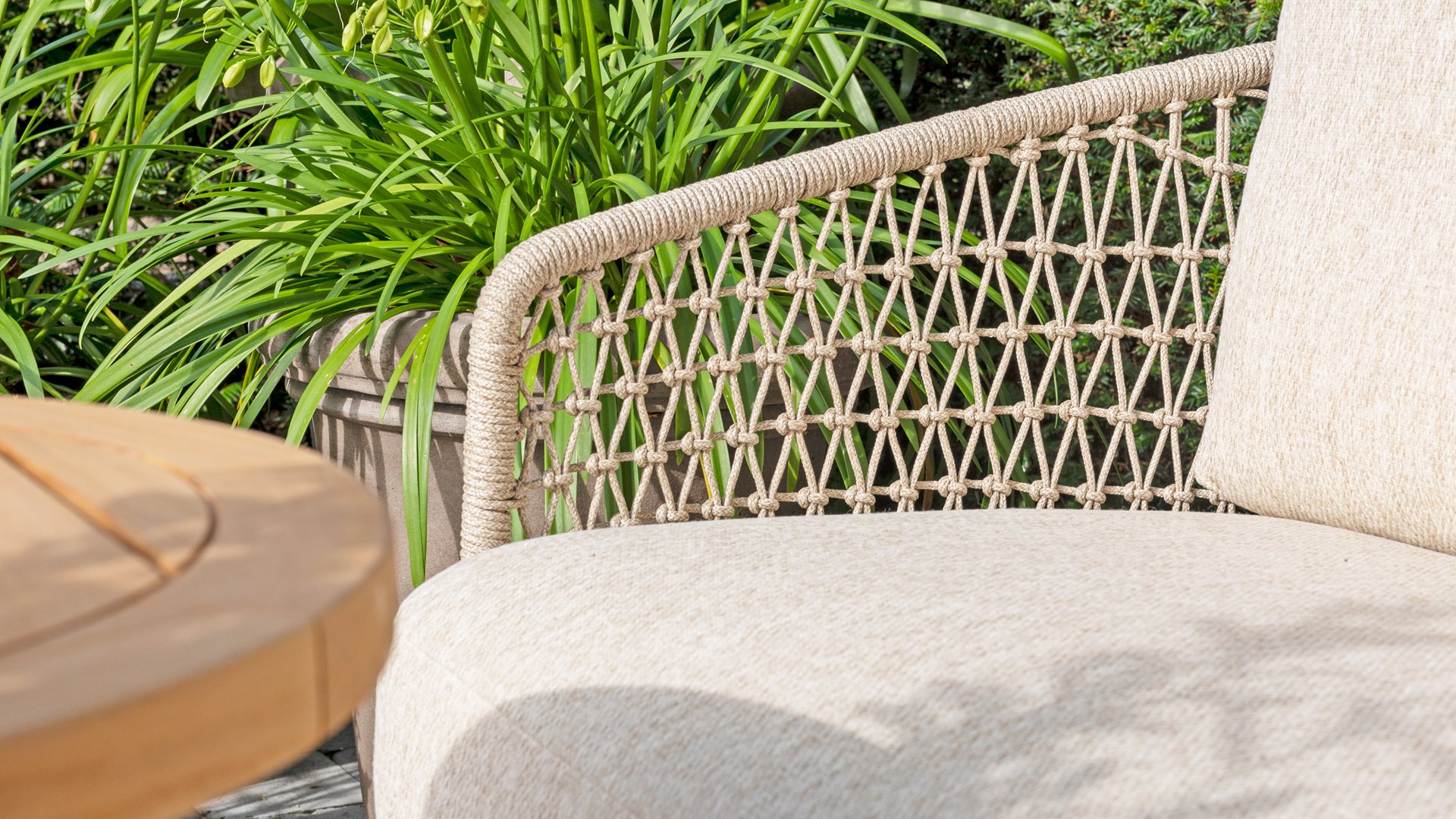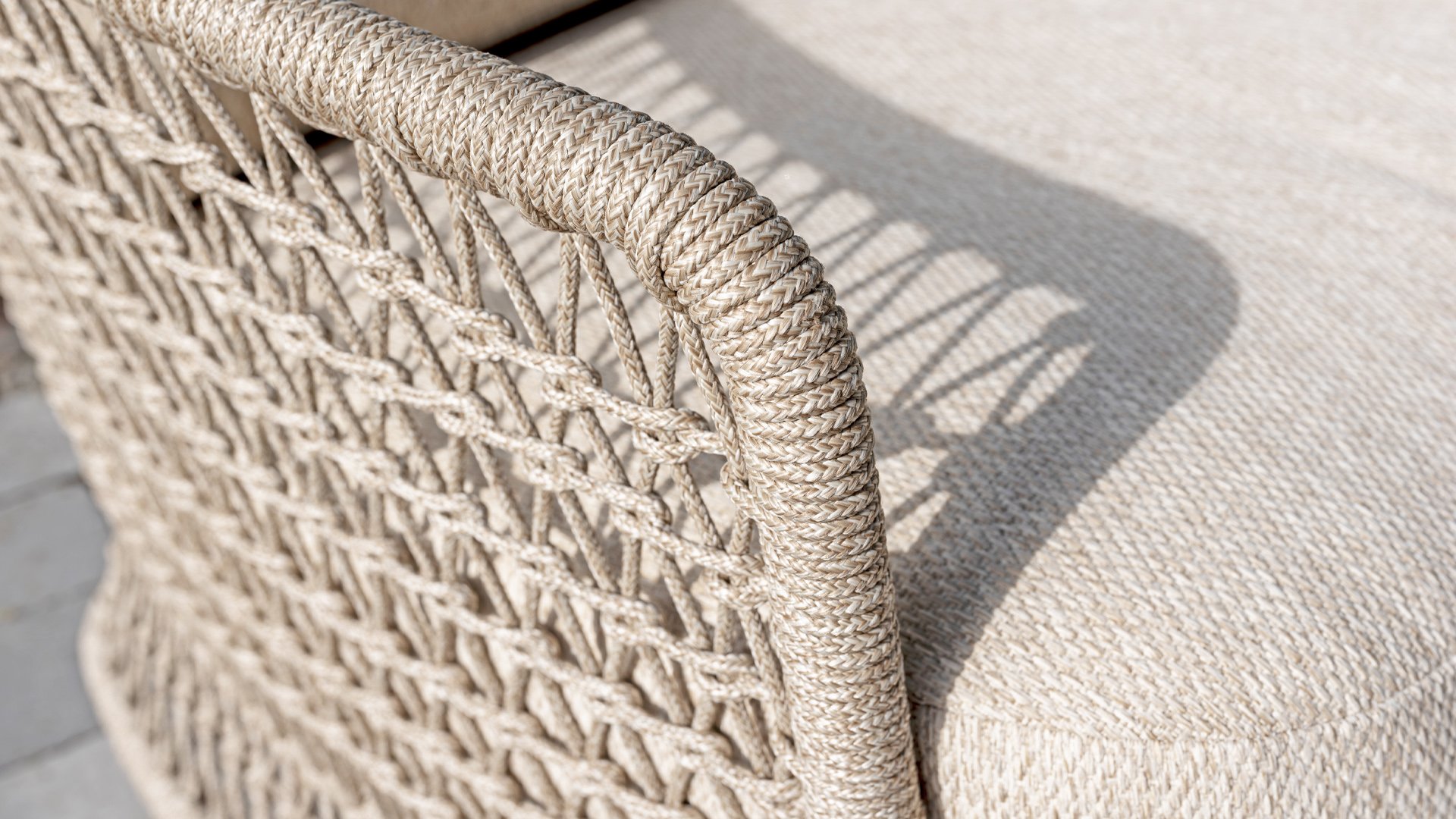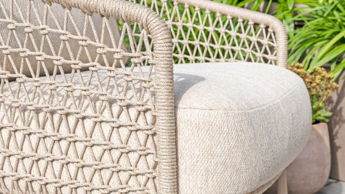 Dieses wunderschöne Material eignet sich perfekt für den Außenbereich, denn Rope ist nicht nur eine normale Spitze, an der Sie Ihre Schuhe binden können. Unsere runden Fäden sind mit einem Kunststoffkern versehen. Diese Basis aus Polypropylen sorgt dafür, dass sich das Rope minimal dehnt und sie nimmt außerdem keine Feuchtigkeit auf. Die Umhüllung besteht aus Acrylstoff, der mit dem wetterfesten Stoff unserer Gartenkissen vergleichbar ist. Diese Umhüllung fühlt sich weich an und ist sehr wasserabweisend, UV-beständig und farbecht. Die flachen Rope-Varianten besitzen den gleichen wetterfesten Materialmix, doch das Polypropylen-Material wurde hier mit dem Acryl-Stoff verwebt. Durch diese Technik besitzt das flache Rope die gleichen Eigenschaften, hat jedoch eine ganz andere Ausstrahlung.