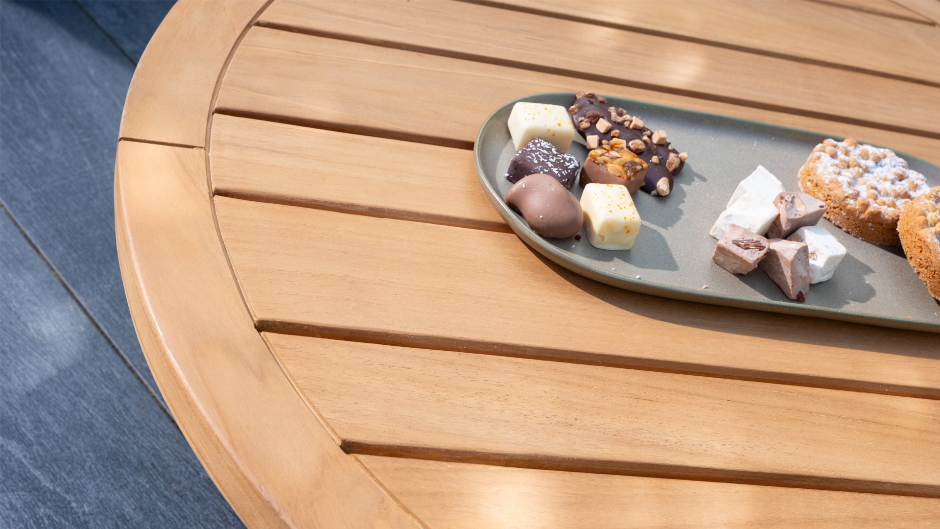 Gartenmöbel aus Teakholz bieten einen atemberaubenden Blick.Teakholz eignet sich besonders gut für den Einsatz im Außenbereich. Es ist resistent gegen Schädlinge und Pilze und widerstandsfähig gegen Sonne, Regen und Schnee. Mit der Zeit entwickelt das Teakholz eine silbergraue Patina. Gartenmöbel aus Teakholz bieten einen atemberaubenden Blick. Darüber hinaus ist es starkes Material und erfordert nur wenig Wartung. Wer die ursprüngliche Farbe des Teakholzes bevorzugt, kann durch regelmäßiges benutzen unser Pflegemittel ganz einfach das Vergrauen des Holzes verhindern.Darüber hinaus können Sie Teak mit grüner Seife reinigen. Durch Temperaturunterschiede und durch den Wechsel von Feuchtigkeit und Trockenheit können kleine Haarrisse entstehen. Es ist üblich, dass Man in dies Unvollkommenheiten findet, diese Unregelmäßigkeiten sind kennzeichnend für dieses Produkt. Diese Unregelmäßigkeiten können nie einen Anlass zu Reklamation, Garantie oder Claim formen. Es betrifft eine Unterschrift von Originalität!  Wir gewähren Garantie auf alle Produktions- und Konstruktionsfehler. Die Wirkung von Teakholz ist nicht enthalten. Wenn Sie sich für Teakholz entscheiden, erwarten wir, dass Sie diese Eigenschaften zu schätzen wissen. Eventuell auftretende Haarrisse, Äste im Teakholz und raue Oberflächen im Laufe der Zeit fallen nicht unter unsere Garantie. Diese Eigenschaften verleihen dem Teakholz seinen eigenen Charakter und sind Teil der Optik. Seien Sie vorsichtig mit einem Blumentopf oder einer Vase auf Ihrem Gartentisch aus Teakholz, da dies zu hartnäckigen Kreisen oder Farbunterschieden führen kann.