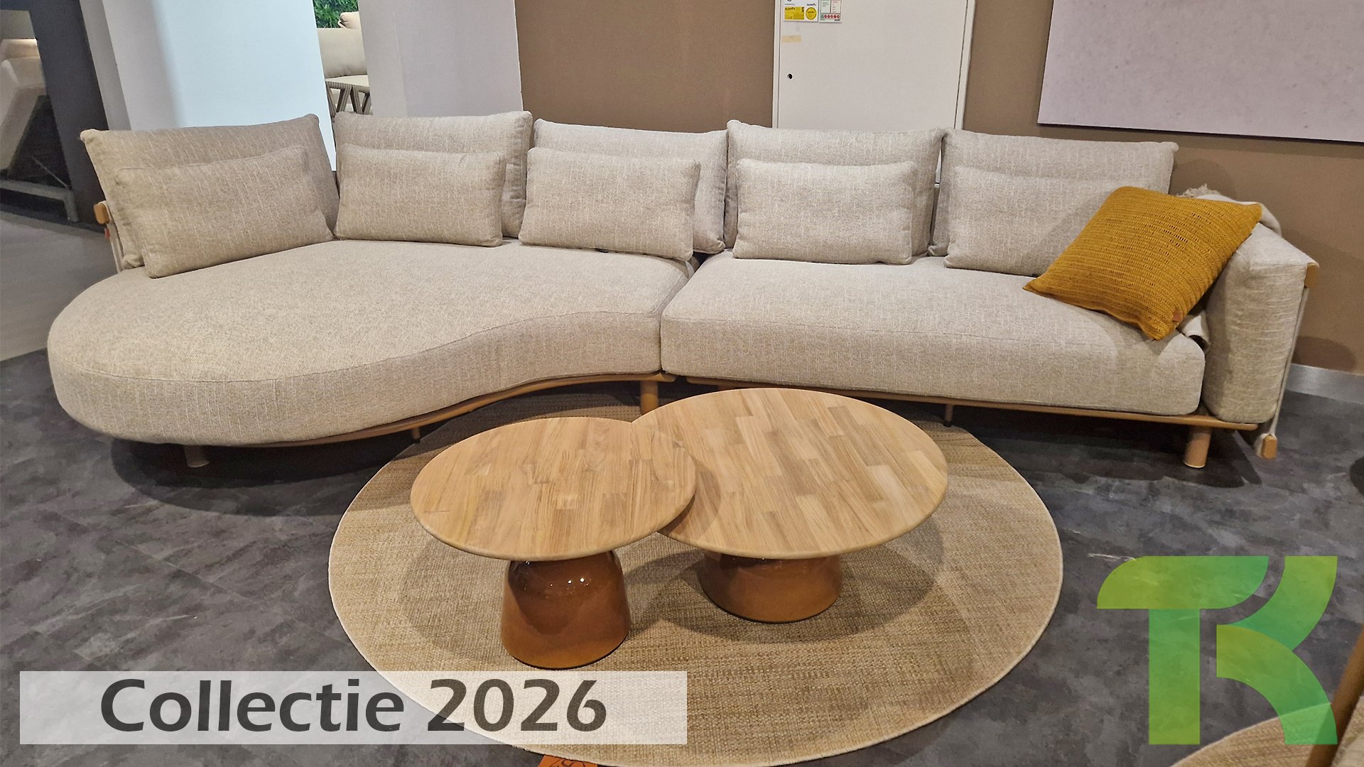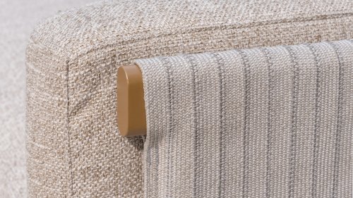 * Harmonische Farbpalette mit weichen, sandfarbenen Kissen.