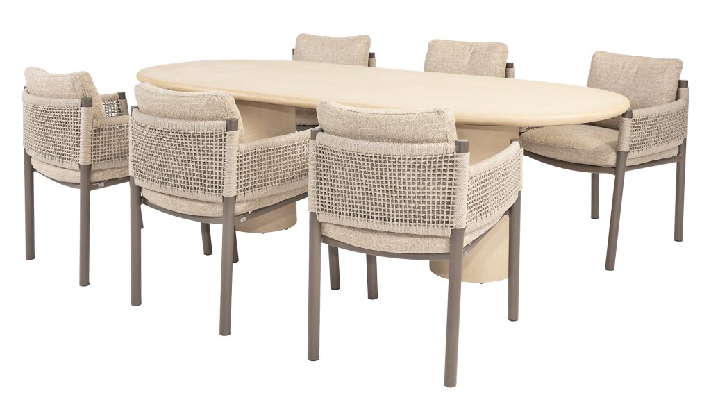 Entdecken Sie Hampton: die perfekte Balance zwischen raffinierter Eleganz und robuster Schlichtheit. Dieser wunderschöne Gartentisch in stilvollem Beige/Weiß strahlt Ruhe und Luxus aus und ist das Herzstück jedes Außenbereichs – vom gemütlichen Abendessen bis zum langen Sommerabend mit Freunden und Familie. Der Hampton ist aus hochwertigem Mortex gefertigt, einem langlebigen und wasserfesten Material, das für seine natürliche Optik und außergewöhnliche Wetterbeständigkeit bekannt ist. Jede Tischplatte wird von Hand bearbeitet und schafft so einen einzigartigen, warmen Look, der sowohl moderne als auch mediterrane Gärten perfekt ergänzt. Der Tisch ist in verschiedenen Größen erhältlich, sodass Sie immer den passenden Hampton für Ihren Außenbereich finden. Wählen Sie die runde Version mit Ø160cm für eine gemütliche Atmosphäre mit einem einzelnen, eleganten Mittelbein oder die großzügigen ovalen Versionen mit 240cm oder 300cm. Beide verfügen über zwei schlanke, vertikale Beine, die für Stabilität und ein markantes, geradliniges Design sorgen. Für alle, die ein entspannteres Essen bevorzugen, gibt es auch eine Low-Dining Version Ø160cm, ideal für entspannte Momente im Lounge-Stil.