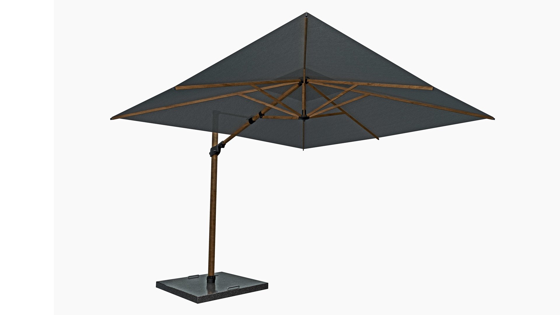 Jeder Ampelschirm von 4Seasons Outdoor kann auf dem Sockel gedreht und nach hinten gekippt werden, um die tief stehende Sonne aufzufangen.