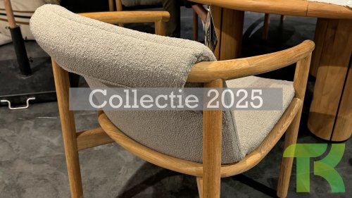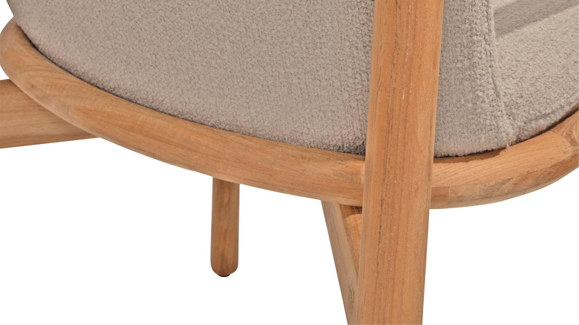 - Stilvolles und zeitloses Design: Die Kombination aus Teakholz und taupefarbenem Bouclé schafft eine elegante, beruhigende Atmosphäre in jedem Garten.