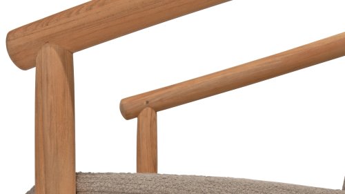 Das Kissen des Stuhls ist aus Olefin gefertigt und in Bouclé-Optik für mehr Eleganz gewebt. Das taupefarbene Kissen fügt einen beruhigenden, neutralen Farbton hinzu, der gut zum natürlichen Aussehen des Teakholzrahmens passt. Das Kissen ist an 4 Punkten am Teakholzrahmen festgemacht.