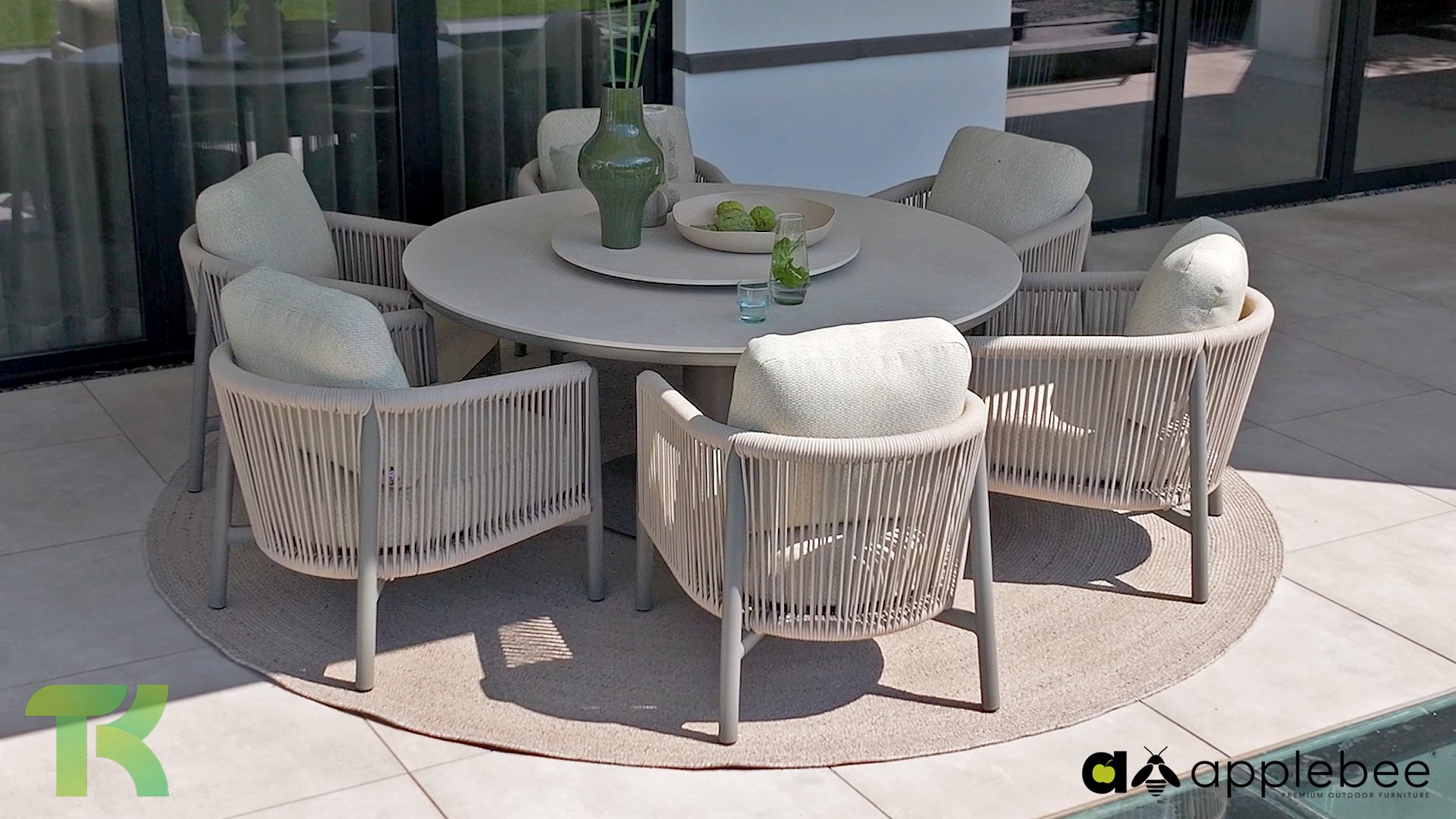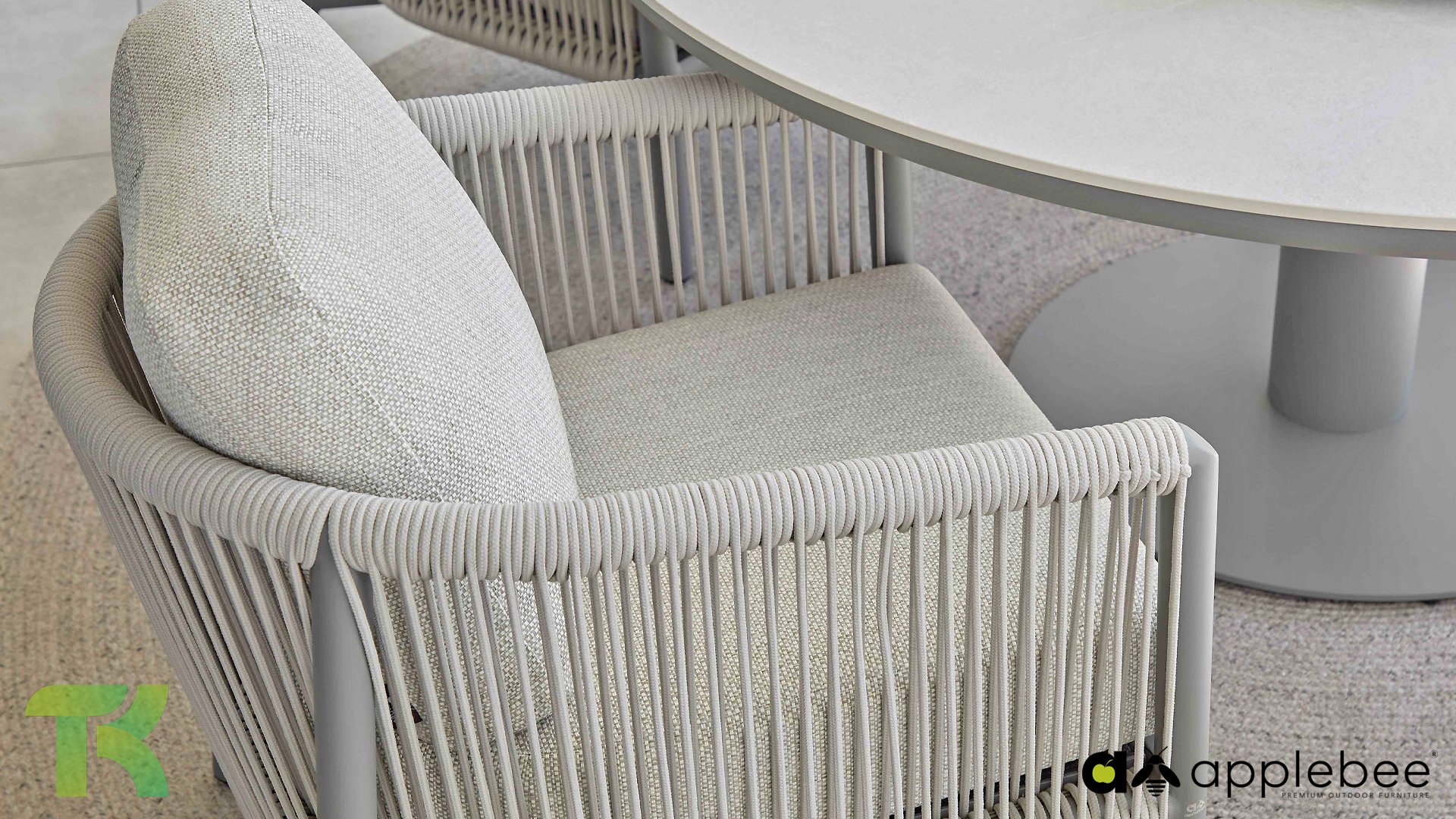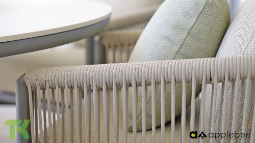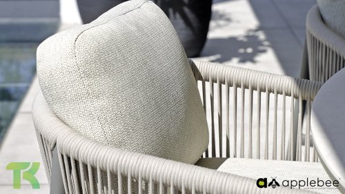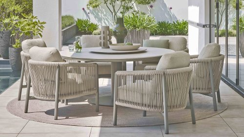 Die leicht geschwungene Form des Gestells bietet in Kombination mit den großzügig gepolsterten Kissen hervorragende Unterstützung für Rücken und Arme und ermöglicht stundenlanges, bequemes Sitzen. Der passende niedrige Esstisch rundet das Ensemble ab und ist aus taupefarbenem Aluminium mit einer Tischplatte aus weißer Travertin-Keramik gefertigt: pflegeleicht und dennoch hochwertig und elegant.