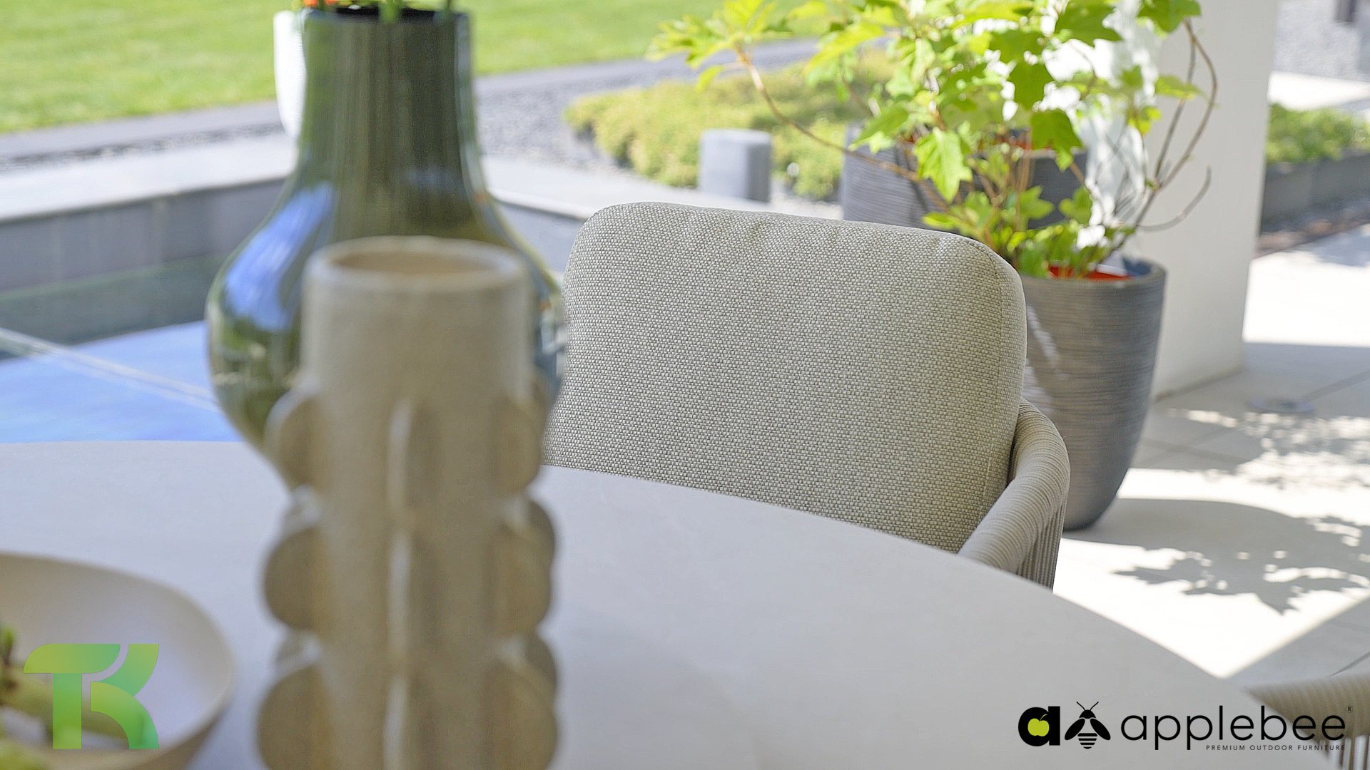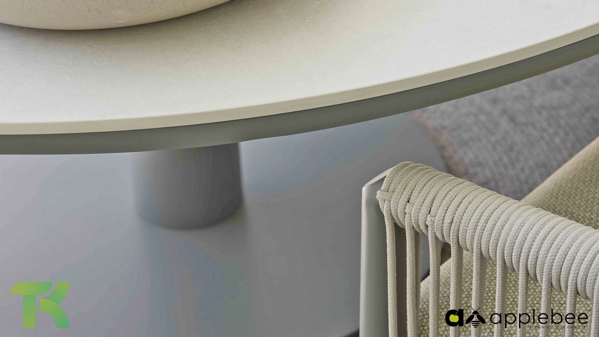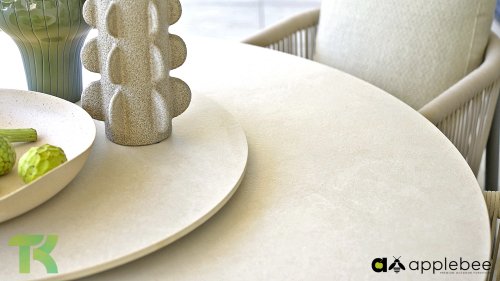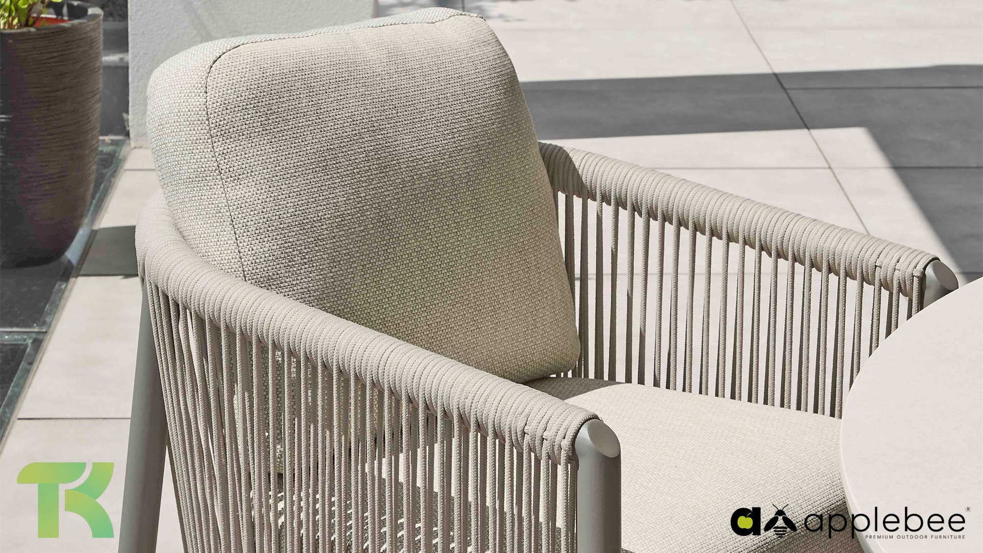 Die leicht geschwungene Form des Gestells bietet in Kombination mit den großzügig gepolsterten Kissen hervorragende Unterstützung für Rücken und Arme und ermöglicht stundenlanges, bequemes Sitzen. Der passende niedrige Esstisch rundet das Ensemble ab und ist aus taupefarbenem Aluminium mit einer Tischplatte aus weißer Travertin-Keramik gefertigt: pflegeleicht und dennoch hochwertig und elegant.