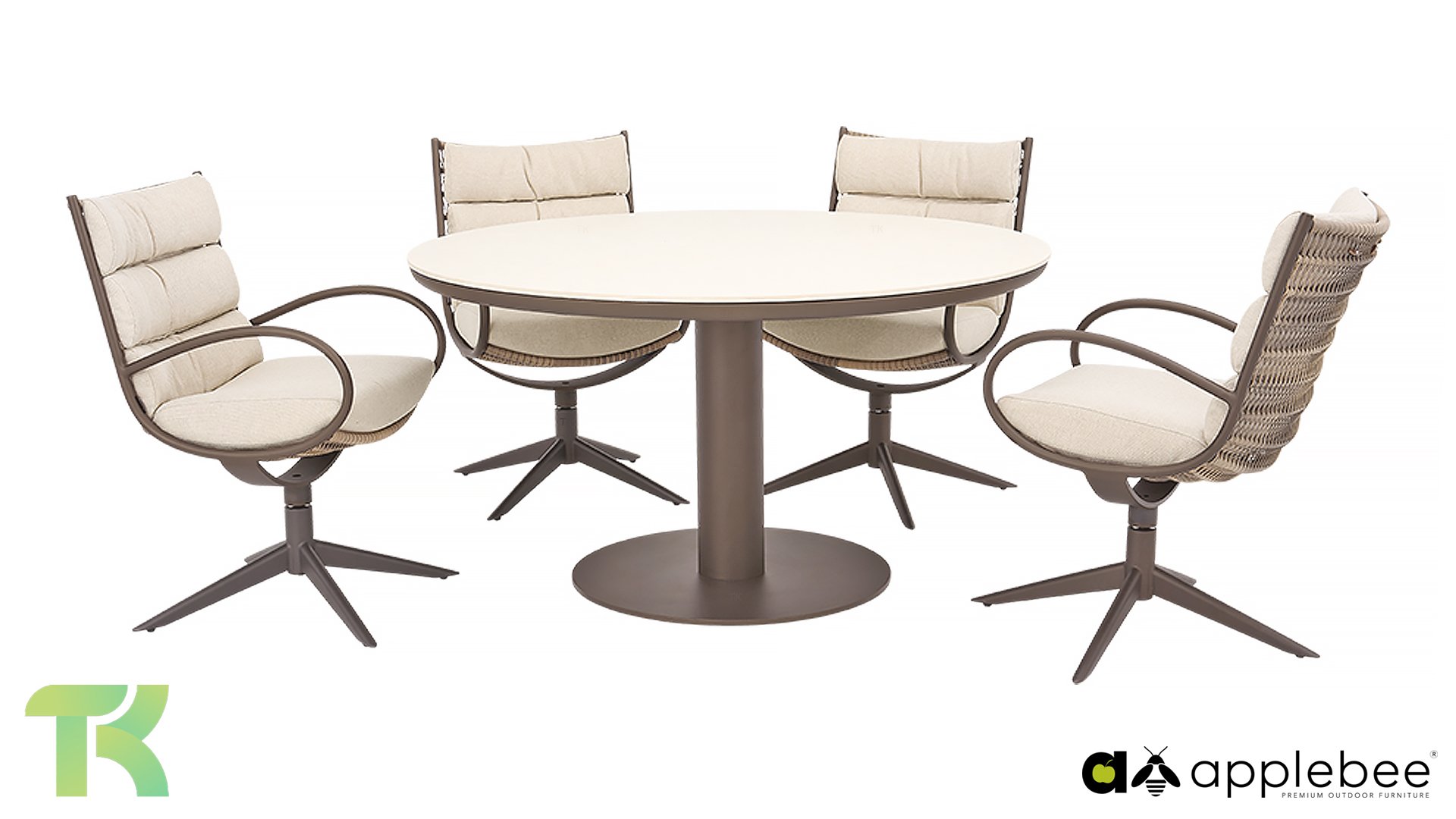 Die Esszimmerstühle sind drehbar. Das bedeutet, dass sich die Sitzfläche sanft drehen lässt, sodass Sie sich mühelos Ihrem Gesprächspartner oder der Sonne zuwenden können, ohne zu verrutschen. Die Essgruppe wird mit Kissen in der Farbe Nature geliefert. Dank der speziellen BeeWett-Technologie von Apple Bee sind diese Kissen feuchtigkeitsregulierend, trocknen schnell nach einem Regenschauer und sind UV-beständig. Die Camp Bay ist auch in der Farbe Oyster erhältlich.