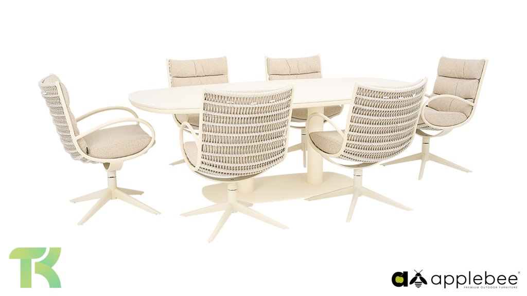Die Esszimmerstühle sind drehbar. Das bedeutet, dass sich die Sitzfläche leicht drehen lässt, sodass Sie sich mühelos Ihrem Gesprächspartner oder der Sonne zuwenden können, ohne zu verrutschen. Die Gruppe ist mit Kissen in der warmen Farbe Cotton Flower ausgestattet. Dank der speziellen BeeWett-Technologie von Apple Bee sind diese Kissen feuchtigkeitsregulierend, trocknen schnell nach einem Regenschauer und sind UV-beständig. Die Camp Bay ist auch in Bronze erhältlich.