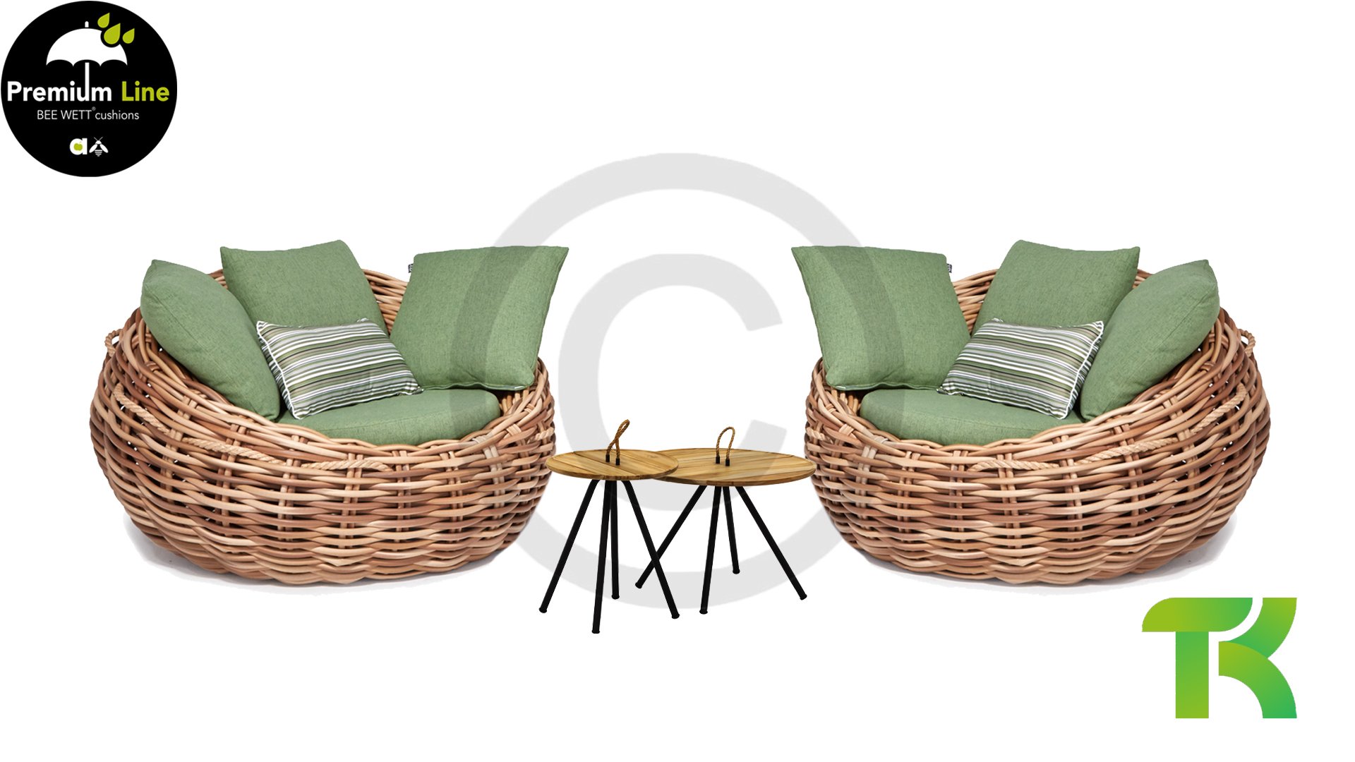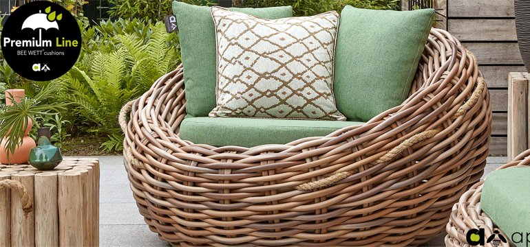 Applebee Cocoon ist inspiriert durch den sicheren Kokon, in dem sich eine Raupe geborgen fühlt und sich in einen wunderschönen Schmetterling verwandelt. Wunderschöne grüne Loungekissen – optional mit Bee-Wett®-Technologie – in Kombination mit dem außergewöhnlich dicken geflochtenen Biculair®-Flechtfaden in 20mm Stärke.