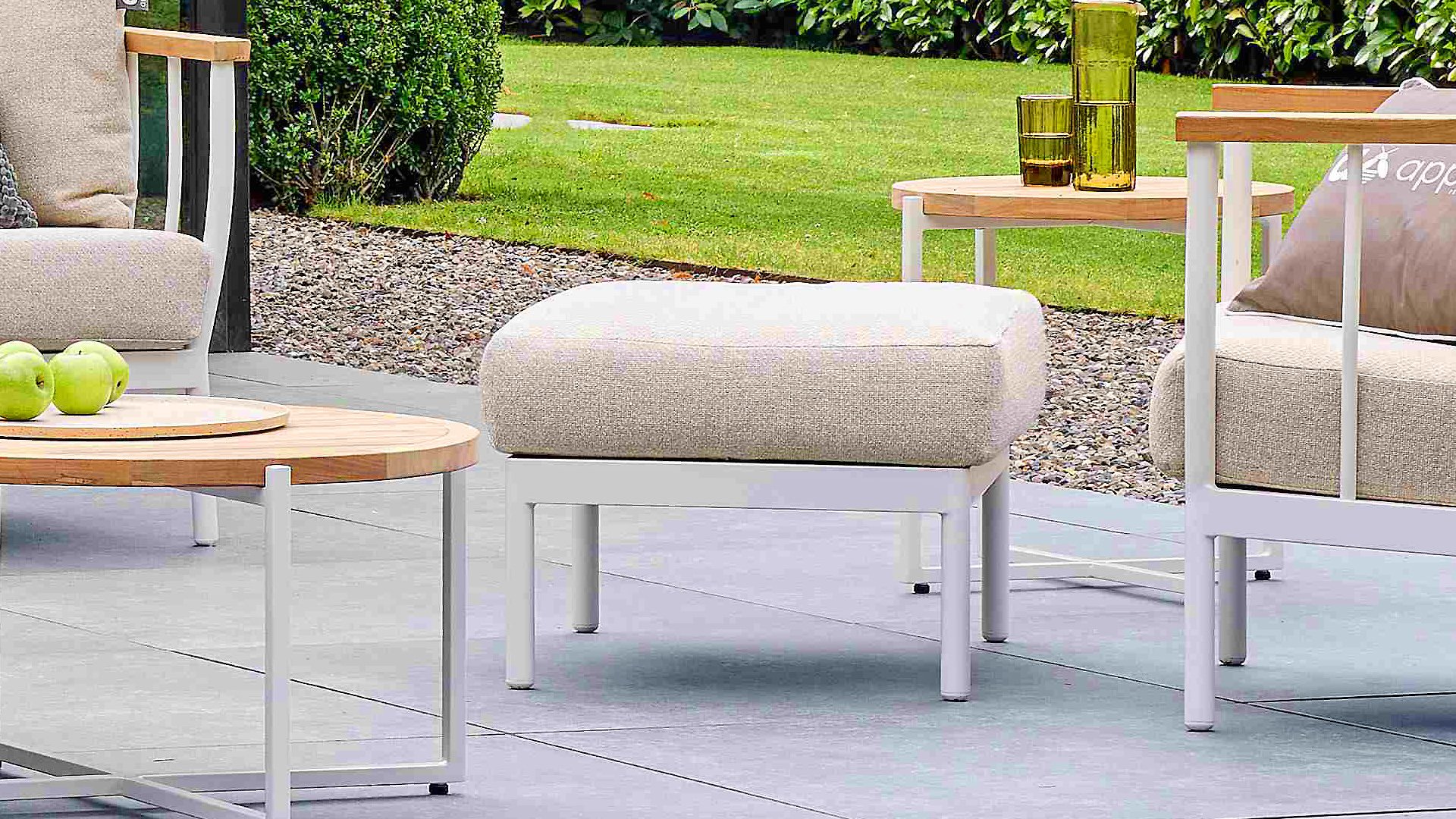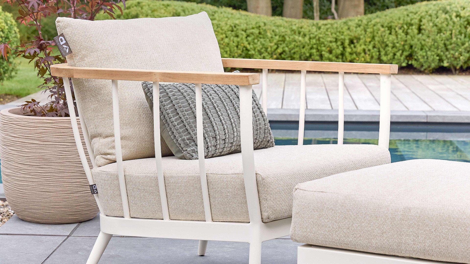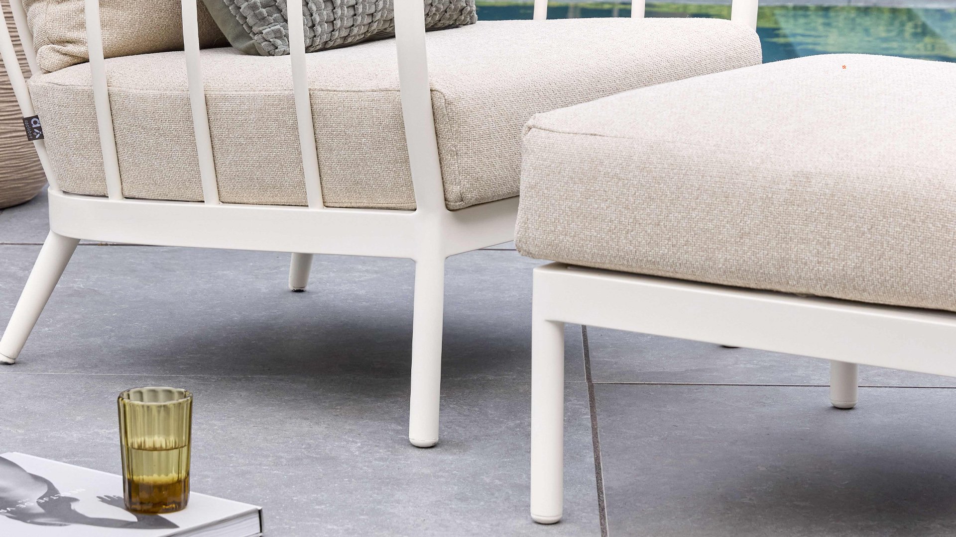 Die Apple Bee Condor Lounge Oyster hat ein klares, robustes Aussehen. Das Basismaterial ist Oyster-farbenes pulverbeschichtetes Aluminium. Die BEE WETT® Kissen haben eine grobe Webstruktur, aber mit einem weichen Griff.