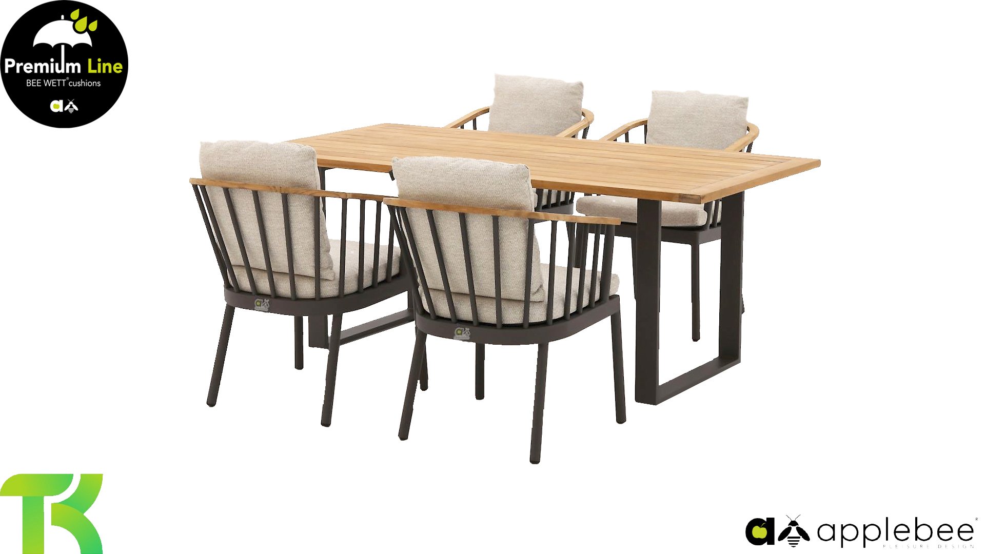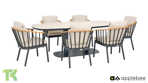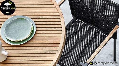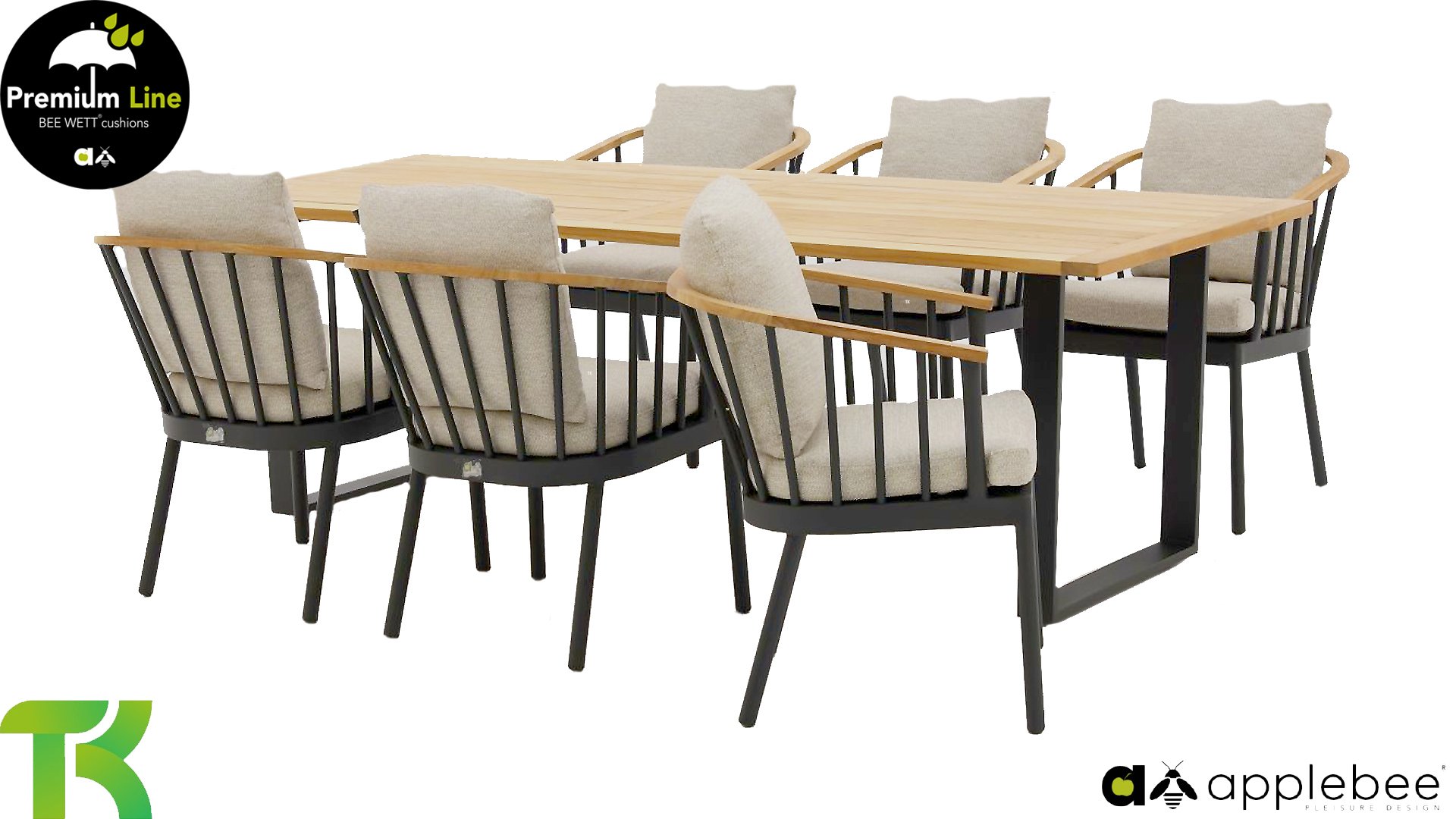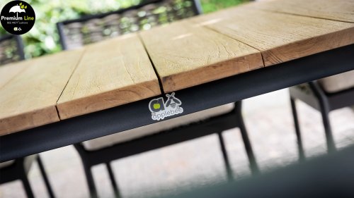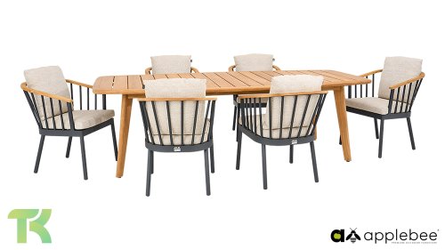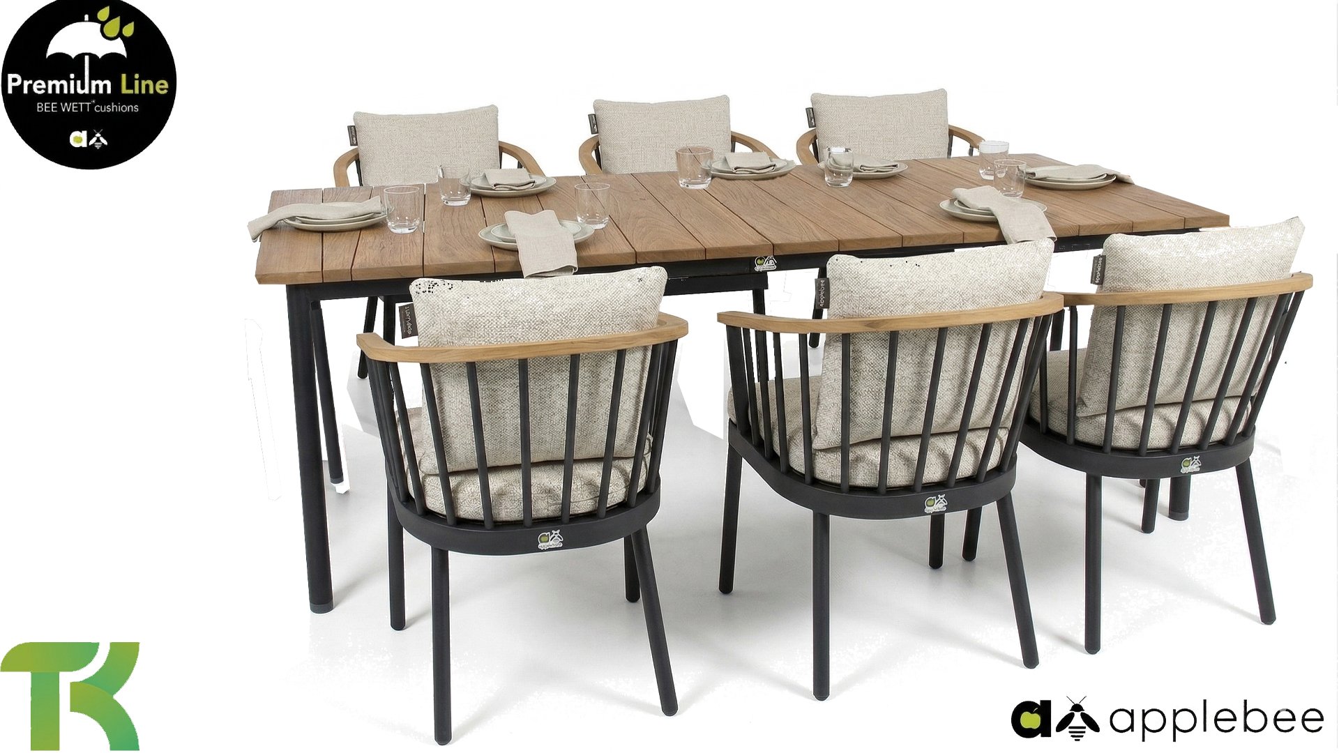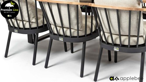 Apple Bee Condor Dining sieht elegant und cool aus. Dies wird sowohl auf den Stühlen als auch auf dem Tischgestell gezeigt. Das Basismaterial dieses Sets ist mattschwarz pulverbeschichtetes Aluminium, das in robusten Größen aufgetragen wird. Die BEE WETT®-Kissen haben eine grobe Webstruktur, aber einen weichen Griff für optimalen Komfort. Zusammen mit den schönen Kurven in der Rückenlehne und der Verwendung von natürlichem Teakholz für die Tischplatte und die Armlehnen hat der Condor immer noch die angenehme Atmosphäre eines natürlichen, warmen Aussehens.