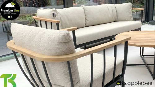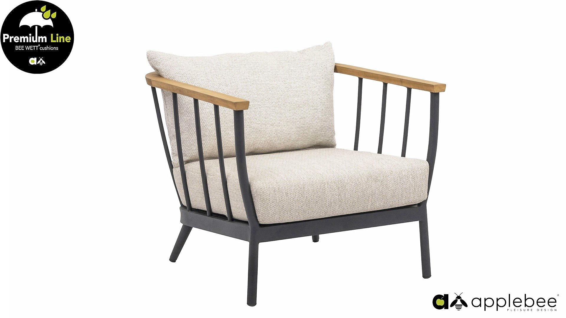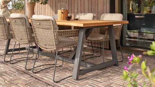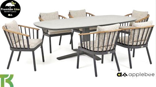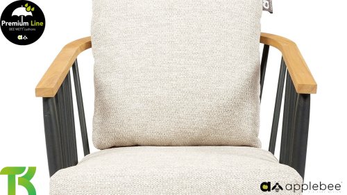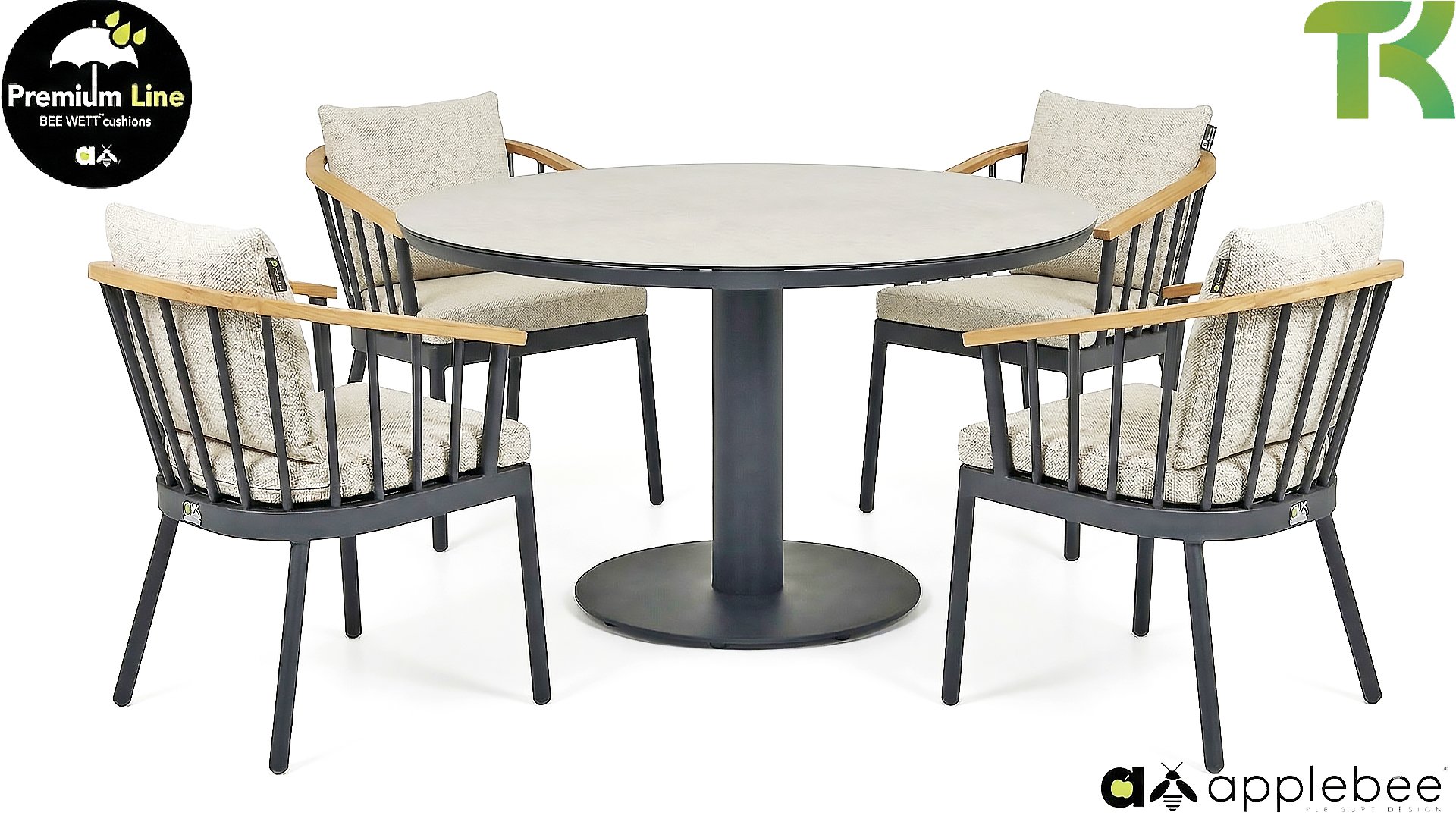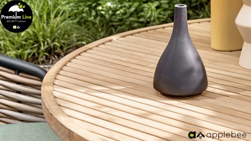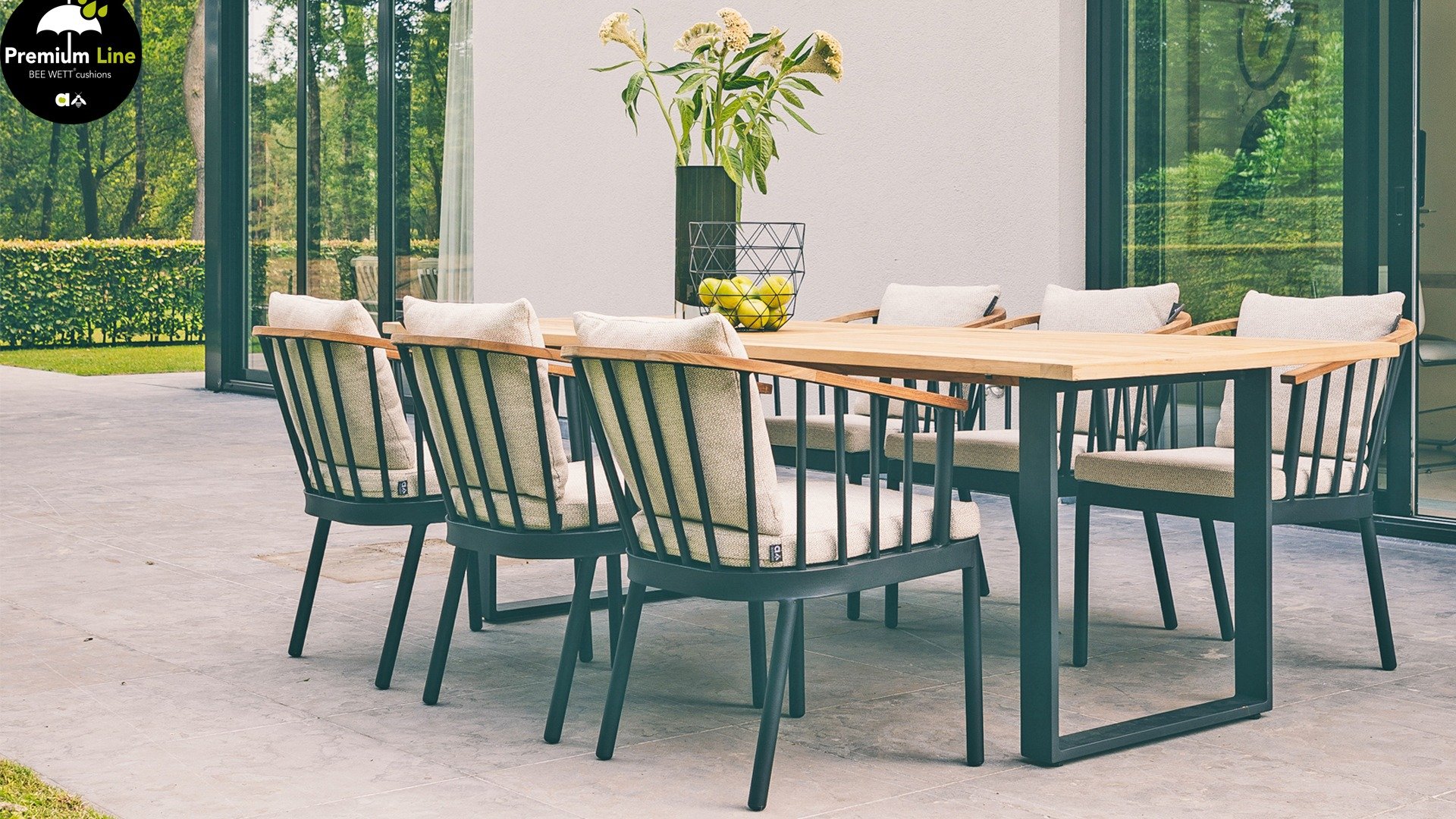 Apple Bee Condor Dining sieht elegant und cool aus. Dies wird sowohl auf den Stühlen als auch auf dem Tischgestell gezeigt. Das Basismaterial dieses Sets ist mattschwarz pulverbeschichtetes Aluminium, das in robusten Größen aufgetragen wird. Die BEE WETT®-Kissen haben eine grobe Webstruktur, aber einen weichen Griff für optimalen Komfort. Zusammen mit den schönen Kurven in der Rückenlehne und der Verwendung von natürlichem Teakholz für die Tischplatte und die Armlehnen hat der Condor immer noch die angenehme Atmosphäre eines natürlichen, warmen Aussehens.