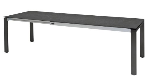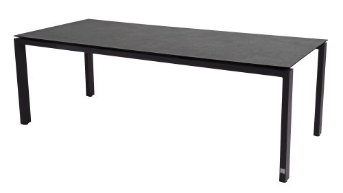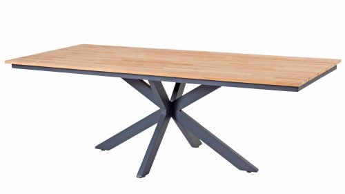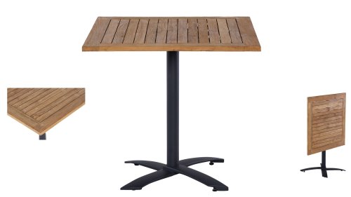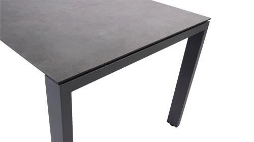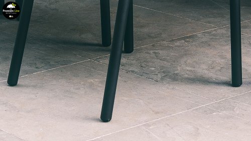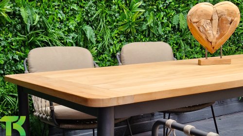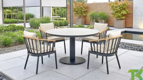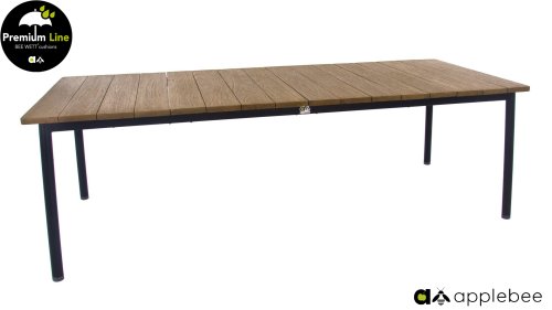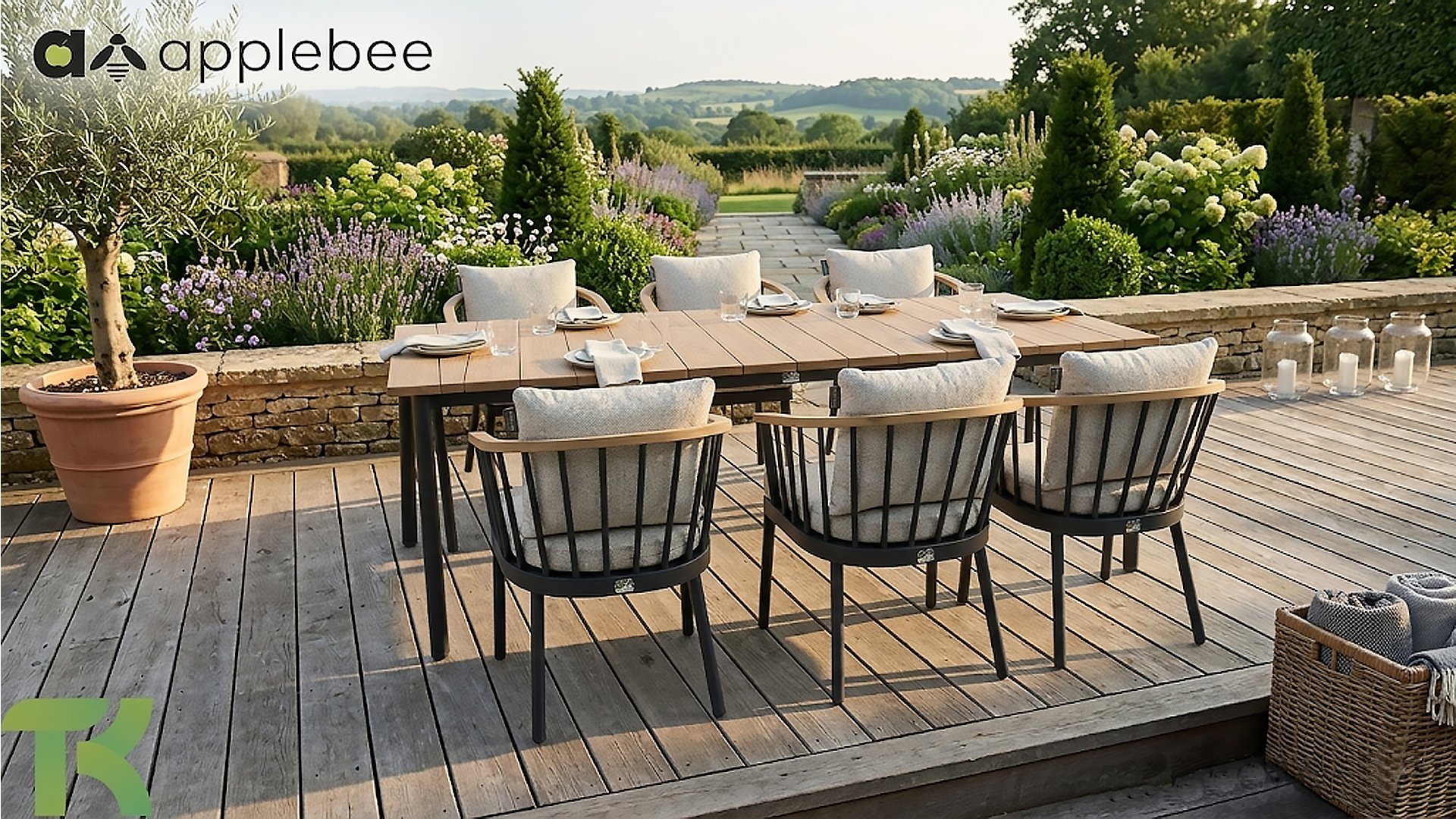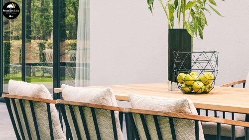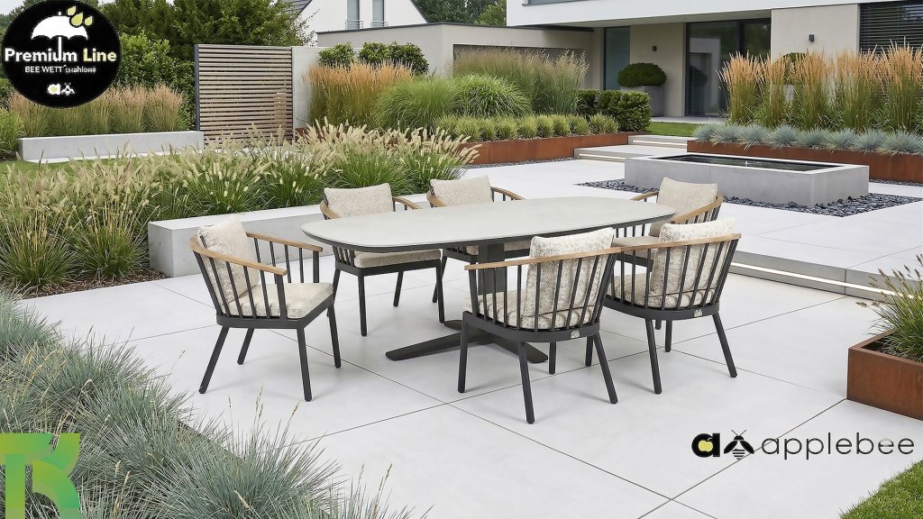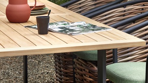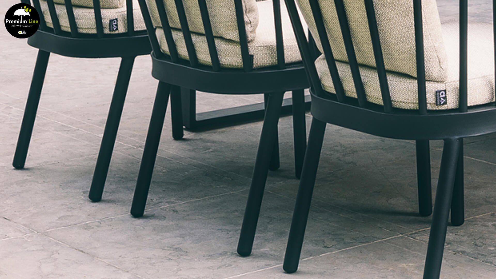 Apple Bee Condor Dining sieht elegant und cool aus. Dies wird sowohl auf den Stühlen als auch auf dem Tischgestell gezeigt. Das Basismaterial dieses Sets ist mattschwarz pulverbeschichtetes Aluminium, das in robusten Größen aufgetragen wird. Die BEE WETT®-Kissen haben eine grobe Webstruktur, aber einen weichen Griff für optimalen Komfort. Zusammen mit den schönen Kurven in der Rückenlehne und der Verwendung von natürlichem Teakholz für die Tischplatte und die Armlehnen hat der Condor immer noch die angenehme Atmosphäre eines natürlichen, warmen Aussehens.