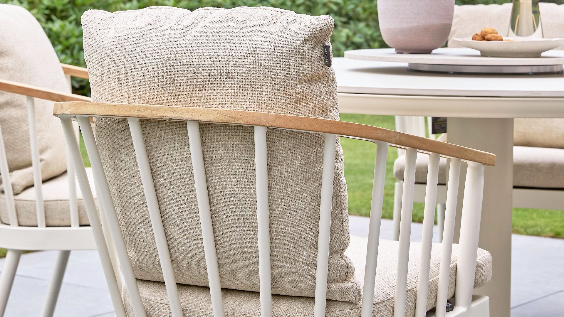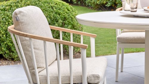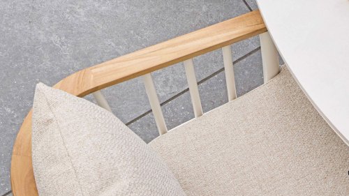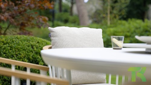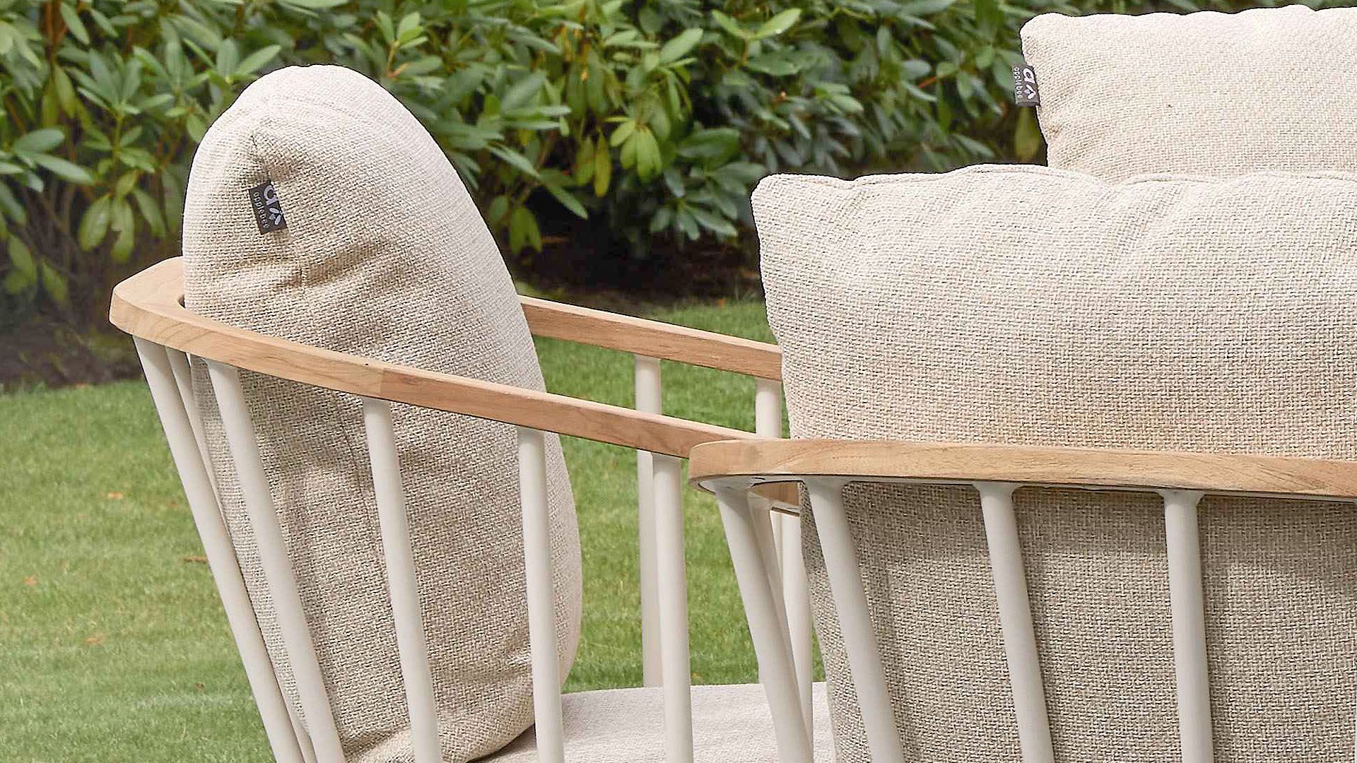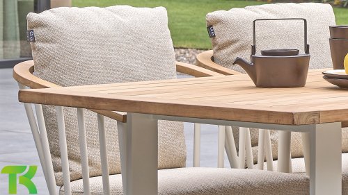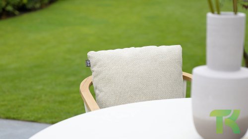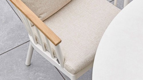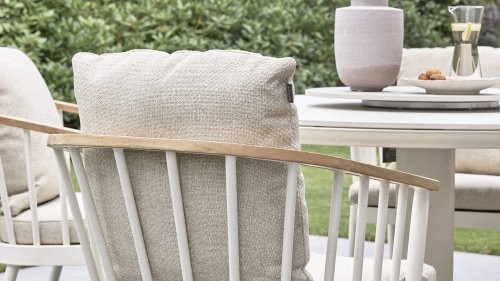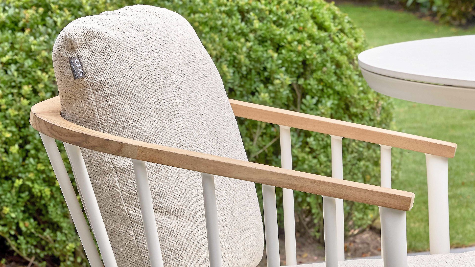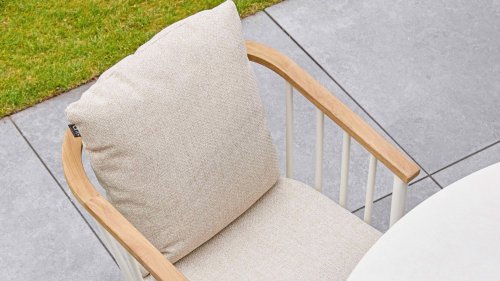 Der Stuhl wird mit einem Kissensatz in der Farbe Cotton Flower geliefert, einem sanften Beigeton, der perfekt zu den dezenten Farben des Gestells und des Teakholzes passt. Die BEE WETT®-Kissen haben einen wunderbaren Soft-Touch für optimalen Komfort. Der Condor Gartenstuhl ist Teil einer vielseitigen Serie, die verschiedene Kombinationen ermöglicht. Sie können wählen aus: Condor Oyster Dining-Set, Condor Oyster Lounge-Set, Condor Black Dining-Set und dem Condor Black Lounge-Set, sodass Sie den Stil Ihres Außenbereichs ganz nach Ihren Wünschen gestalten können.