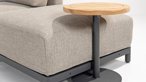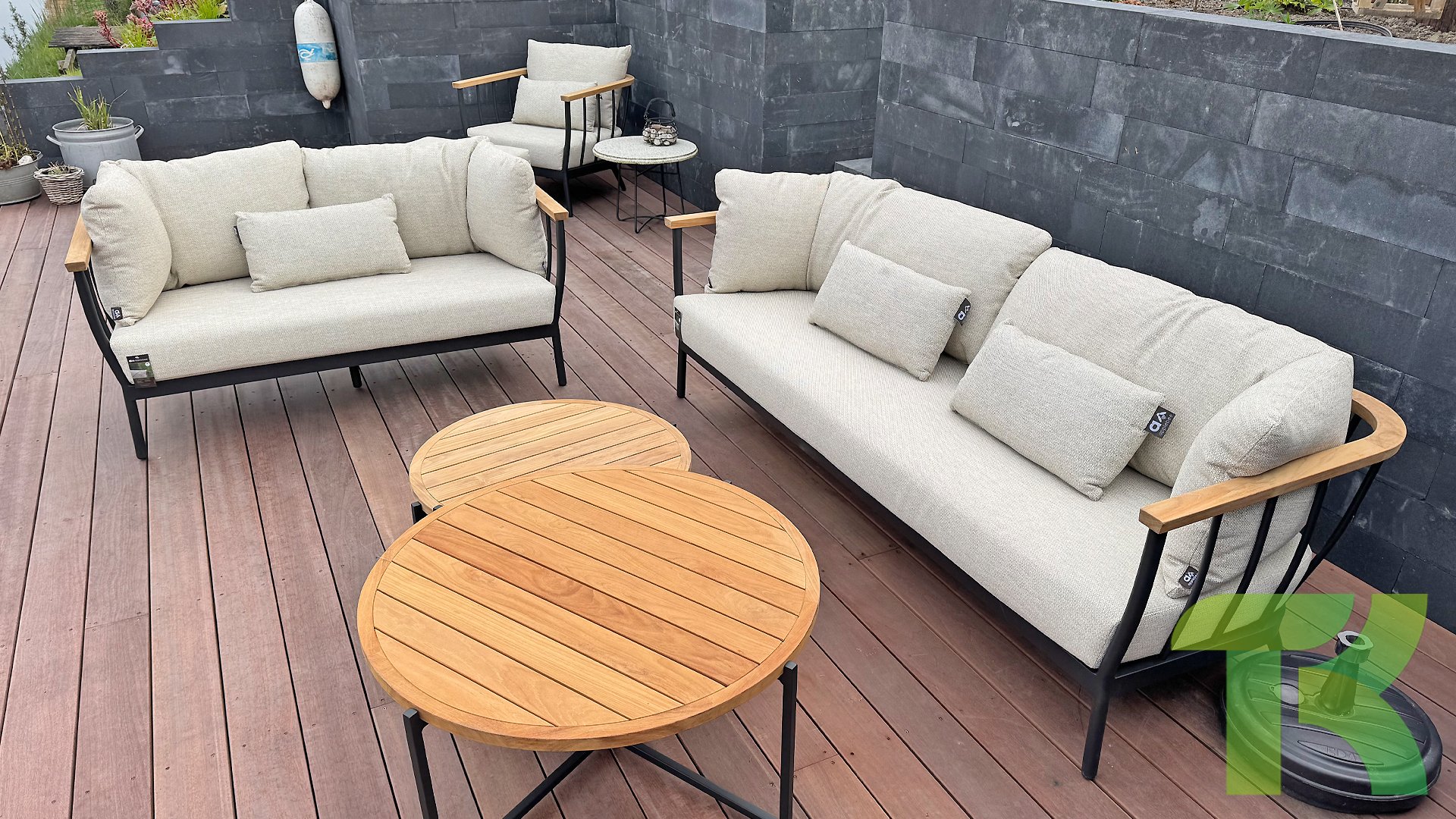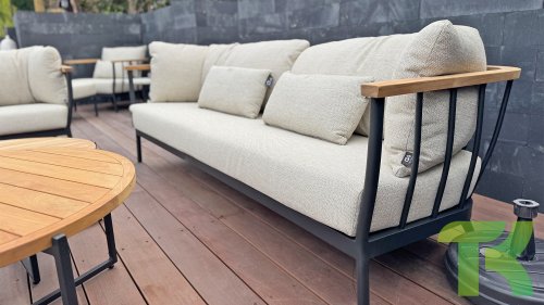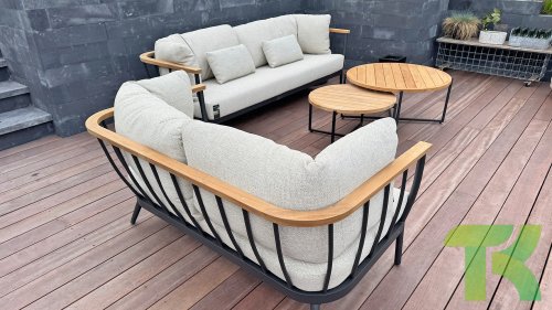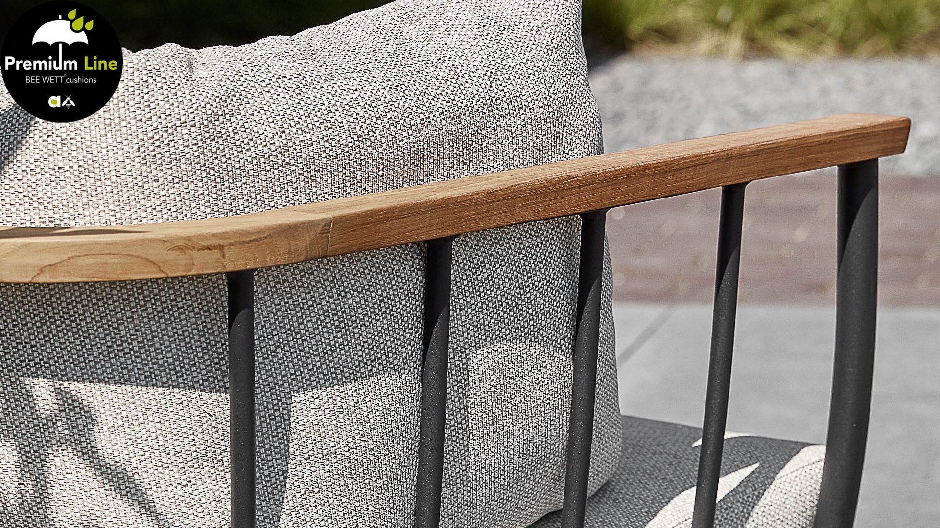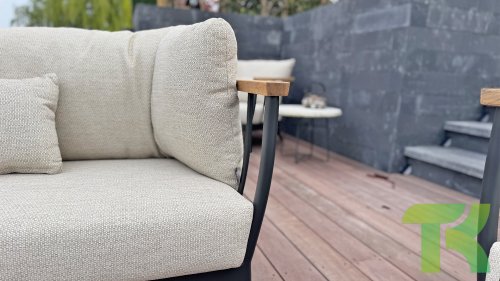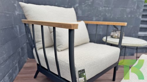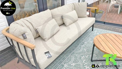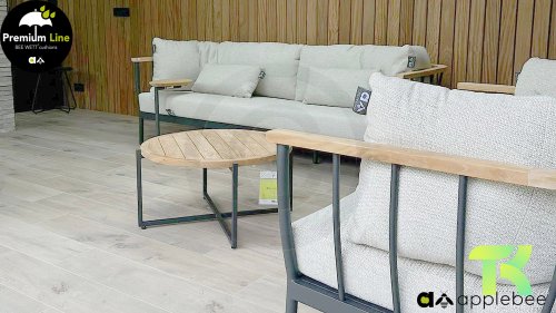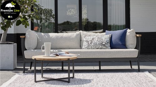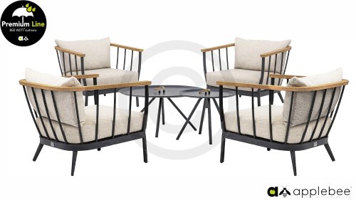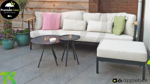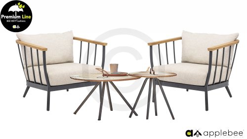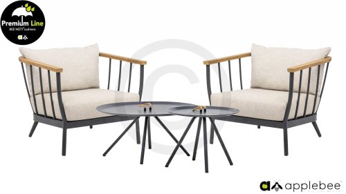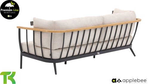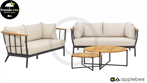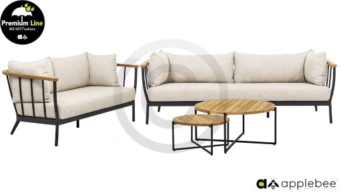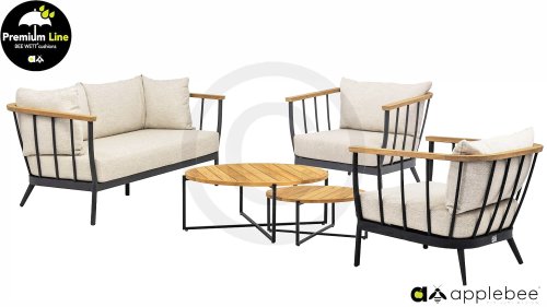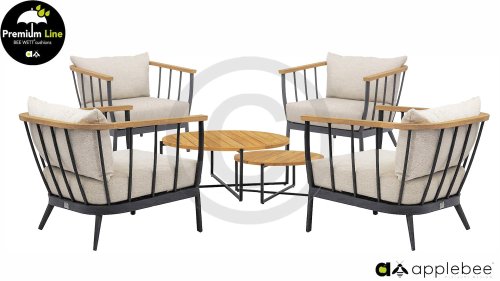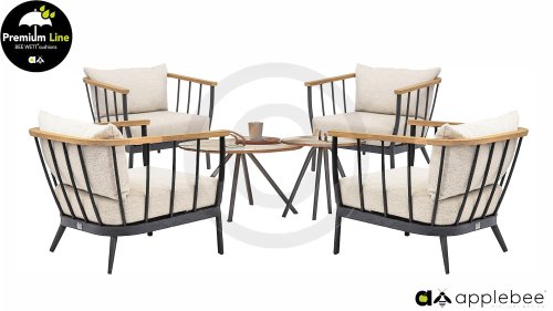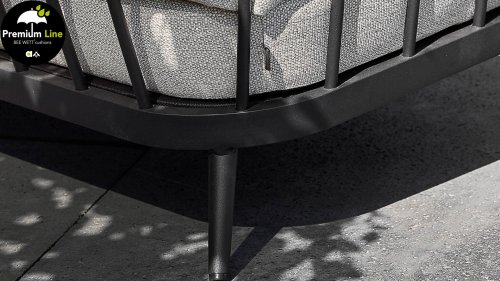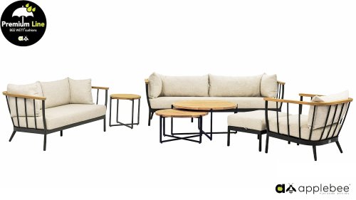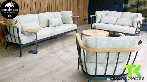 Die Apple Bee Condor-Lounge hat ein elegantes, robustes Aussehen. Das Grundmaterial ist matt schwarz pulverbeschichtetes Aluminium. Die BEE WETT®-Kissen haben eine grobe Gewebestruktur, aber einen weichen Griff. Die schönen Rundungen im Rücken und die Verwendung von natürlichem Teakholz in den Geländern verleihen dem Condor einen angenehmen Hauch von natürlicher Wärme.