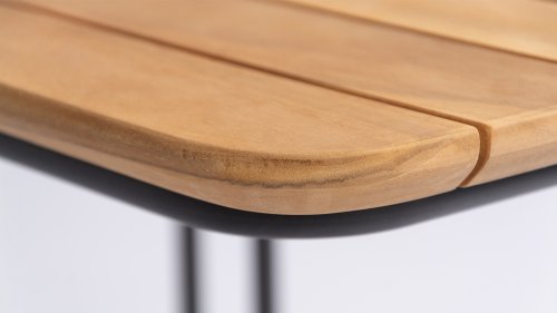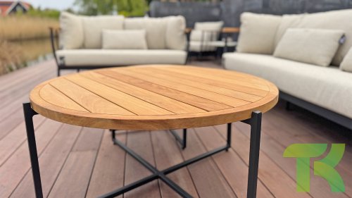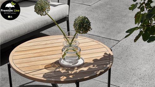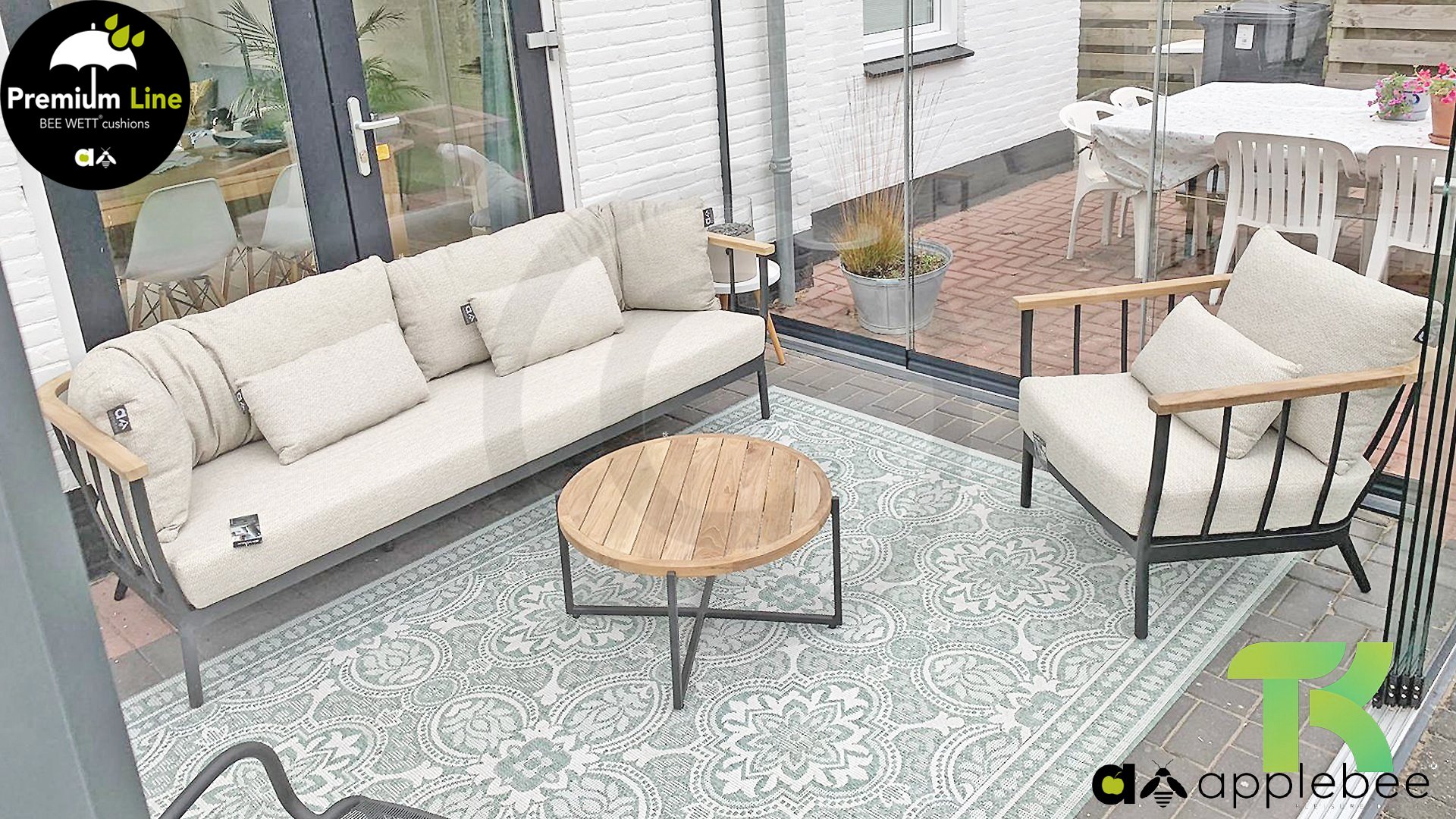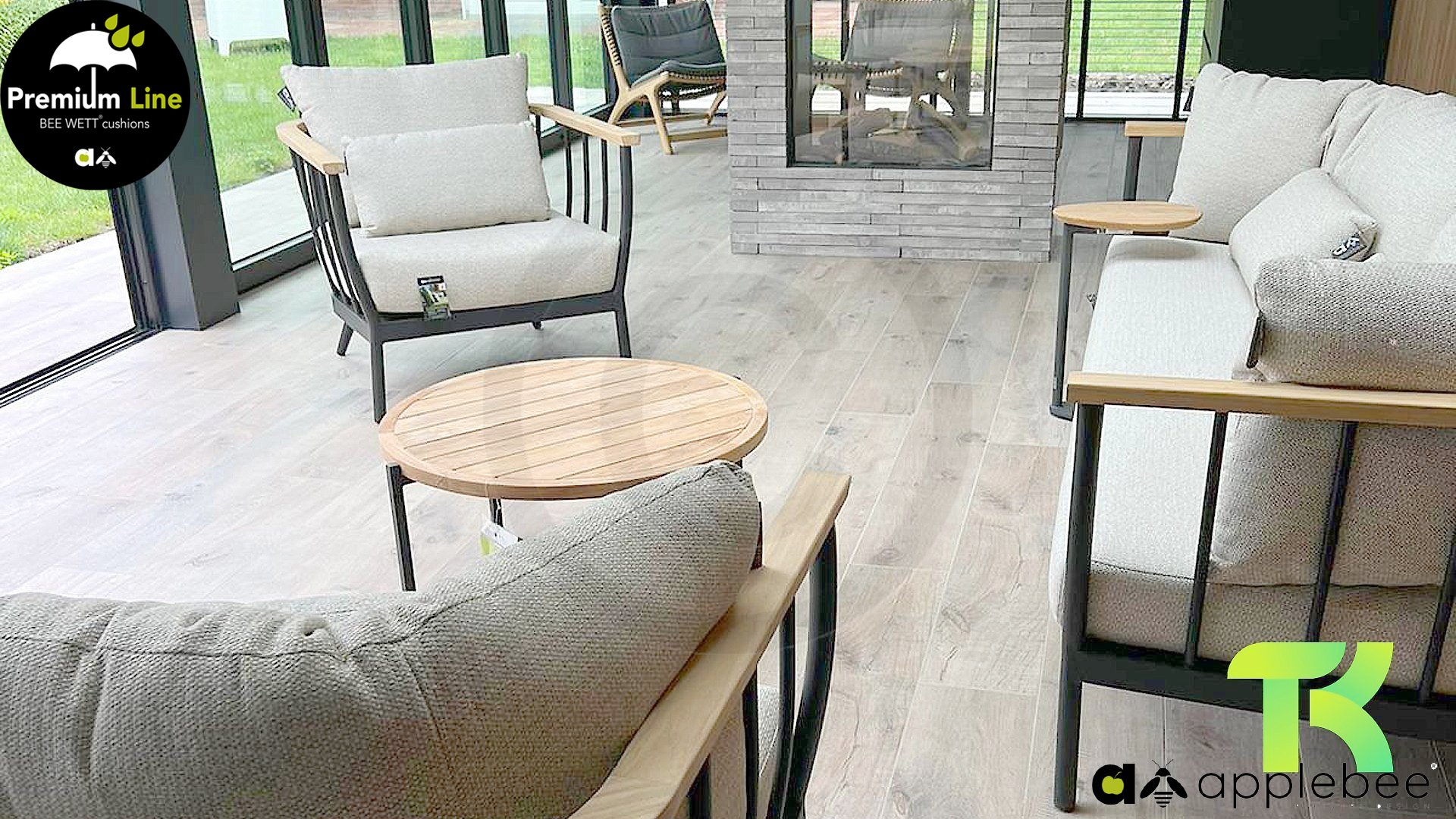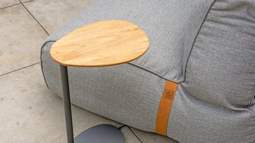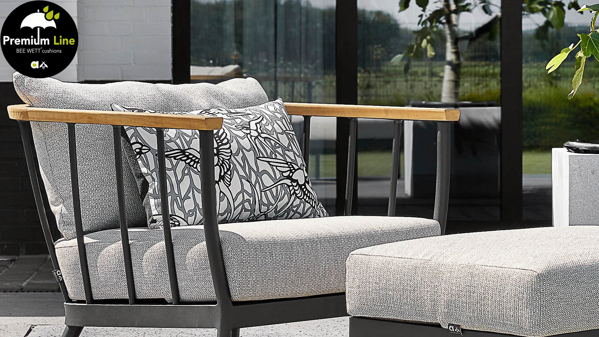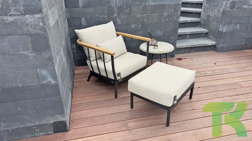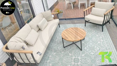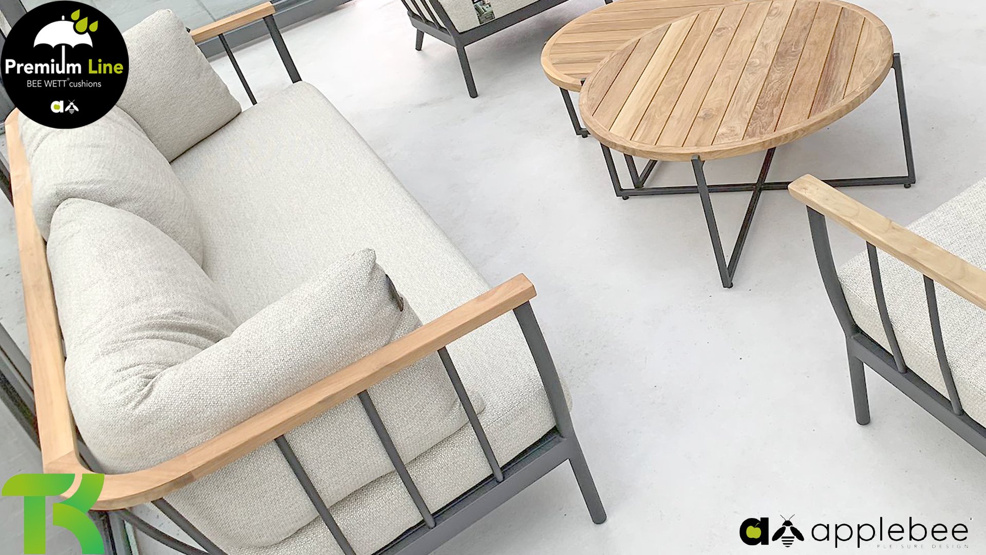 Die Apple Bee Condor-Lounge hat ein elegantes, robustes Aussehen. Das Grundmaterial ist matt schwarz pulverbeschichtetes Aluminium. Die BEE WETT®-Kissen haben eine grobe Gewebestruktur, aber einen weichen Griff. Die schönen Rundungen im Rücken und die Verwendung von natürlichem Teakholz in den Geländern verleihen dem Condor einen angenehmen Hauch von natürlicher Wärme.