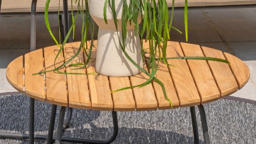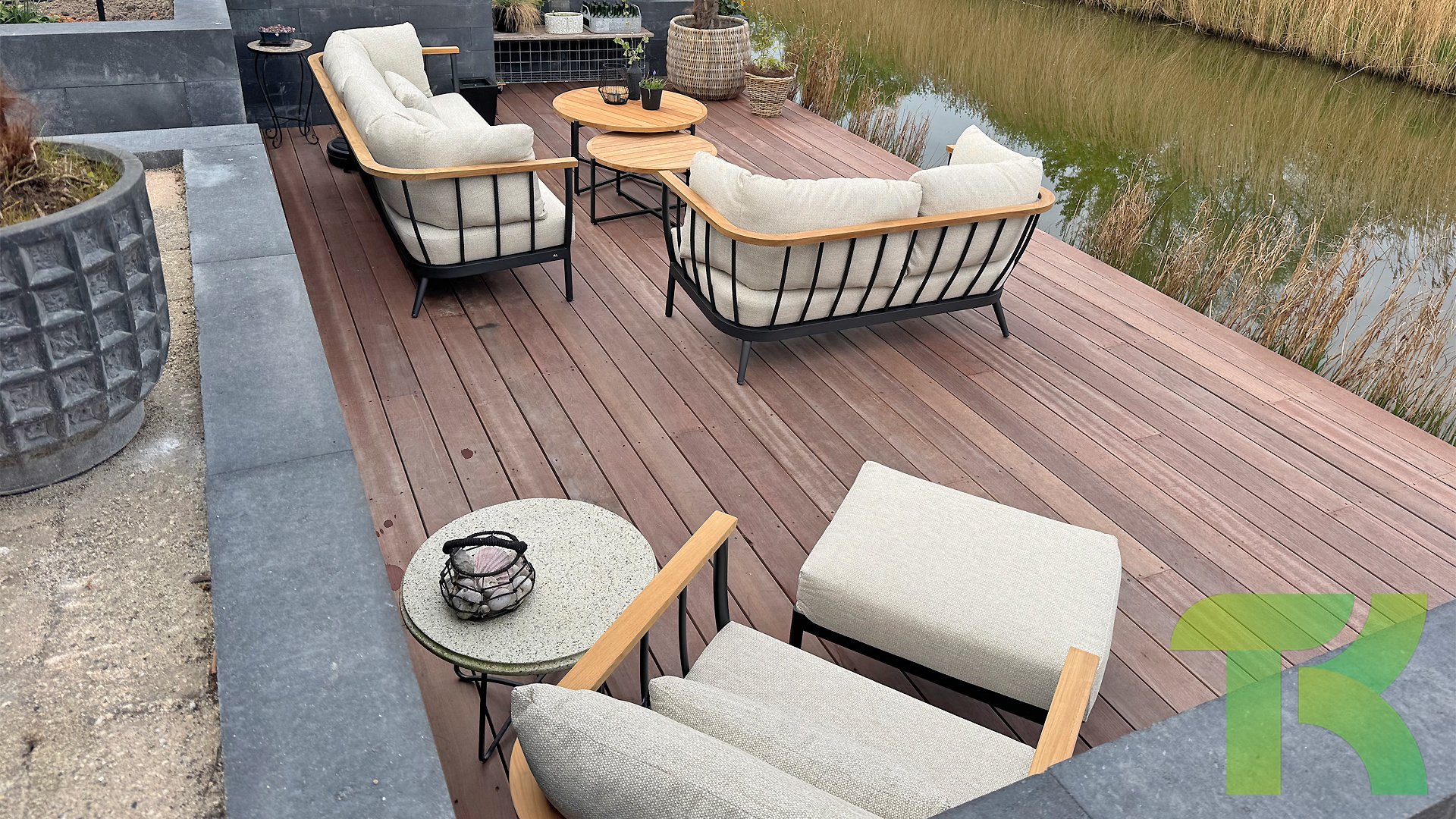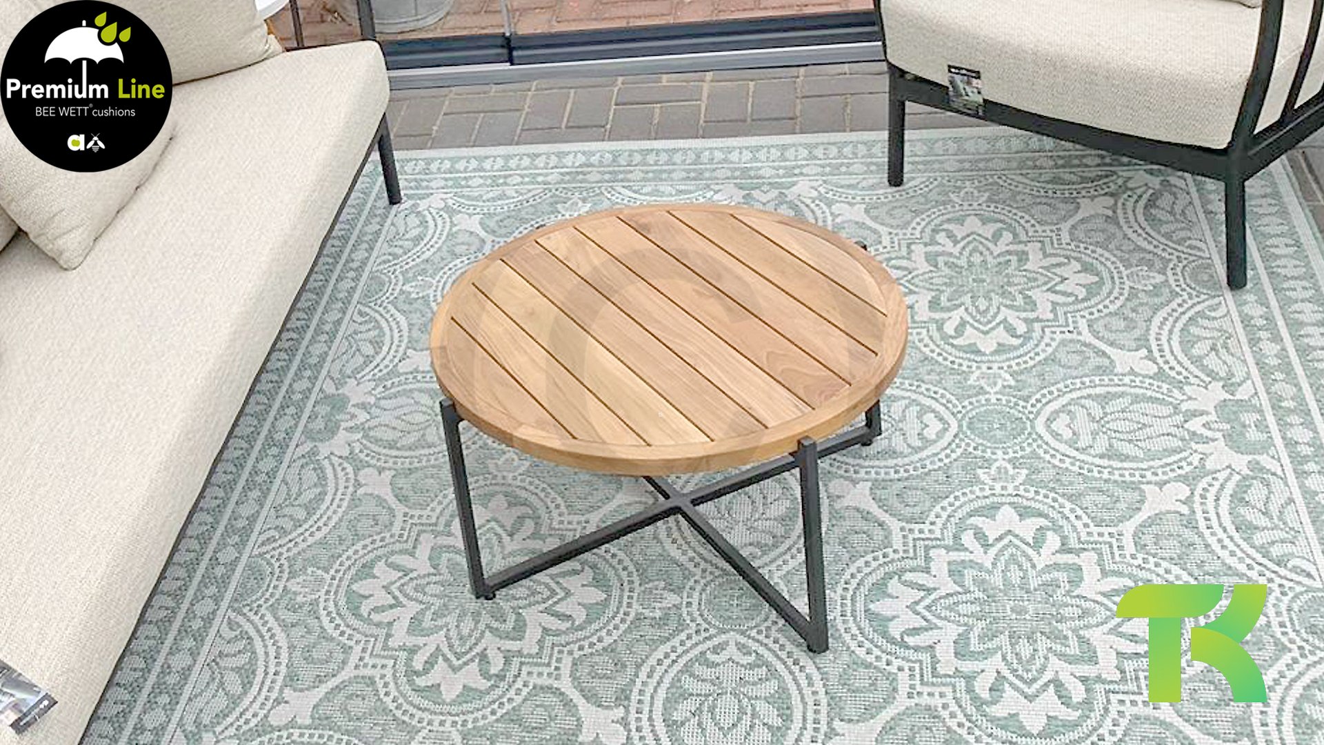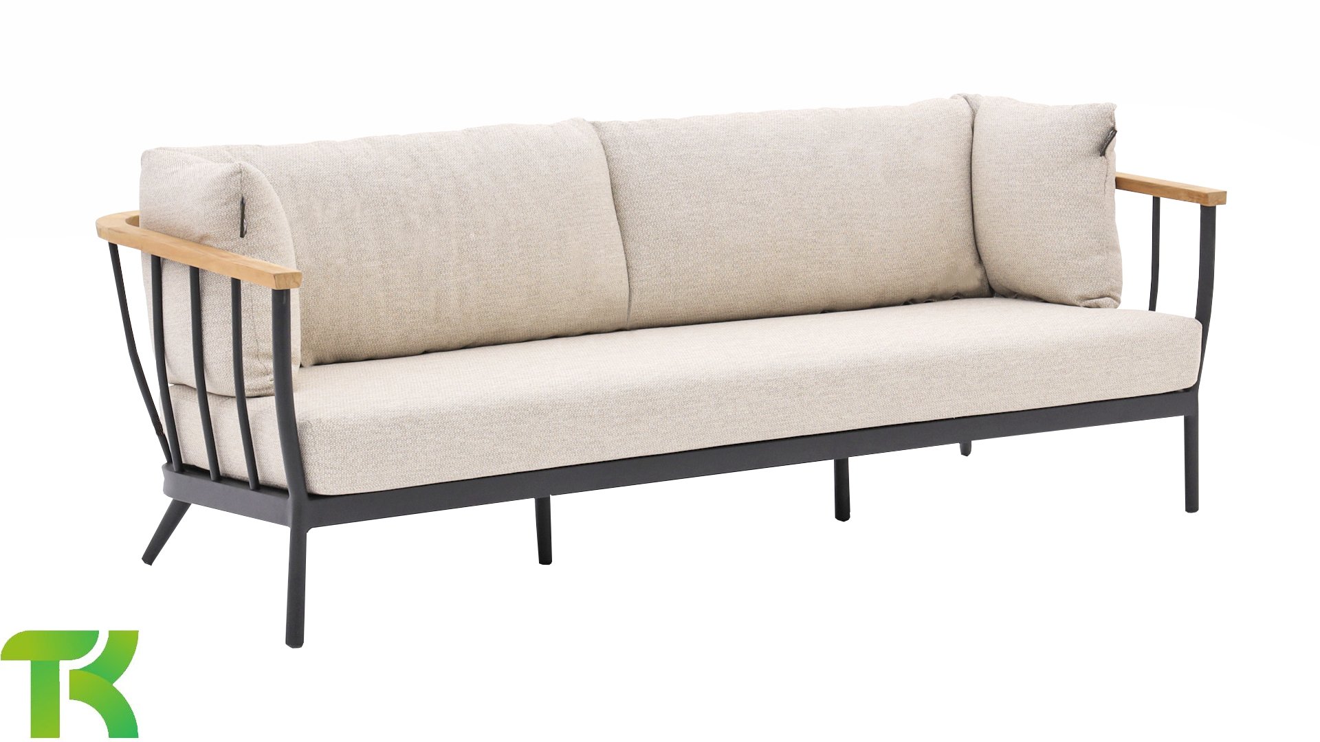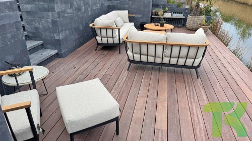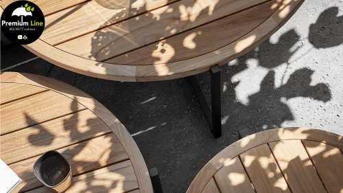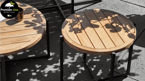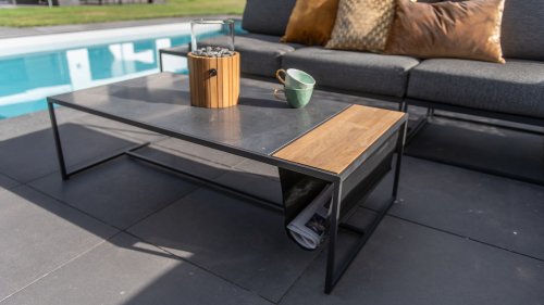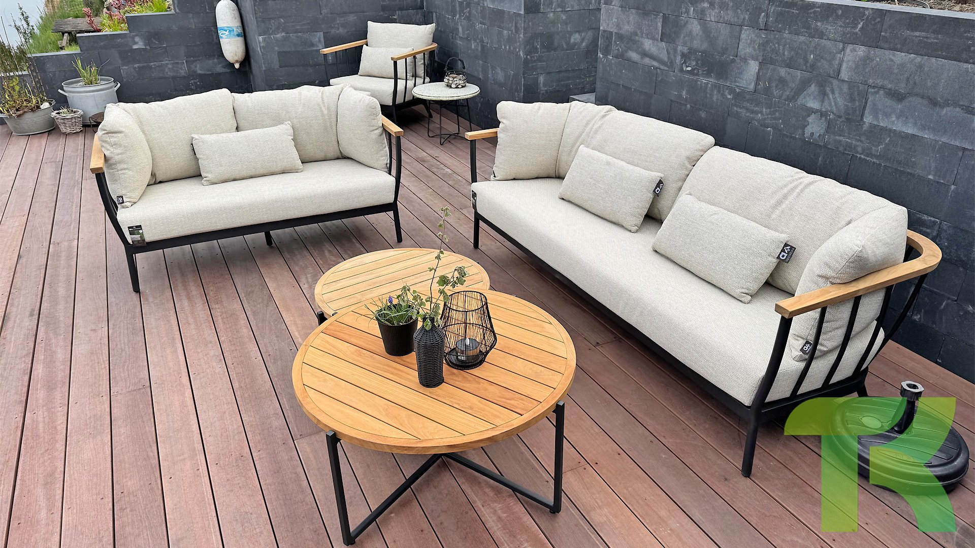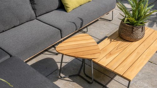Die Apple Bee Condor-Lounge hat ein elegantes, robustes Aussehen. Das Grundmaterial ist matt schwarz pulverbeschichtetes Aluminium. Die BEE WETT®-Kissen haben eine grobe Gewebestruktur, aber einen weichen Griff. Die schönen Rundungen im Rücken und die Verwendung von natürlichem Teakholz in den Geländern verleihen dem Condor einen angenehmen Hauch von natürlicher Wärme.