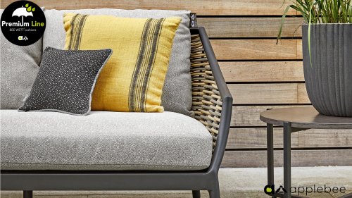 Apple Bee Möbel werden hergestellt aus den besten Materialien. Das gilt ebenso auch für die Kissen und Polster. Bee Wett sind spezielle wetterfeste Kissen die natürlich draussen liegen bleiben können. Die abnehmbaren Hüllen werden aus den bestenmöglichen Stoffen hergestellt und sind alle waschbar. Der Stoff ist zusätzlich wasserabstoßend und garantiert UV-beständig. Anders als bei dem gewöhnlichen Schaum nimmt die einzigartige Bee Wett Füllung keine Feuchtigkeit mehr auf. Eine offenes Gewebe an der Unterseite der Kissen sorgt für eine perfekte Drainage. Der Vorteil, dass die Bee-Wett® Kissen und Polster unglaublich viel schneller trocknen als vergleichbare andere Kissen. Das Bee Wett-Kissen wird mit einem Olefin Stoff bezogen, der eine gute Beständigkeit gegen Verfaulen und Stockflecken aufweist, und darüber hinaus UV-beständig, weich, komfortabel und feuchtigkeitsabstoßend ist.