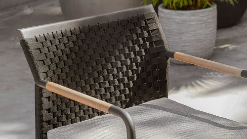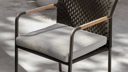 Die intelligente Linienführung verleiht diesem Apple Bee Elle Rope Dining Set eine schlanke Optik, bietet jedoch viel Sitzplatz. Das runde matt-schwarze Aluminiumrohrgestell wird von einem naturbelassenen Teakholz-Armlehnen abgewechselt. Das helle Sitzkissen und das Teakholz-Detail in der Armlehne sorgen für Kontrast und Lebendigkeit. Für dieses Gartenset wurde eine Kombination mit Esstischen gewählt, in denen derselbe Materialmix aus matt-schwarzem Aluminium und naturbelassenem Teakholz für einen modernen Effekt sorgt.