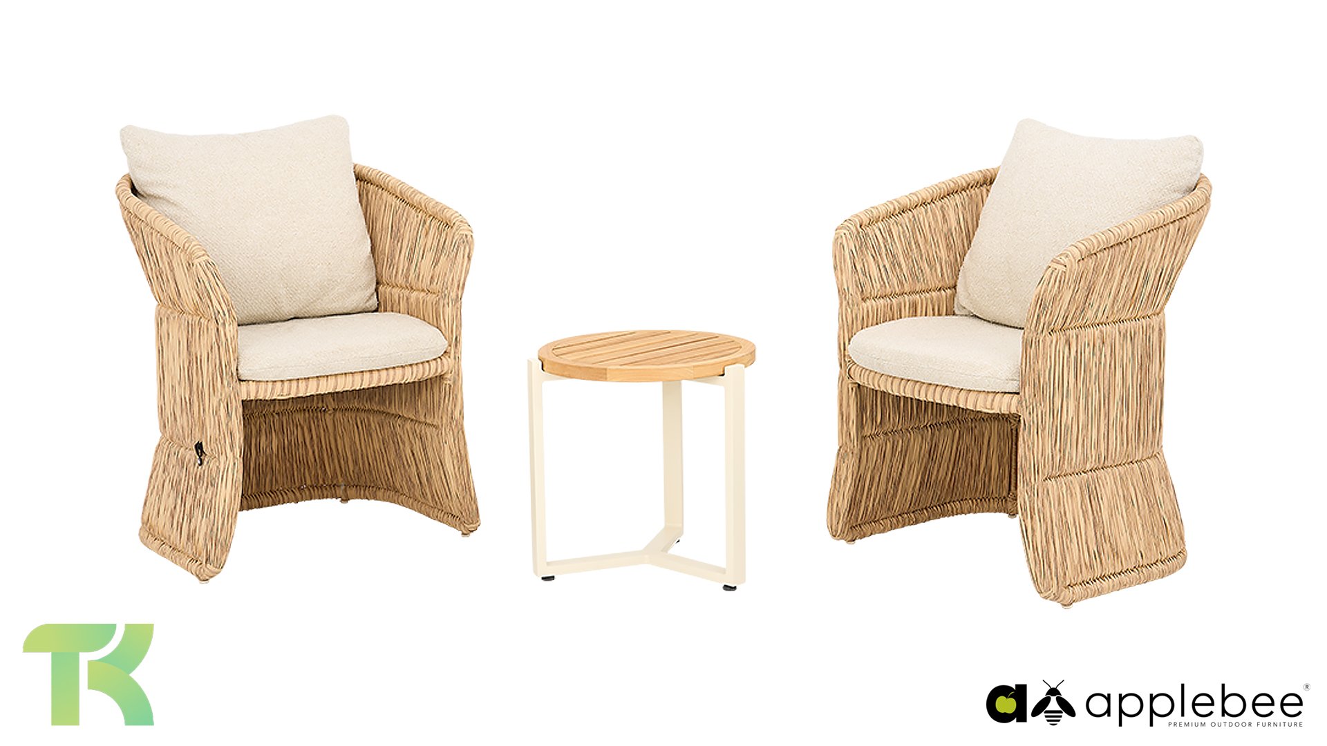 Das Geheimnis des Gili liegt in seinem Material: Biculair Twisted Leaf. Dieses dicke, runde Flechtwerk in einem warmen, natürlichen Farbton verleiht dem Stuhl eine authentische Flechtoptik und ist gleichzeitig absolut wetterfest. Der Stuhl ist als bequeme Schale mit einem dicht geflochtenen Untergestell konzipiert, was dem Gartentisch ein solides und edles Aussehen verleiht. Dank der einzigartigen BeeWett-Technologie von Apple Bee sind die Kissen feuchtigkeitsregulierend, atmungsaktiv und trocknen nach einem Sommerregen unglaublich schnell.