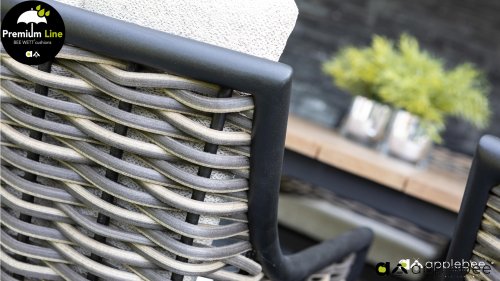 Apple Bee zeichnet sich durch die Verwendung des speziellen Biculair®-Geflechts aus, das ursprünglich für den professionellen Einsatz im Gastgewerbe entwickelt wurde. Dieses Biculair®-Geflecht ist eine naturgetreue und nachhaltige Alternative zu Rattan. Die äußerst strapazierfähige synthetische Rattanfaser (HDPE) ist absolut wetterfest, farbecht, recycelbar und somit eine umweltfreundliche Wahl. Aussehen und Funktionalität der Möbel bleiben von den europäischen Witterungsbedingungen unbeeinträchtigt, und die Farben behalten ihre natürliche Leuchtkraft. Die überlegene Qualität dieses Geflechts, bestätigt von der Niederländischen Organisation für Angewandte Naturwissenschaftliche Forschung (TNO), zeigt sich deutlich im Vergleich zu anderen vergleichbaren Materialien.
