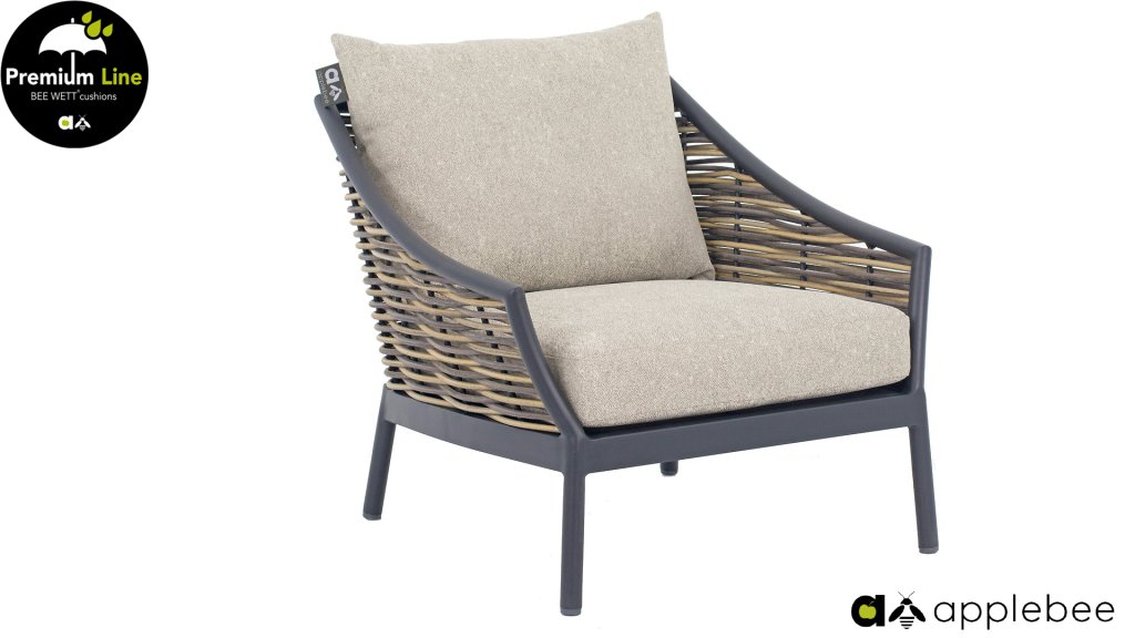 Die Apple Bee Milou Lounge Black besticht durch ihre elegante Flechtoptik und verleiht Ihrer Lounge-Garnitur eine natürliche Note! Sie bietet großzügigen Sitzkomfort und dicke Kissen mit Apple Bees bewährter Bee Wett®-Technologie. Das Gestell besteht aus pulverbeschichtetem Aluminium in Austernfarbe, kombiniert mit robustem Biculair-Flechtgeflecht. Dieses Flechtgeflecht wird von einem ebenfalls pulverbeschichteten Rahmen in Black mit geschwungenen Linien eingefasst, was der Milou ihren schicken, modernen Look verleiht.