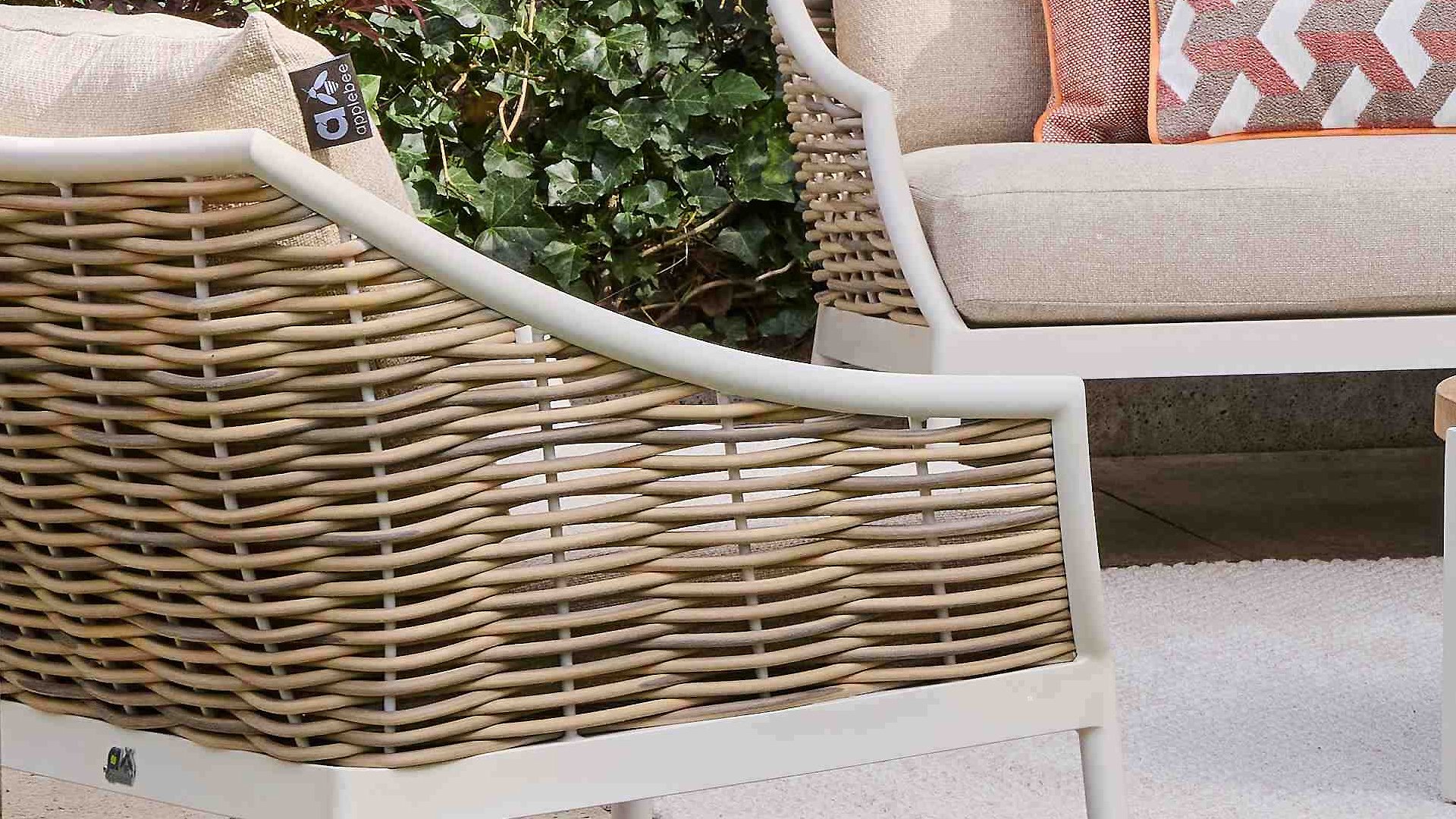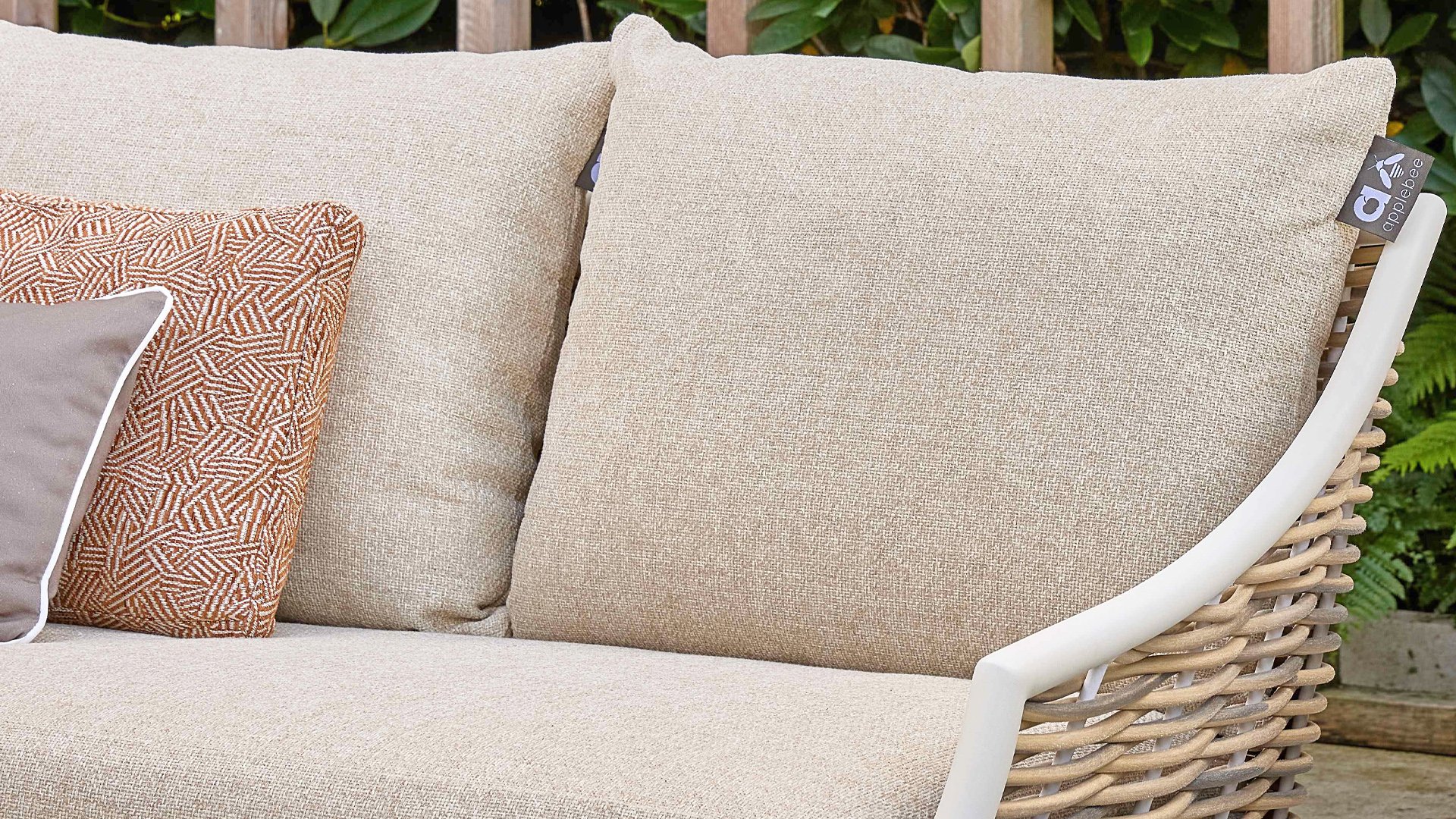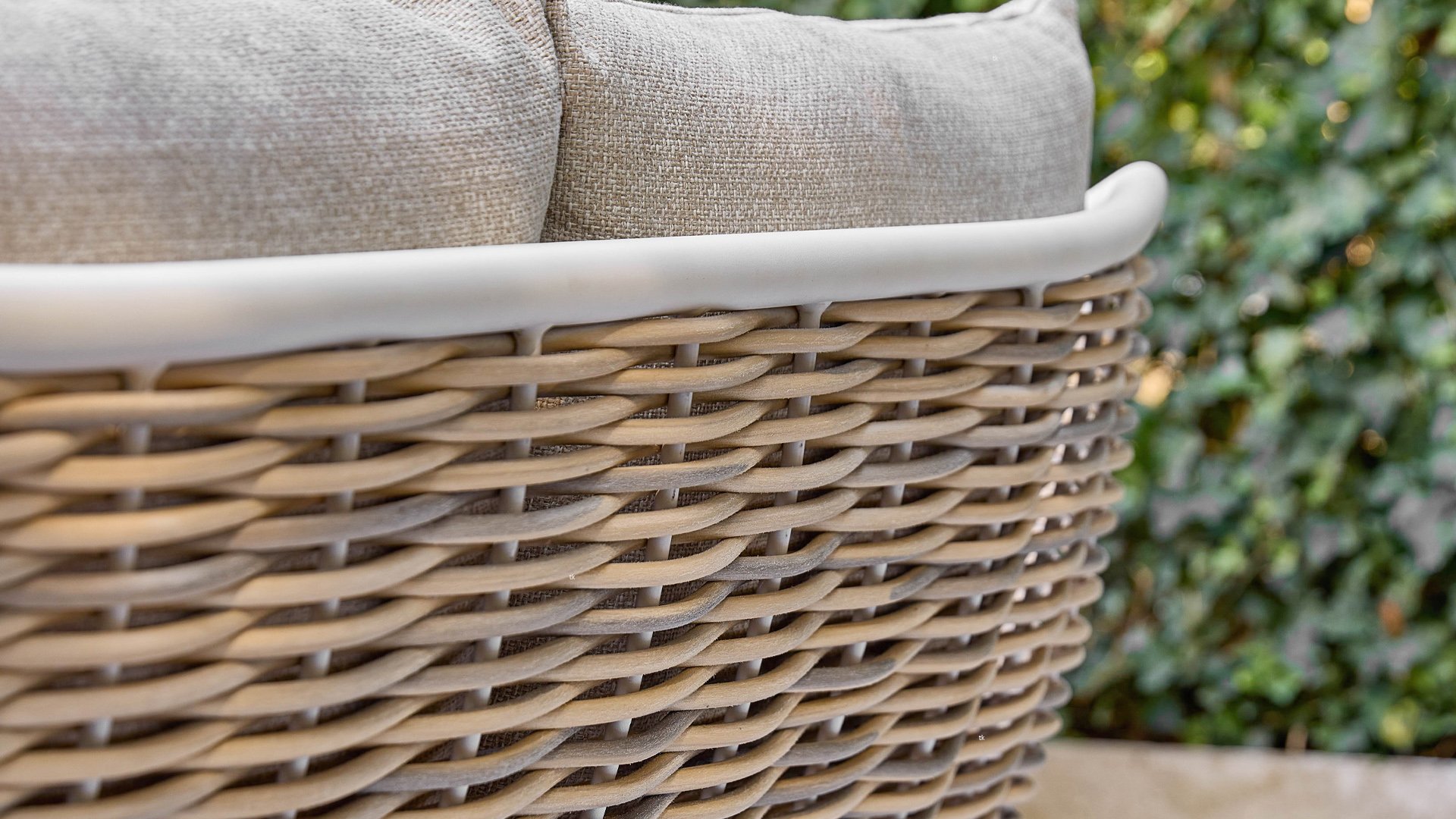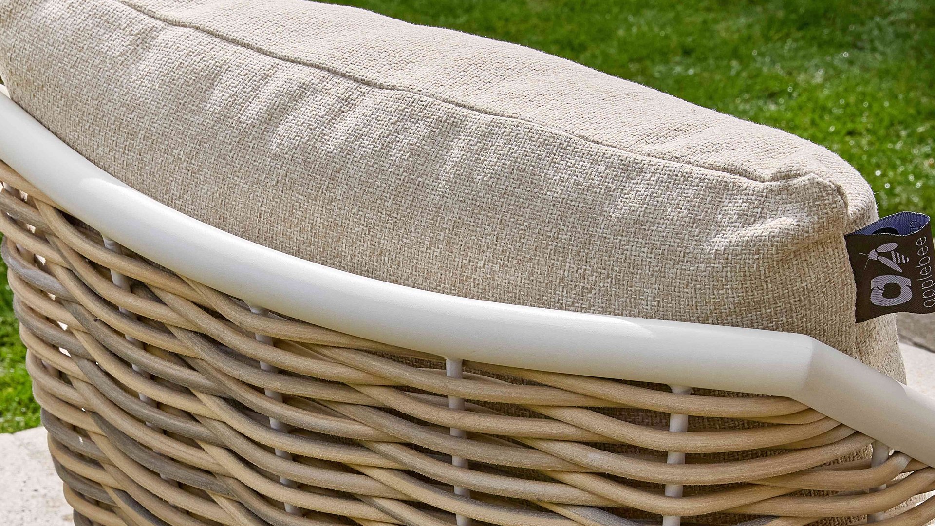 Dank seiner komfortablen Größe ist das Applebee Milou Oyster Sofa perfekt für Balkon oder kleinere Terrasse. Milou ist ein weiteres echtes Original-Designstück von Applebee, das die Kollektion bereichert! Die Premium-Kissen sind mit der Bee Wett®-Technologie ausgestattet, die für schnelles Trocknen nach einem starken Regenschauer sorgt. So können Sie die Kissen einfach draußen lassen. Die Drainage an der Unterseite der Kissen lässt Wasser problemlos ablaufen. Dank seiner großzügigen Größe lädt es zum Entspannen und Genießen ein. Das weiße Applebee Milou Lounge-Set ist daher ideal zum Wohlfühlen. Das extrem dicke Flechtgarn erfordert eine spezielle Flechttechnik, die nur von den besten Flechtern beherrscht wird. Diese Kunsthandwerker flechten jedes Garn einzeln von Hand. Mit dem Applebee Milou Lounge-Set holen Sie sich ein wahres Meisterwerk der Handwerkskunst in Ihr Zuhause.