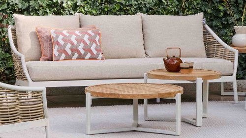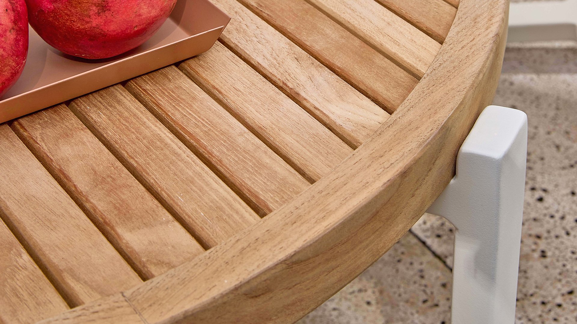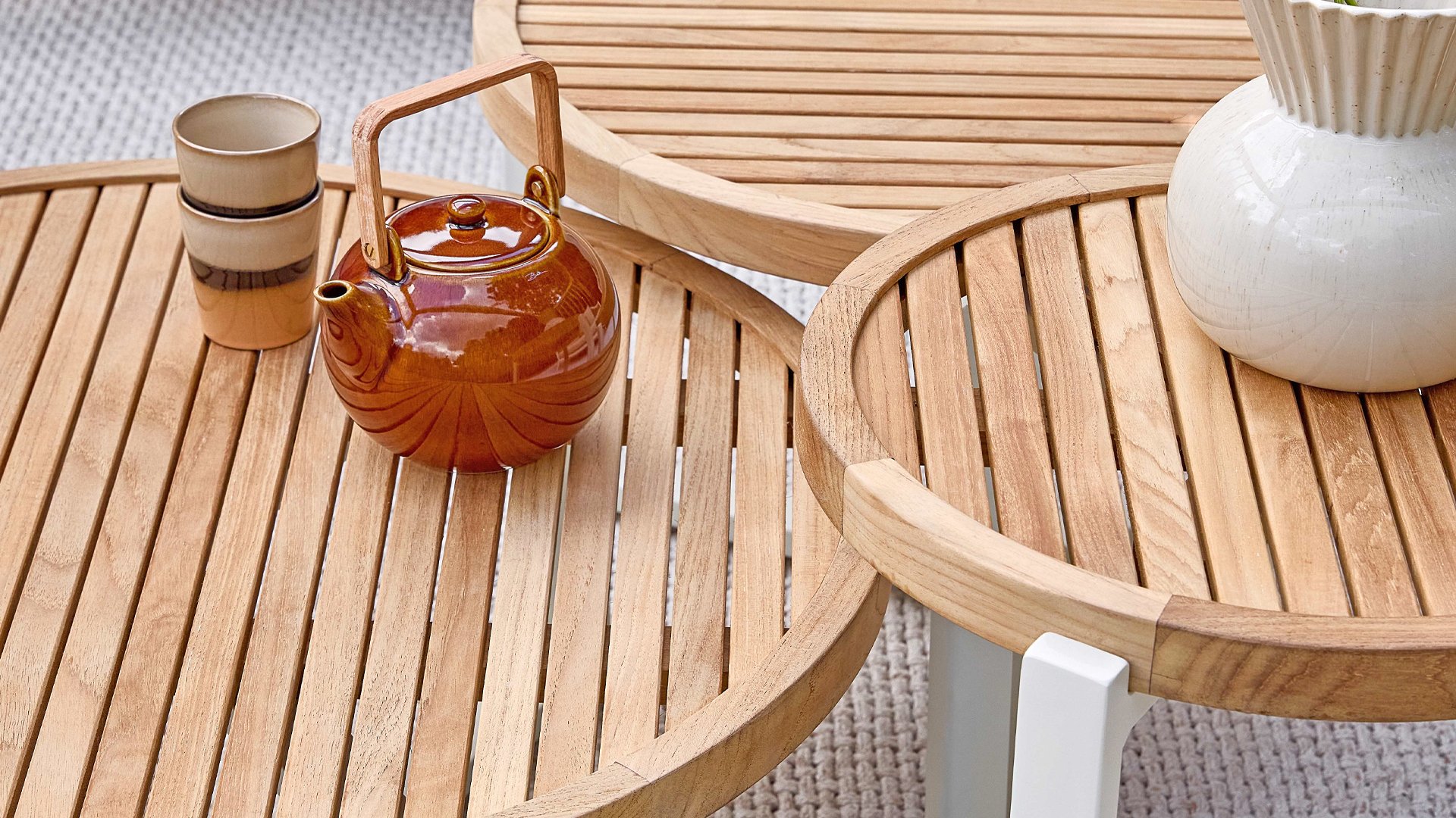 Lernen Sie die Tischserie Apple Bee Monaco kennen. Eine stilvolle Kombination aus Luxus und Nachhaltigkeit. Die zertifizierte Teakholzplatte verleiht dem Tisch eine warme, natürliche Ausstrahlung, während das pulverbeschichtete Aluminiumgestell für einen modernen, eleganten Look sorgt. Dank der unterschiedlichen Höhen lassen sich die Tische perfekt als Set kombinieren.
