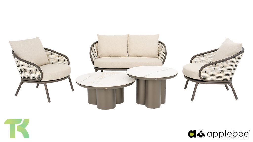 Entdecken Sie das Apple Bee Tonga Kaffeetisch-Set – die perfekte Kombination aus robustem Design und modernem Luxus. Dieses Set, bestehend aus zwei Tischen (Ø80x36cm und Ø60x44cm), verleiht jedem Wohnbereich Tiefe und Dynamik. Die hochwertigen Tischplatten aus Sinterstein sind nicht nur schön, sondern auch langlebig, kratzfest und witterungsbeständig. Die Tische stehen auf einem stabilen, pulverbeschichteten Aluminiumgestell.