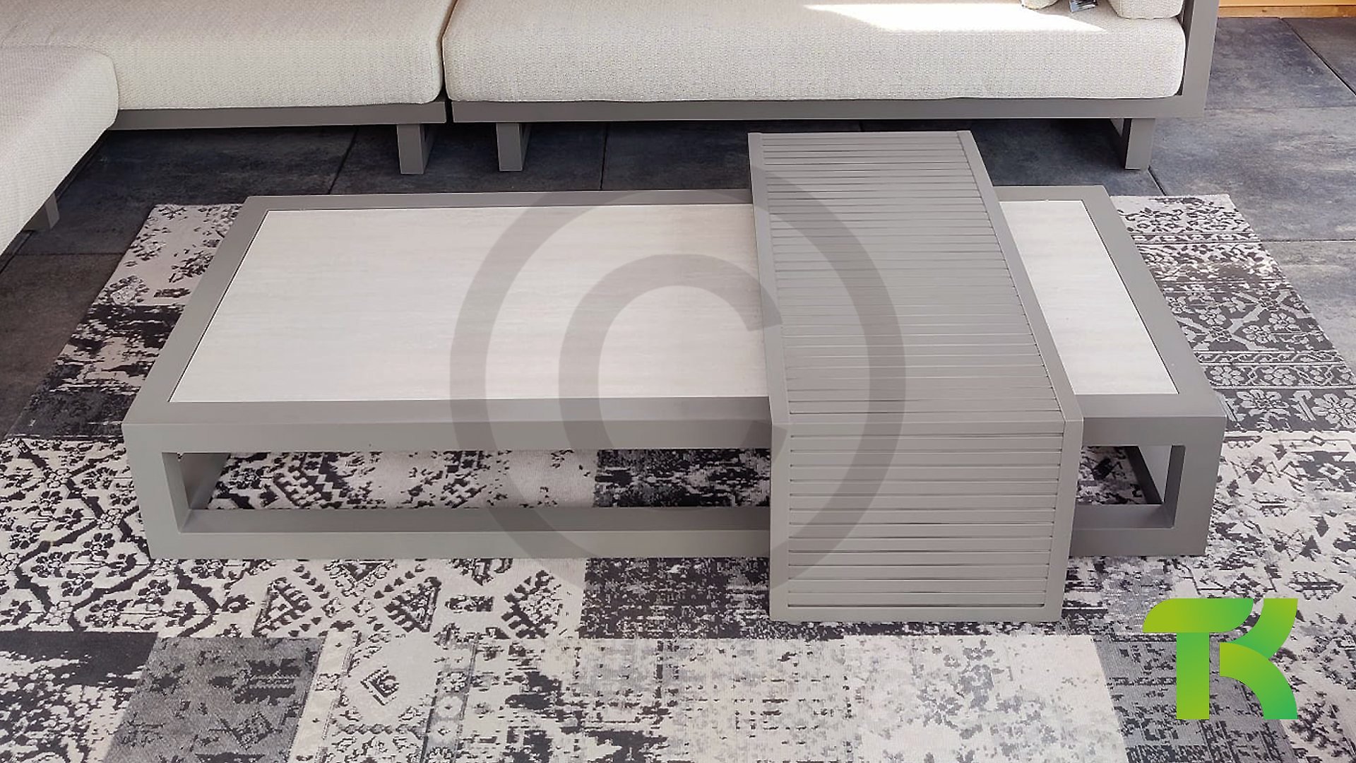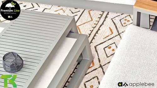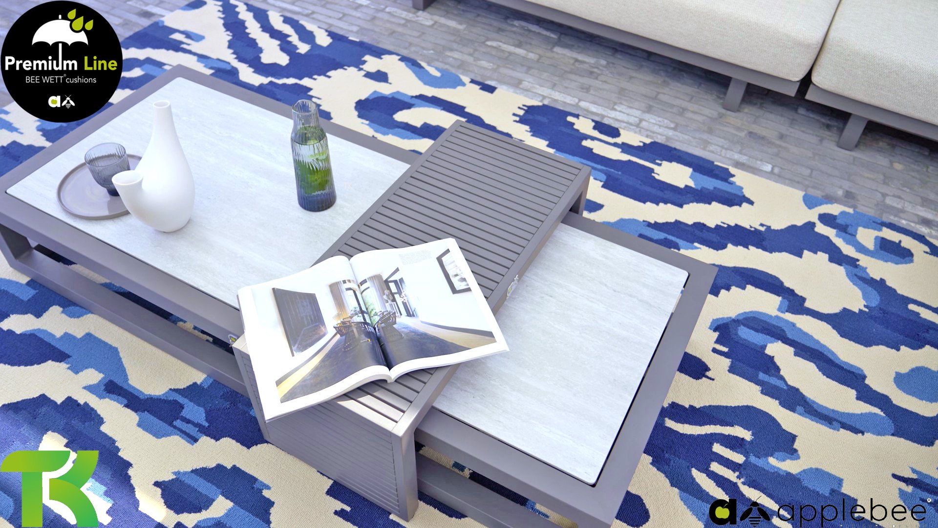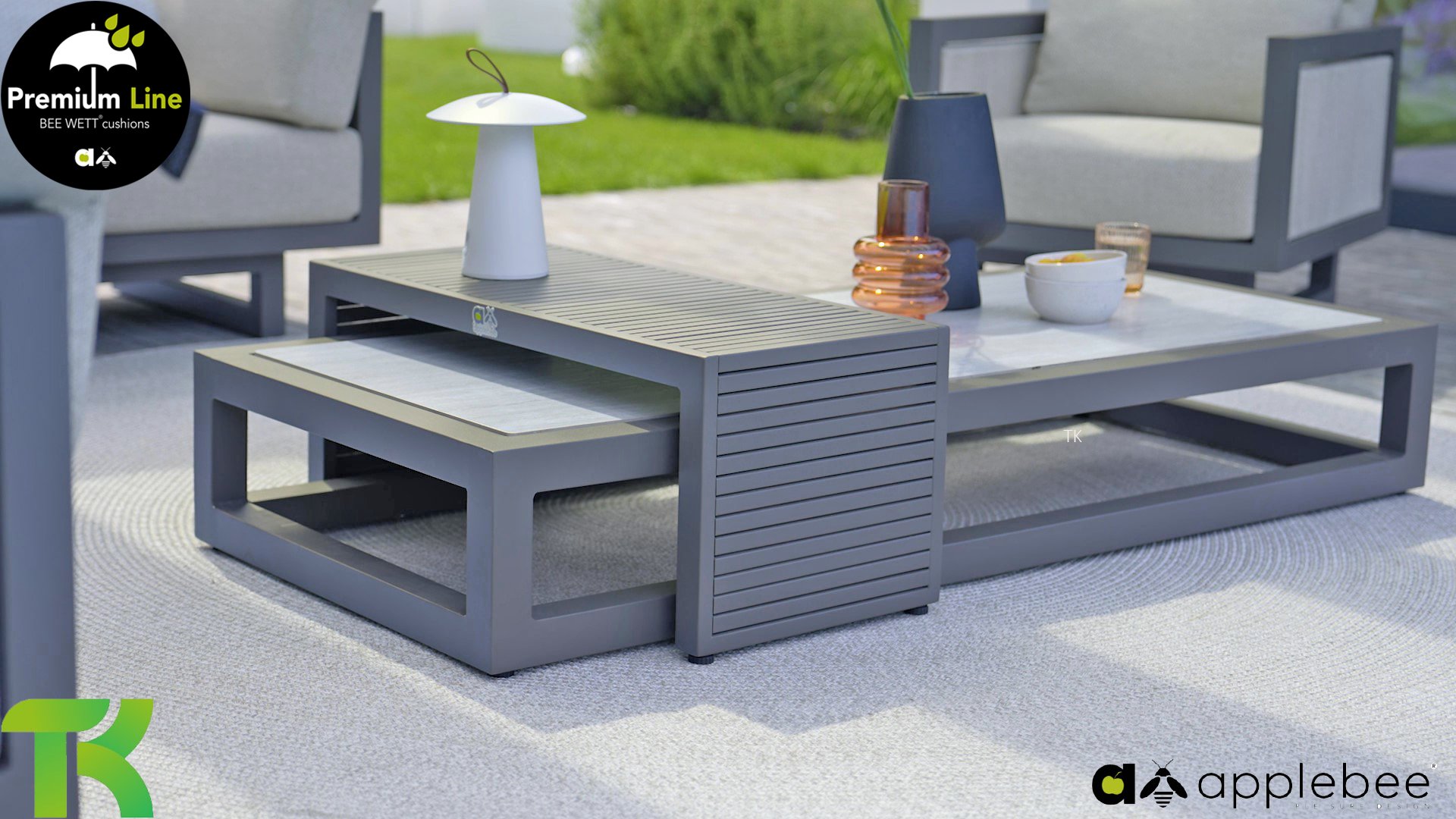 Die Santorini-Kollektion hat auch zwei verschiedene Tische. Zusammen bilden sie ein besonderes Paar, sind aber auch solo wunderschön und runden das Lounge-Set erst richtig ab. Der große Couchtisch aus Aluminium hat eine Keramik-Tischplatte in Travertin-Optik. Einfach sauber zu halten, aber mit einem luxuriösen Aussehen. Der kleinere Beistelltisch komplett aus Aluminium hat schöne Latten und gleitet perfekt über den großen Tisch. Dieser Tisch kann aber auch zwischen zwei Sofas gestellt werden, sodass Ihr Getränk immer in Reichweite ist und das Set eine verspieltere Anordnung bekommt. So stellen Sie sich das Santorini ganz nach Ihrem Geschmack zusammen... let the sun come!