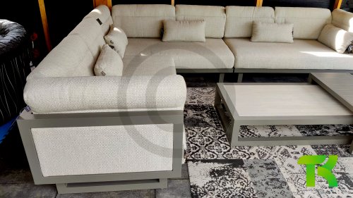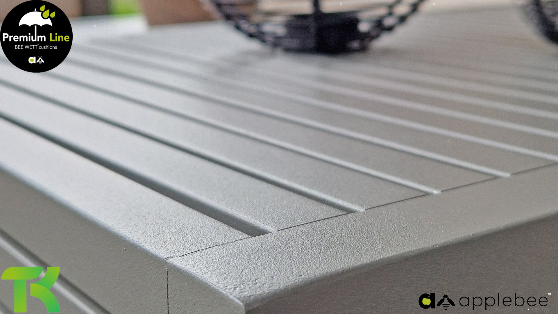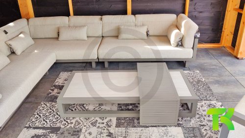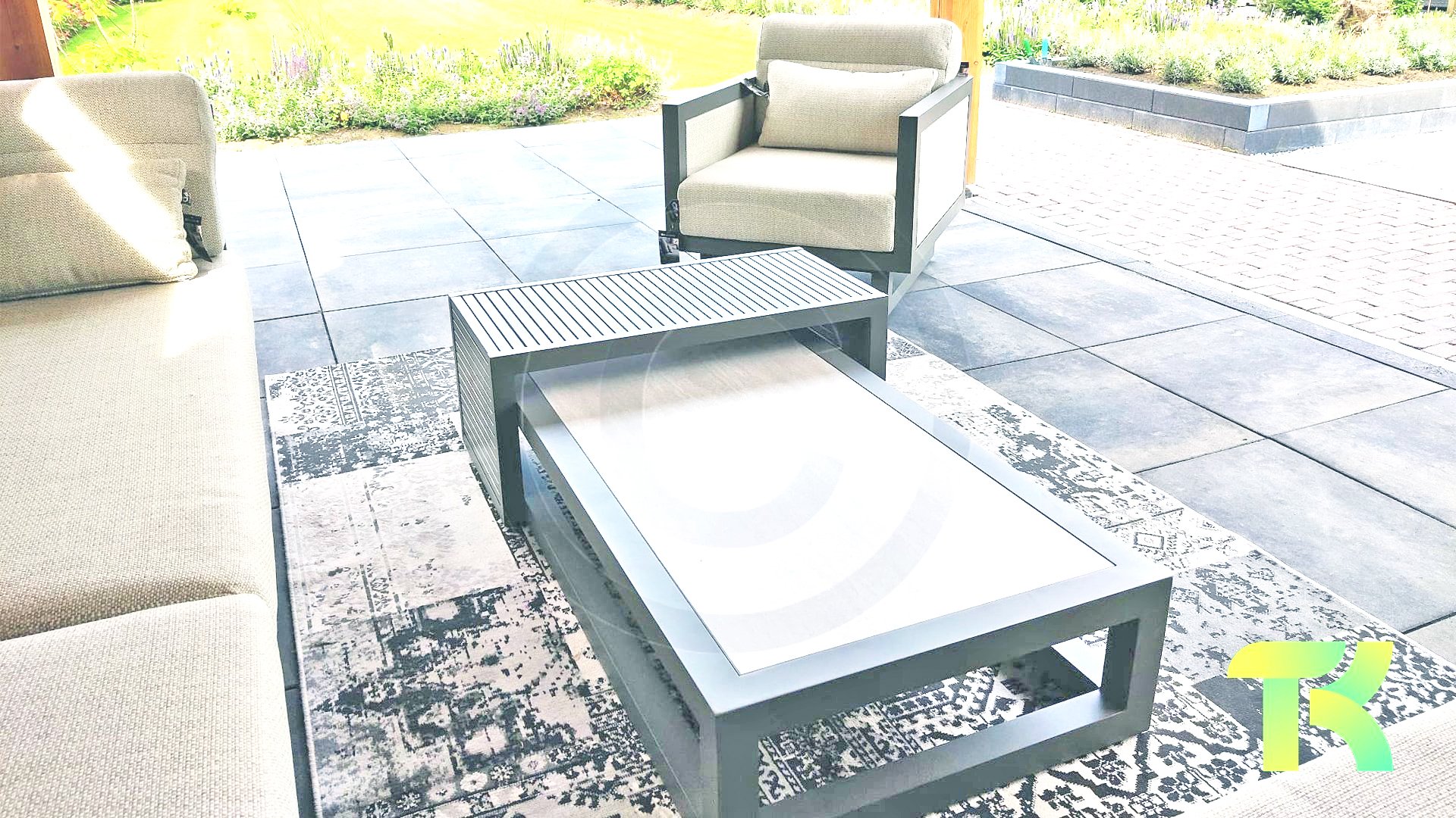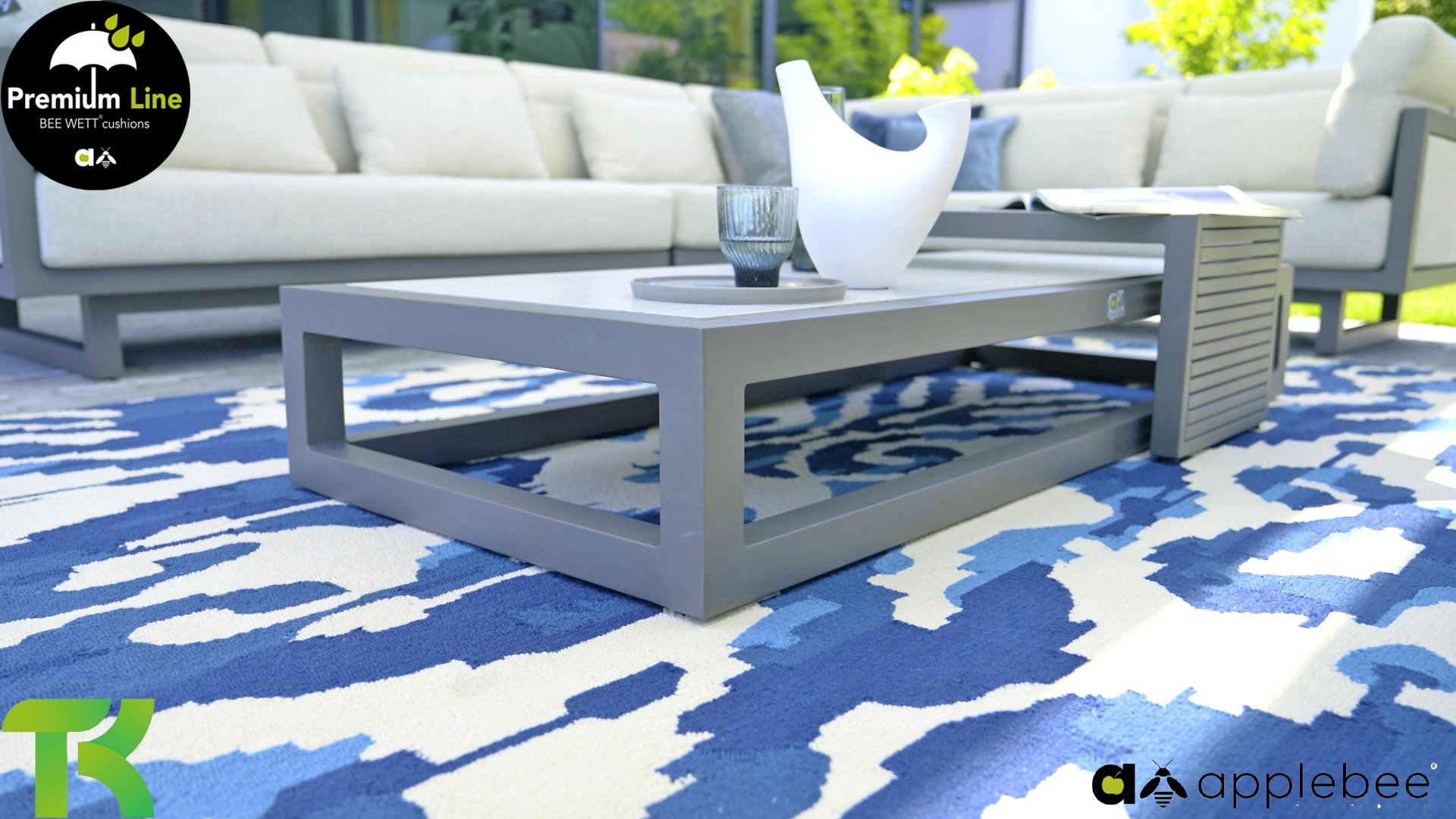 Die Santorini-Kollektion hat auch zwei verschiedene Tische. Zusammen bilden sie ein besonderes Paar, sind aber auch solo wunderschön und runden das Lounge-Set erst richtig ab. Der große Couchtisch aus Aluminium hat eine Keramik-Tischplatte in Travertin-Optik. Einfach sauber zu halten, aber mit einem luxuriösen Aussehen. Der kleinere Beistelltisch komplett aus Aluminium hat schöne Latten und gleitet perfekt über den großen Tisch. Dieser Tisch kann aber auch zwischen zwei Sofas gestellt werden, sodass Ihr Getränk immer in Reichweite ist und das Set eine verspieltere Anordnung bekommt. So stellen Sie sich das Santorini ganz nach Ihrem Geschmack zusammen... let the sun come!