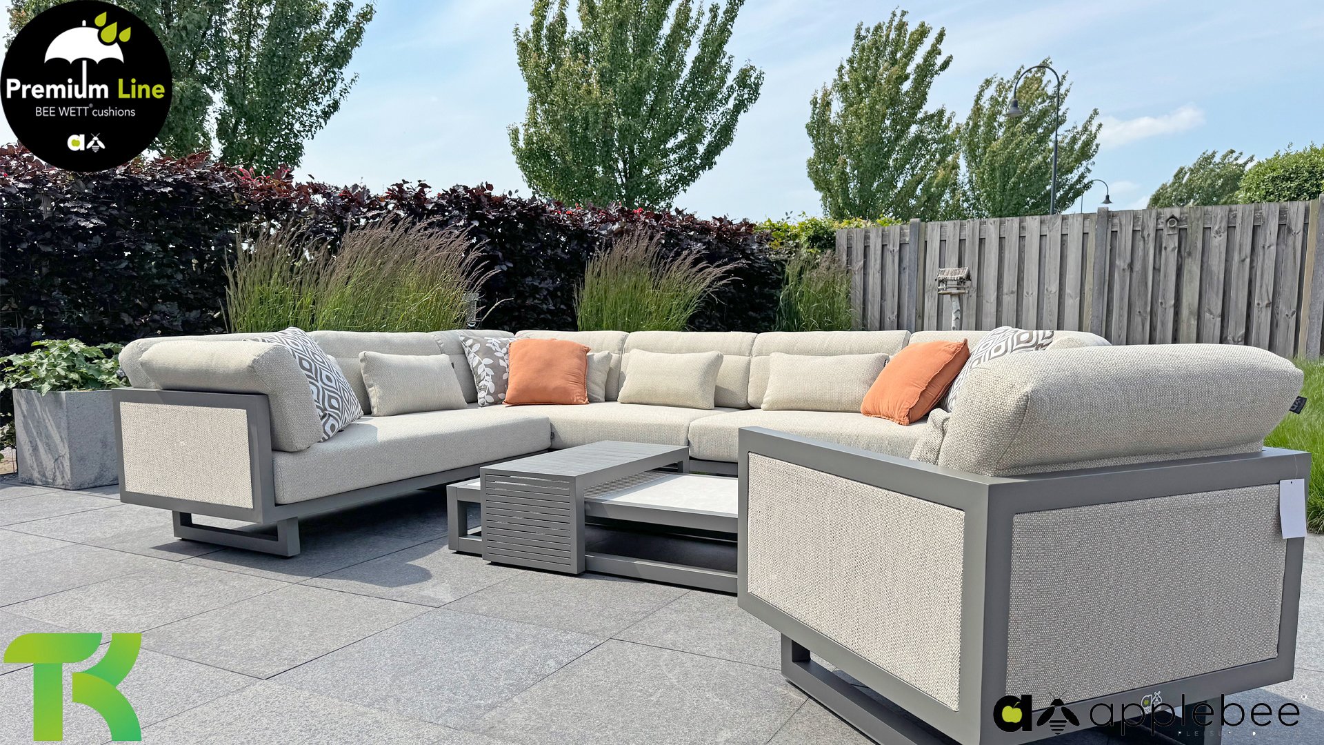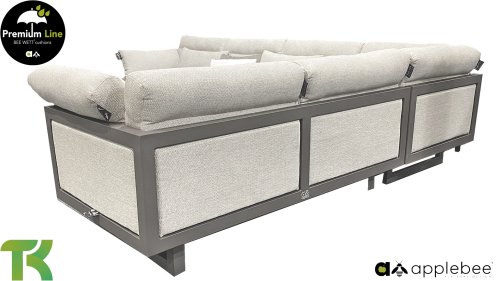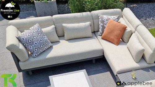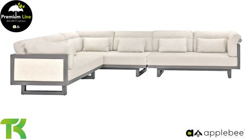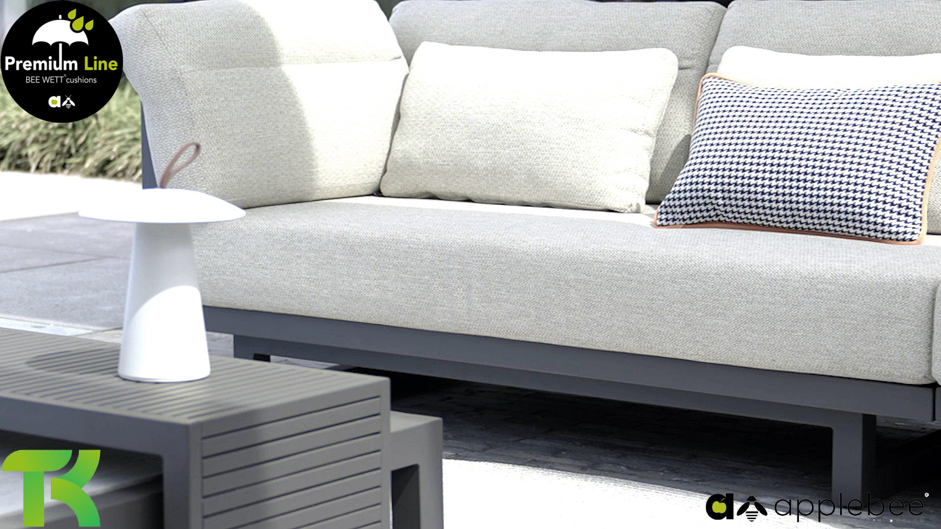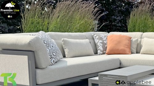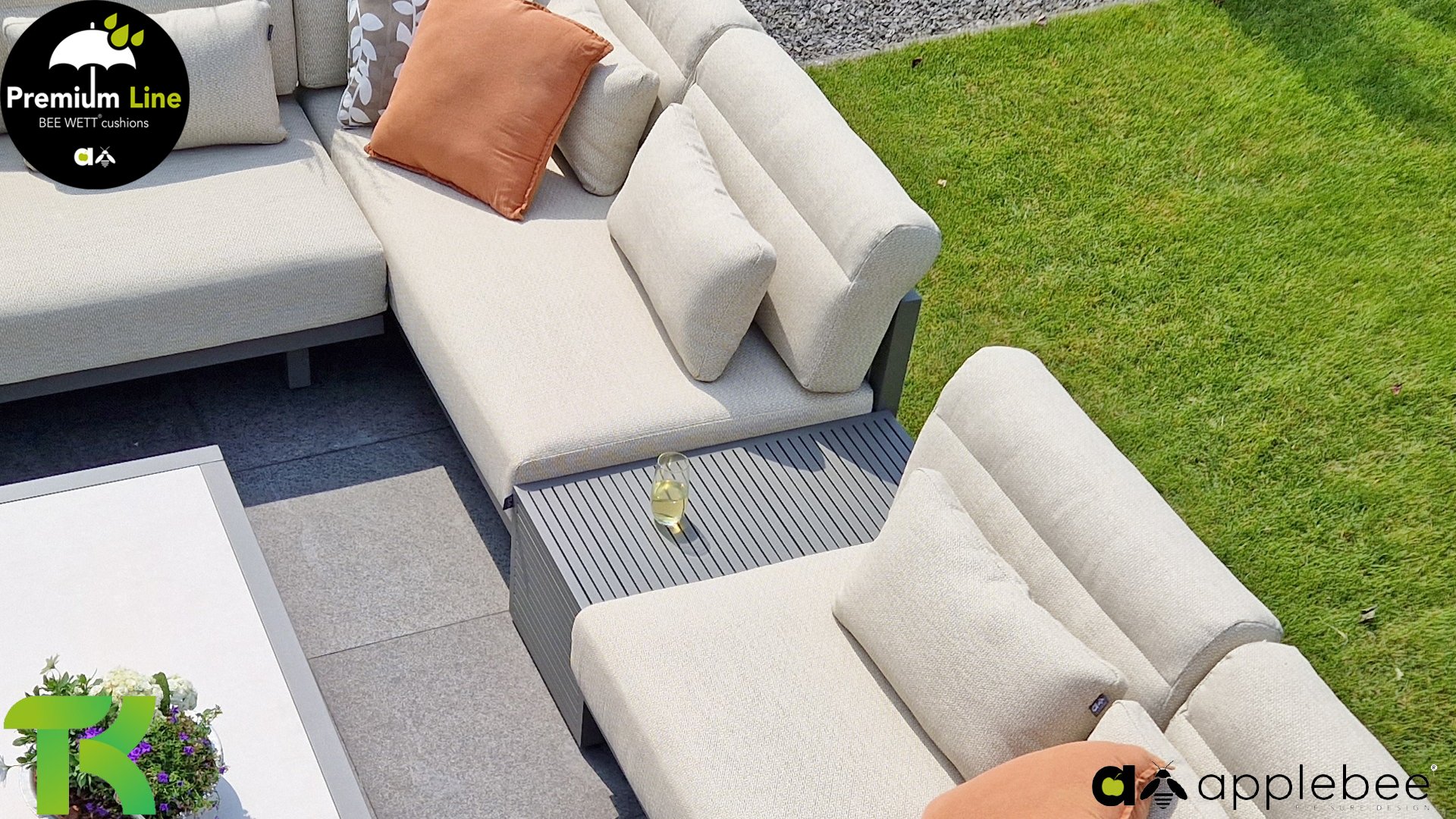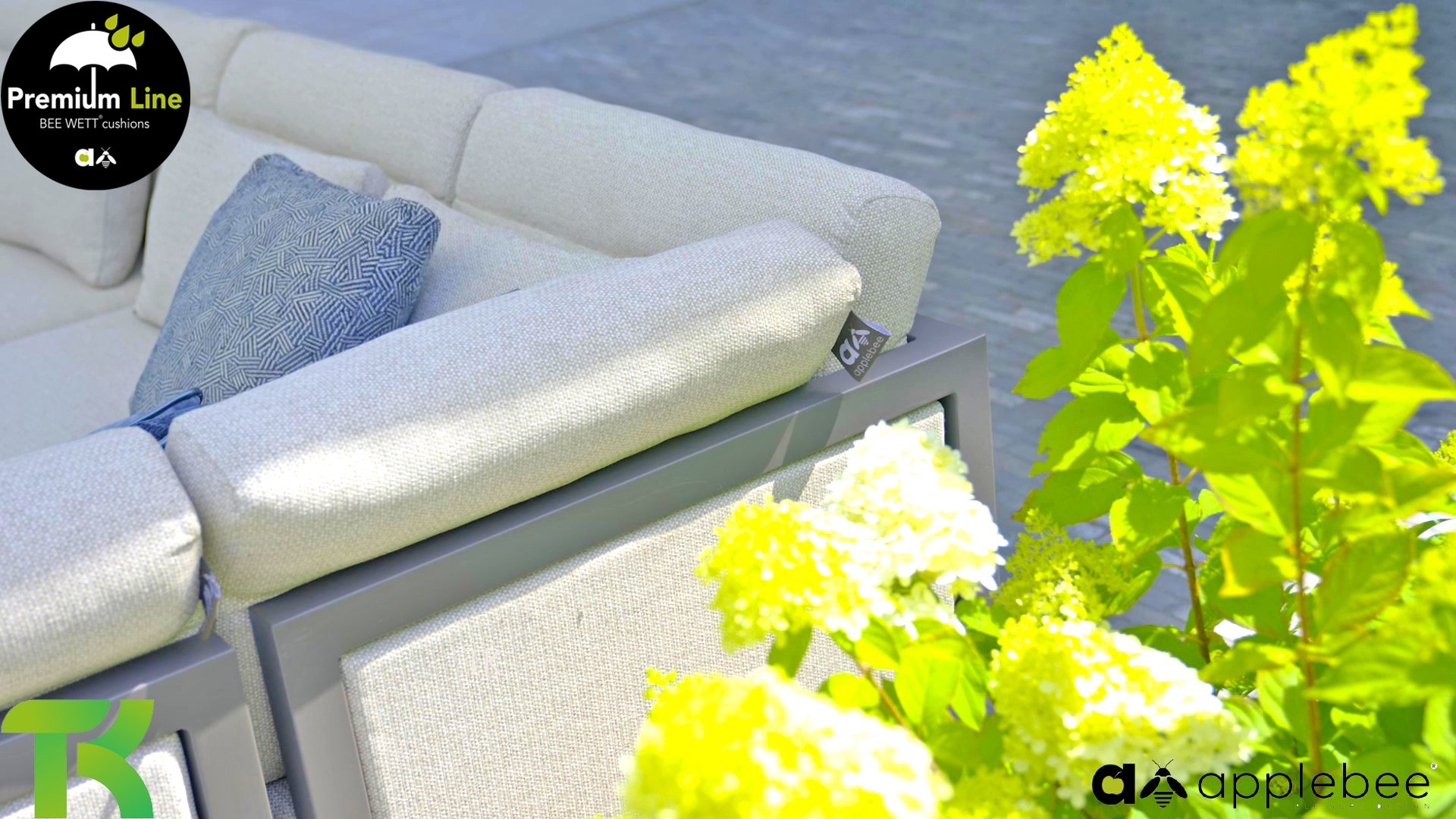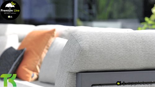 Apple Bee Santorini Lounge: Wenn Sie ein elegantes und kubistisches Lounge-Set mögen, aber keine Kompromisse bei Launen eingehen wollen … schauen Sie hier, das Santorini! Ein schlanker Vierkantrohrrahmen aus Aluminium, pulverbeschichtet in warmem Taupe. Dieses Set ist in zwei Versionen erhältlich. Der Unterschied liegt in den Paneelen in den Armen und im Rücken, die wie ein Gemälde vom Rahmen eingerahmt zu sein scheinen. In der ersten Version ist das Panel mit einem schönen gemischten Seil umwickelt. Dadurch bleibt das Set luftig mit einem zeitgemäßen Look. Die andere Version hat gepolsterte Paneele im gleichen Stoff wie die Kissen. Das verleiht dem Set sofort mehr Klasse und Luxus. Die Arm- und Rückenkissen des Santorini sind etwas Besonderes und biegen sich leicht über die Armlehnen. Sie verleihen den ansonsten klaren Linien einen weichen Touch. Dadurch können Sie sich auch bequem hinlegen. Bequeme Lendenkissen sind im Lieferumfang des Santorini enthalten. So können Sie sich voll und ganz einleben und auch an kühleren Tagen ein gemütliches Plätzchen schaffen.
