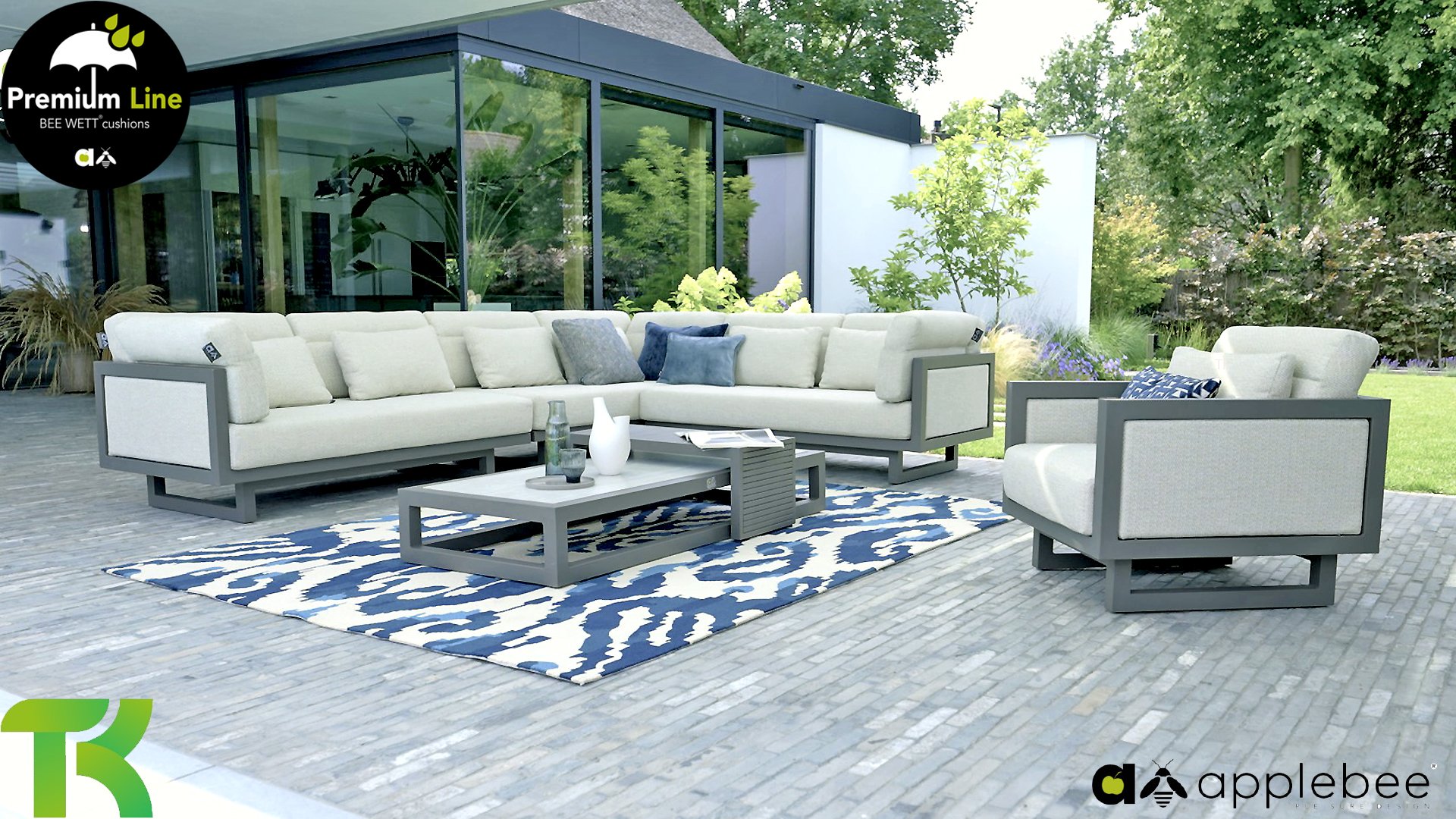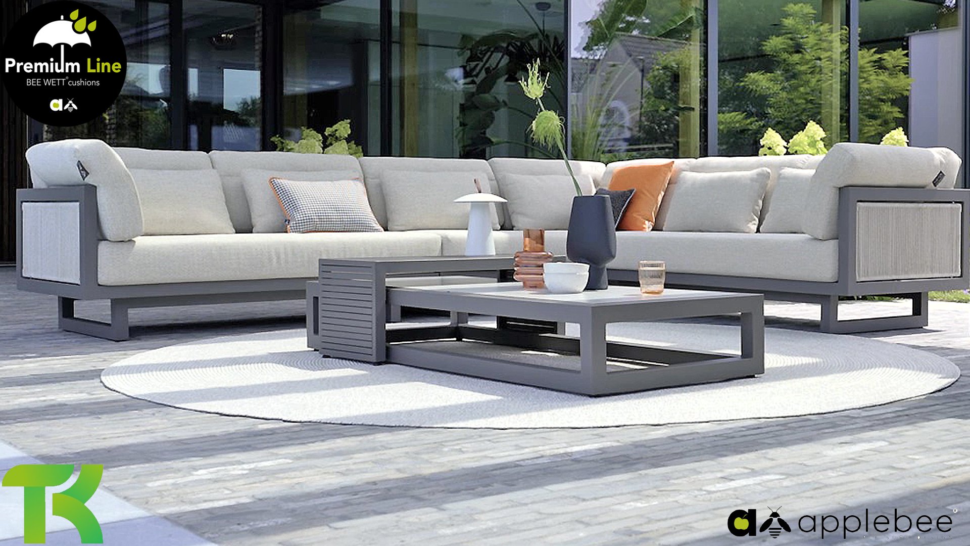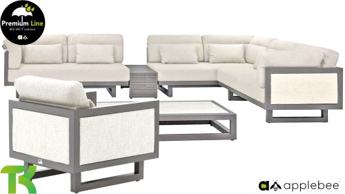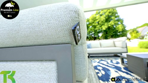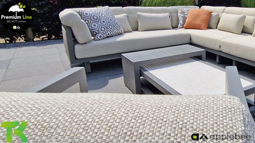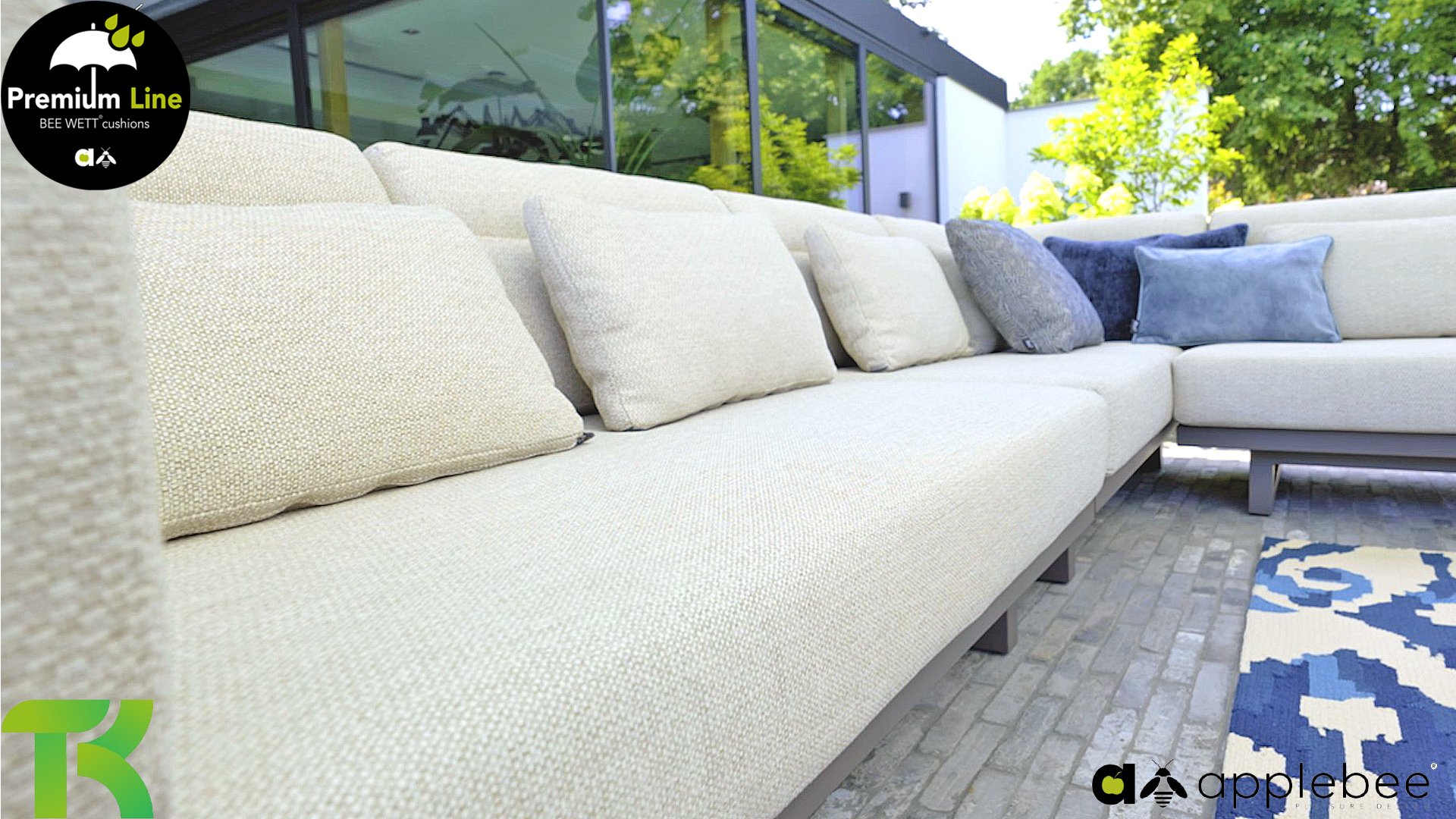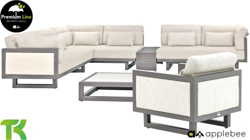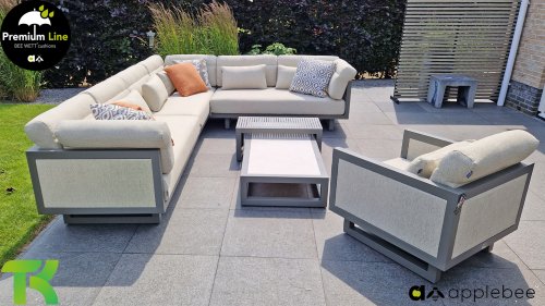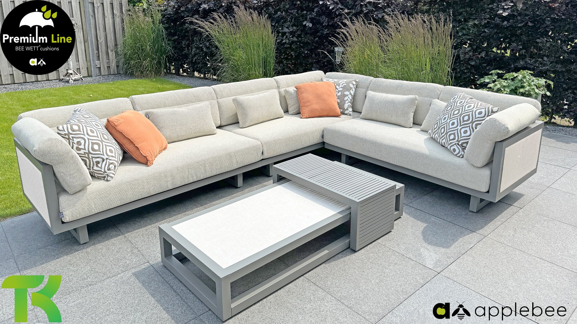 Apple Bee Santorini Lounge: Wenn Sie ein elegantes und kubistisches Lounge-Set mögen, aber keine Kompromisse bei Launen eingehen wollen … schauen Sie hier, das Santorini! Ein schlanker Vierkantrohrrahmen aus Aluminium, pulverbeschichtet in warmem Taupe. Dieses Set ist in zwei Versionen erhältlich. Der Unterschied liegt in den Paneelen in den Armen und im Rücken, die wie ein Gemälde vom Rahmen eingerahmt zu sein scheinen. In der ersten Version ist das Panel mit einem schönen gemischten Seil umwickelt. Dadurch bleibt das Set luftig mit einem zeitgemäßen Look. Die andere Version hat gepolsterte Paneele im gleichen Stoff wie die Kissen. Das verleiht dem Set sofort mehr Klasse und Luxus. Die Arm- und Rückenkissen des Santorini sind etwas Besonderes und biegen sich leicht über die Armlehnen. Sie verleihen den ansonsten klaren Linien einen weichen Touch. Dadurch können Sie sich auch bequem hinlegen. Bequeme Lendenkissen sind im Lieferumfang des Santorini enthalten. So können Sie sich voll und ganz einleben und auch an kühleren Tagen ein gemütliches Plätzchen schaffen.