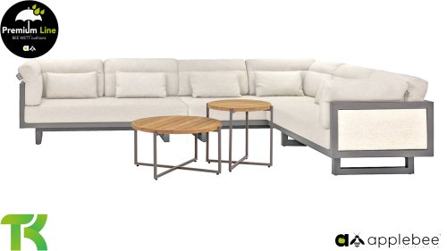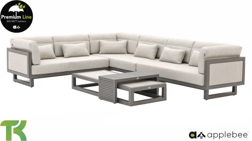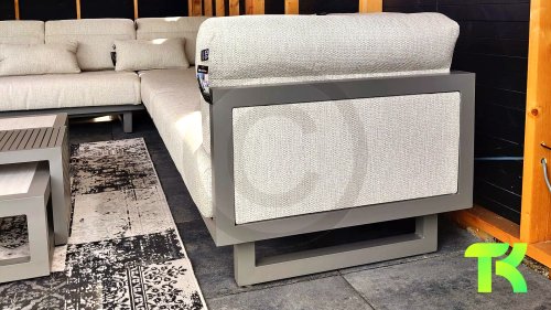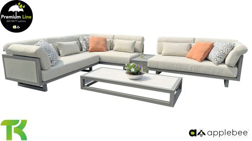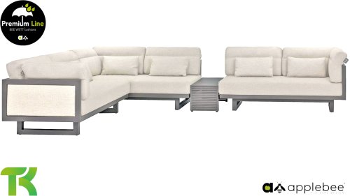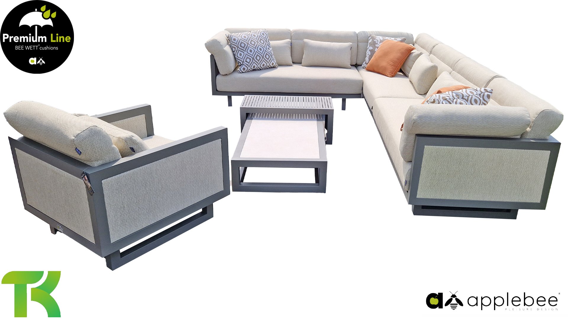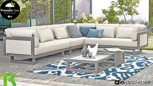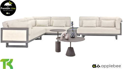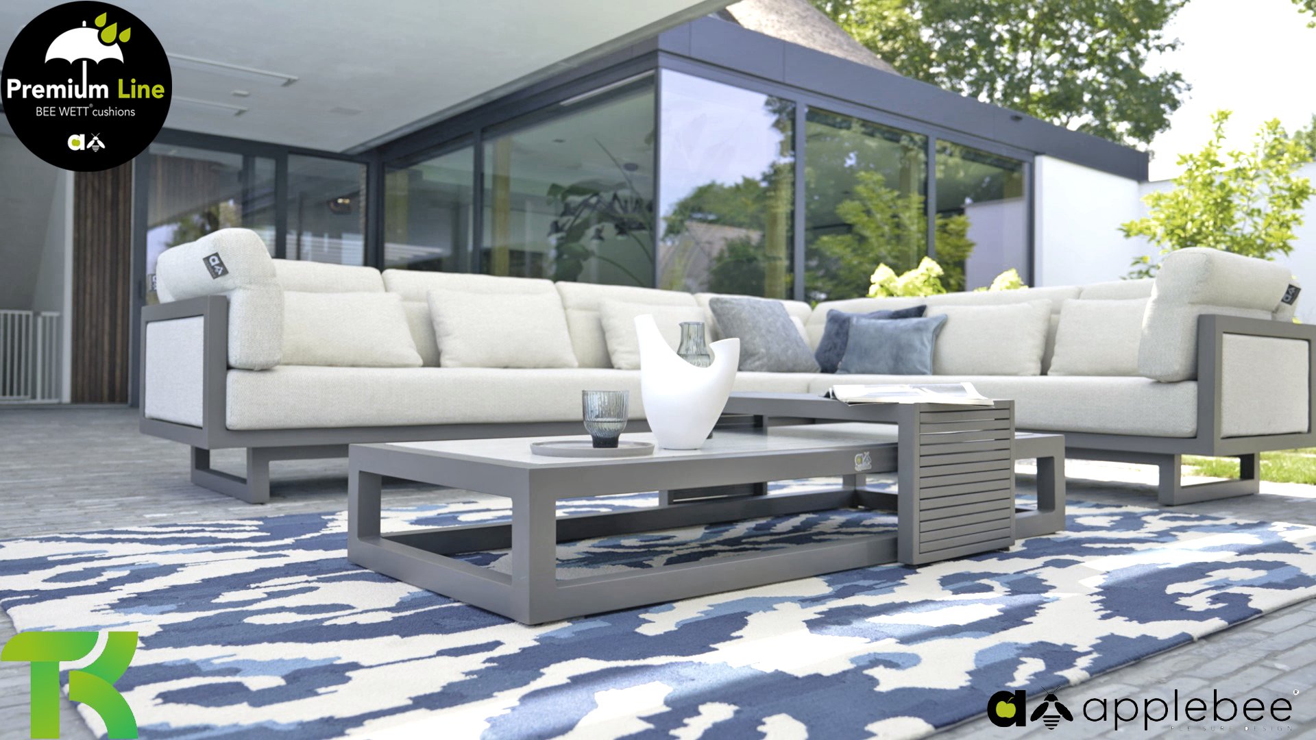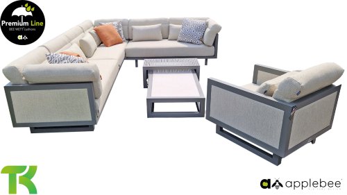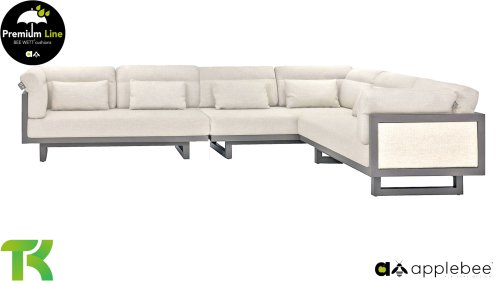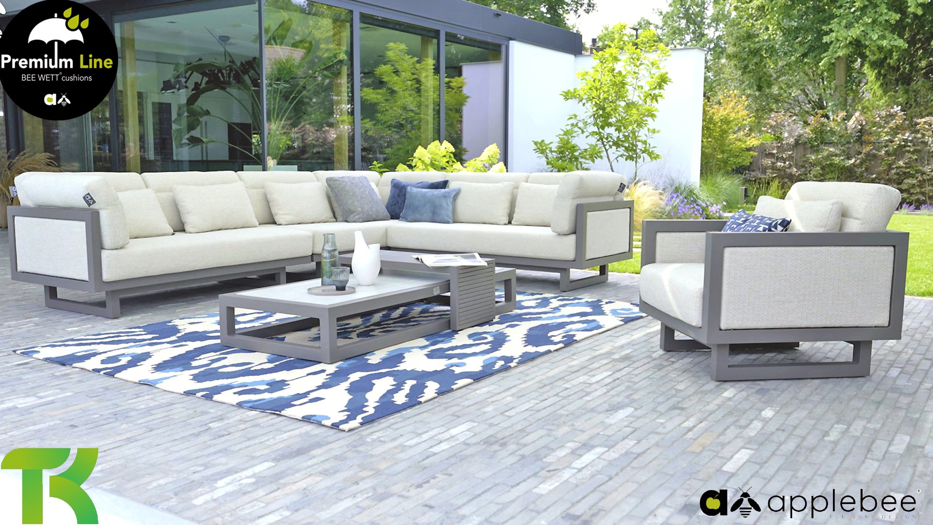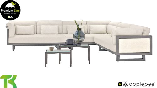 Apple Bee Santorini Lounge: Wenn Sie ein elegantes und kubistisches Lounge-Set mögen, aber keine Kompromisse bei Launen eingehen wollen … schauen Sie hier, das Santorini! Ein schlanker Vierkantrohrrahmen aus Aluminium, pulverbeschichtet in warmem Taupe. Dieses Set ist in zwei Versionen erhältlich. Der Unterschied liegt in den Paneelen in den Armen und im Rücken, die wie ein Gemälde vom Rahmen eingerahmt zu sein scheinen. In der ersten Version ist das Panel mit einem schönen gemischten Seil umwickelt. Dadurch bleibt das Set luftig mit einem zeitgemäßen Look. Die andere Version hat gepolsterte Paneele im gleichen Stoff wie die Kissen. Das verleiht dem Set sofort mehr Klasse und Luxus. Die Arm- und Rückenkissen des Santorini sind etwas Besonderes und biegen sich leicht über die Armlehnen. Sie verleihen den ansonsten klaren Linien einen weichen Touch. Dadurch können Sie sich auch bequem hinlegen. Bequeme Lendenkissen sind im Lieferumfang des Santorini enthalten. So können Sie sich voll und ganz einleben und auch an kühleren Tagen ein gemütliches Plätzchen schaffen.