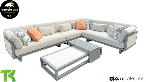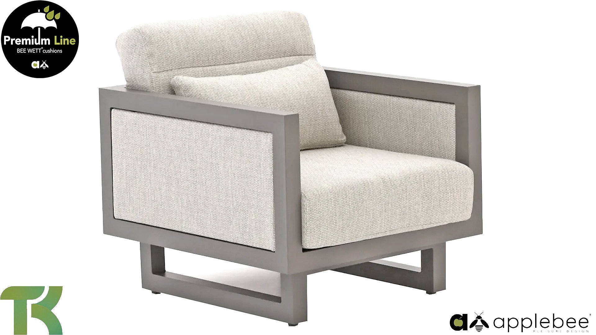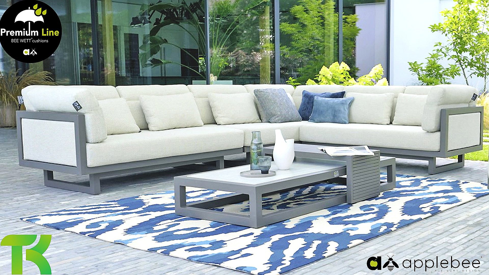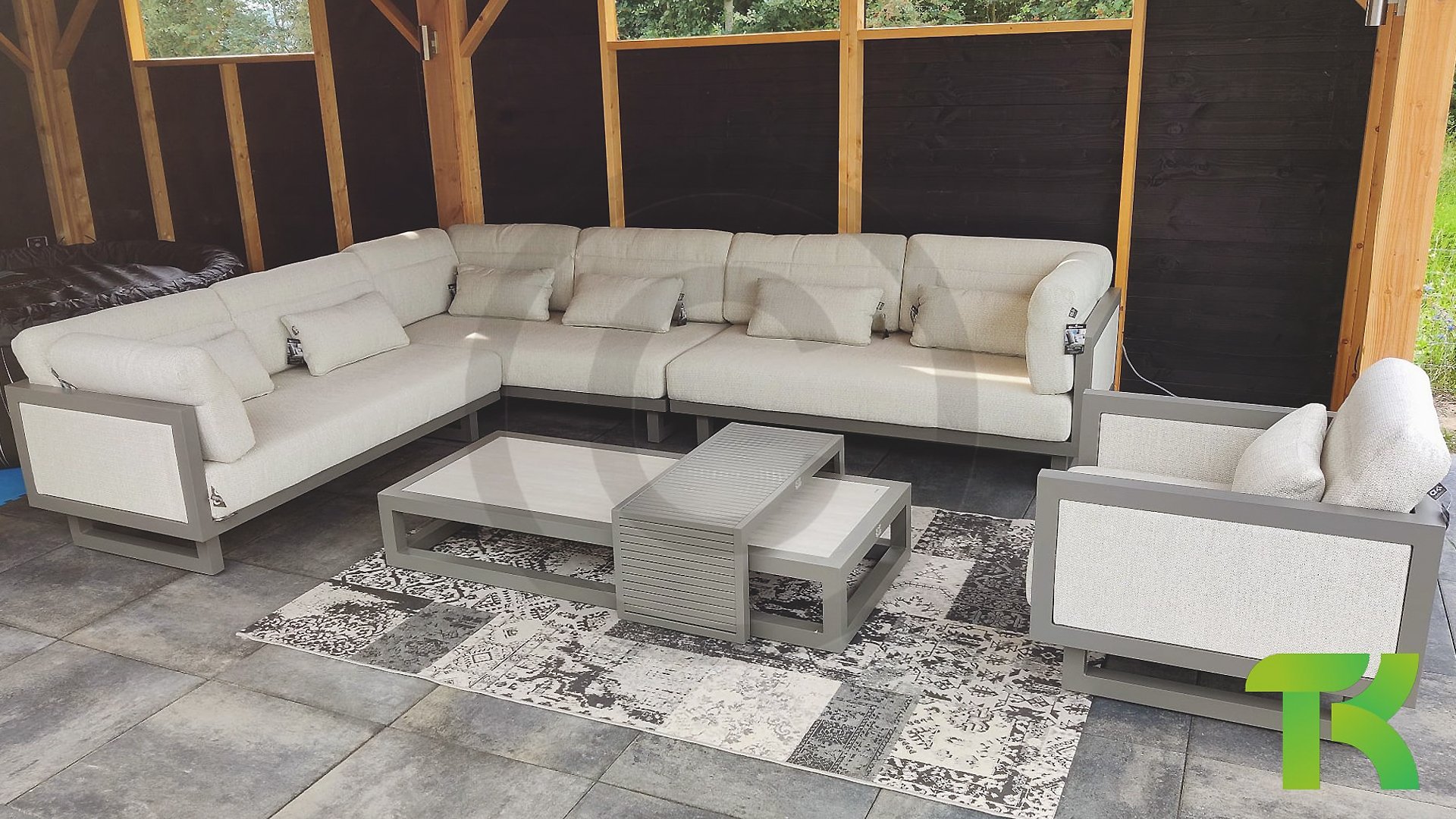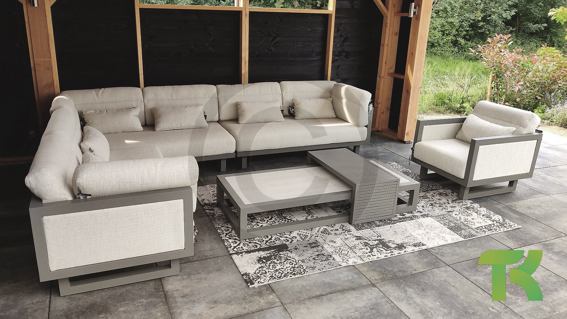 Apple Bee Santorini Lounge: Wenn Sie ein elegantes und kubistisches Lounge-Set mögen, aber keine Kompromisse bei Launen eingehen wollen … schauen Sie hier, das Santorini! Ein schlanker Vierkantrohrrahmen aus Aluminium, pulverbeschichtet in warmem Taupe. Dieses Set ist in zwei Versionen erhältlich. Der Unterschied liegt in den Paneelen in den Armen und im Rücken, die wie ein Gemälde vom Rahmen eingerahmt zu sein scheinen. In der ersten Version ist das Panel mit einem schönen gemischten Seil umwickelt. Dadurch bleibt das Set luftig mit einem zeitgemäßen Look. Die andere Version hat gepolsterte Paneele im gleichen Stoff wie die Kissen. Das verleiht dem Set sofort mehr Klasse und Luxus. Die Arm- und Rückenkissen des Santorini sind etwas Besonderes und biegen sich leicht über die Armlehnen. Sie verleihen den ansonsten klaren Linien einen weichen Touch. Dadurch können Sie sich auch bequem hinlegen. Bequeme Lendenkissen sind im Lieferumfang des Santorini enthalten. So können Sie sich voll und ganz einleben und auch an kühleren Tagen ein gemütliches Plätzchen schaffen.
