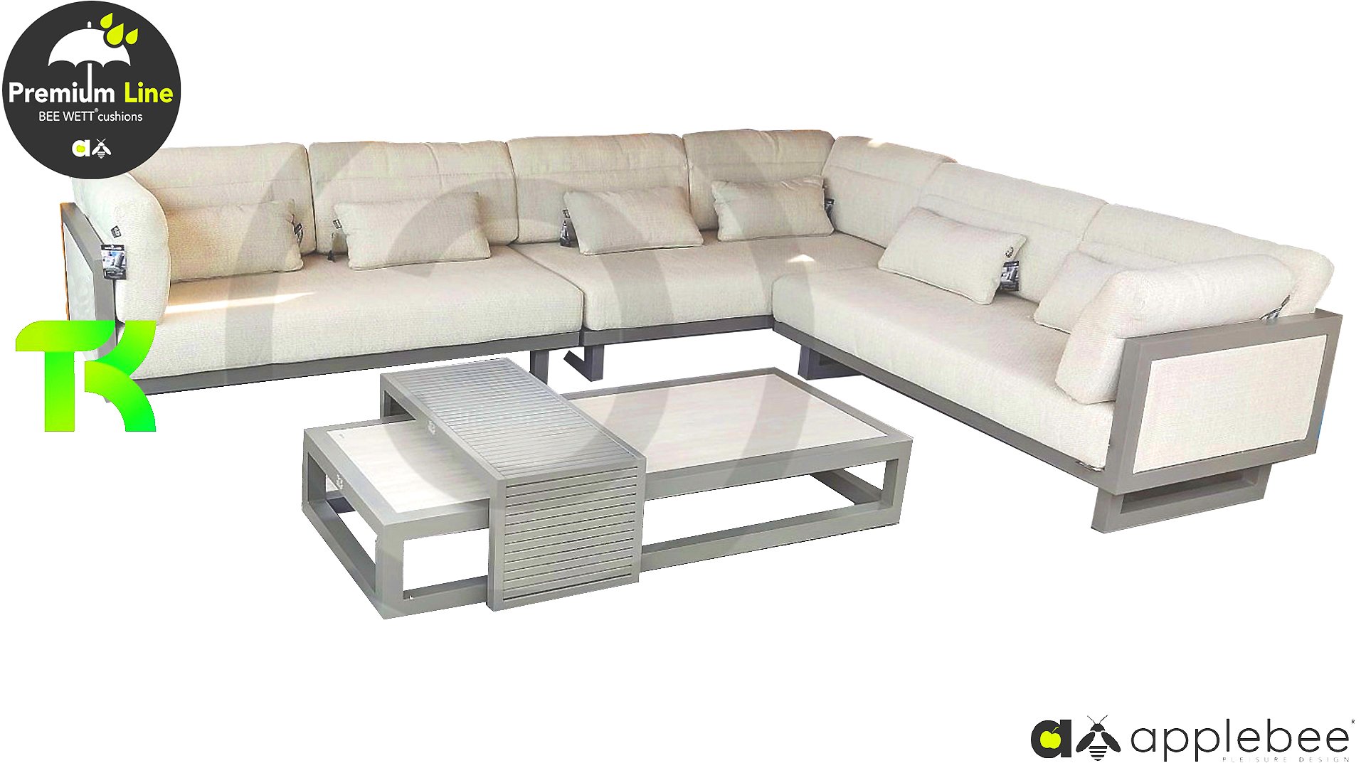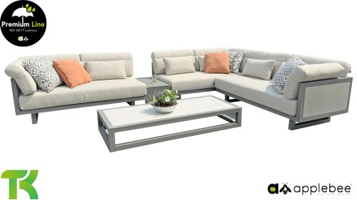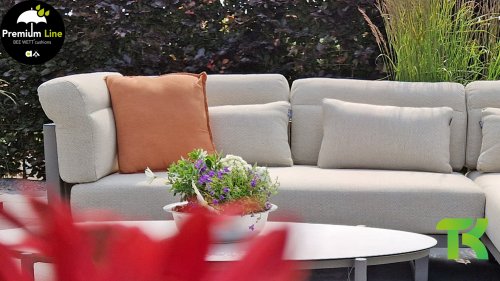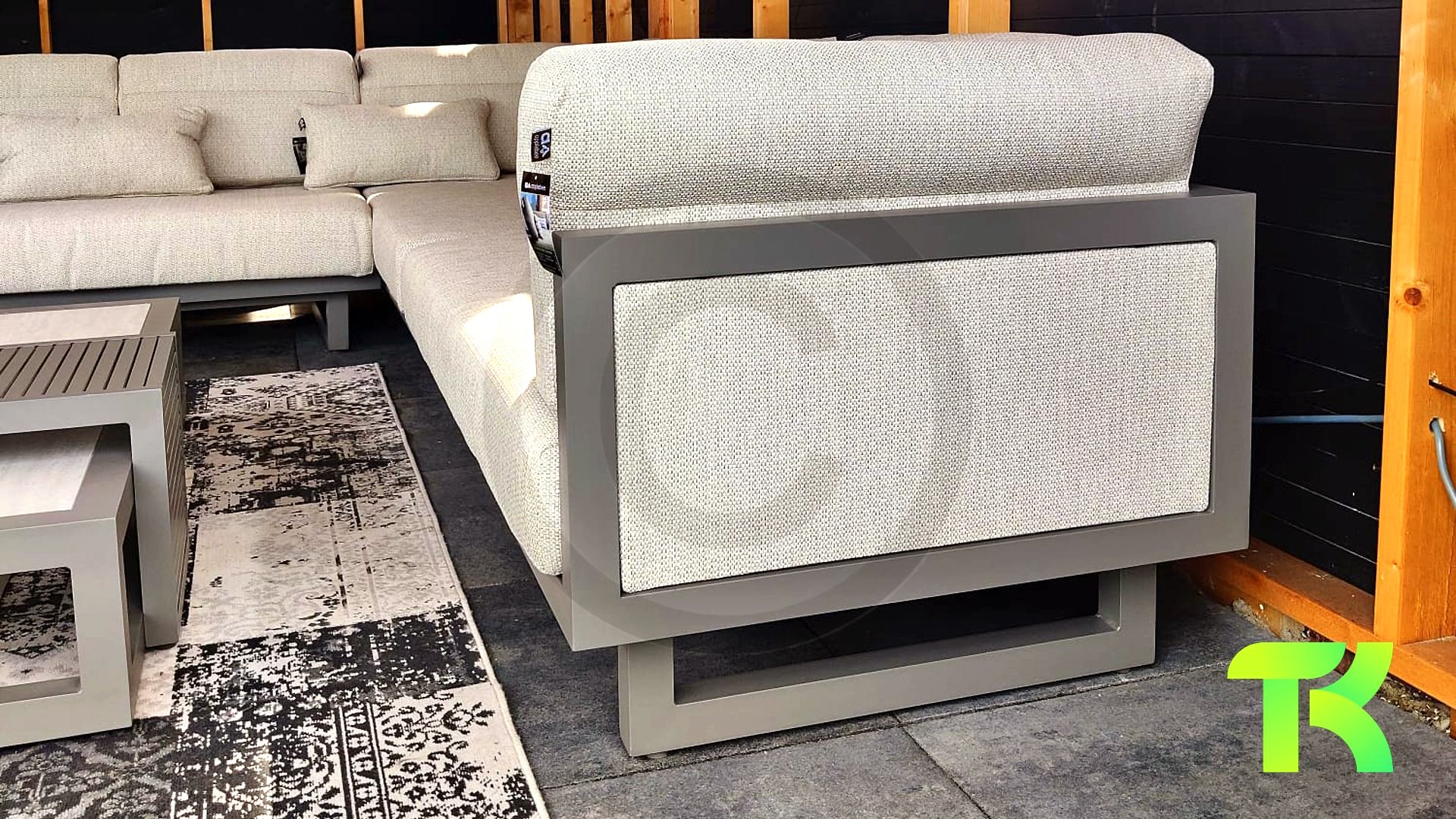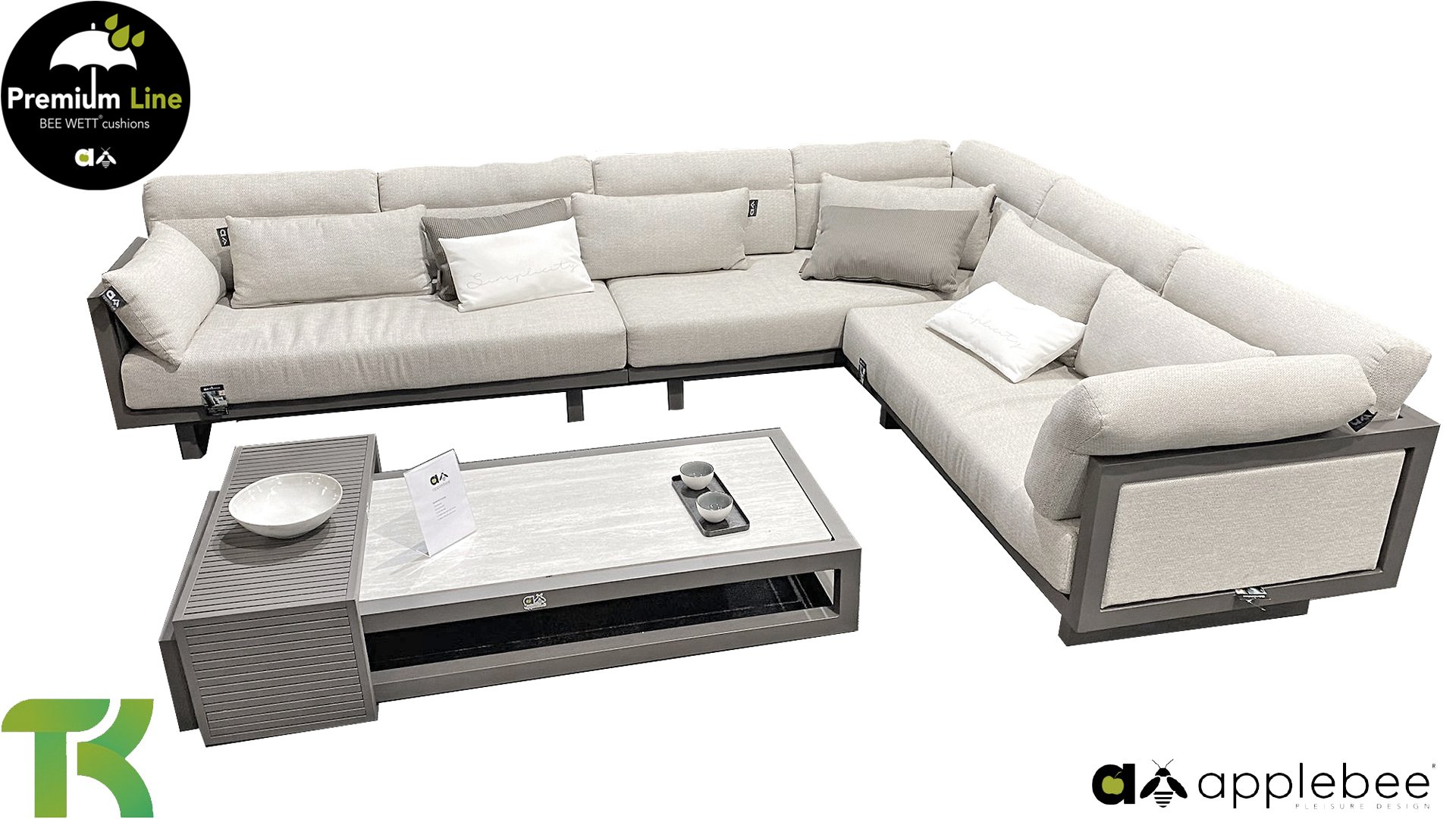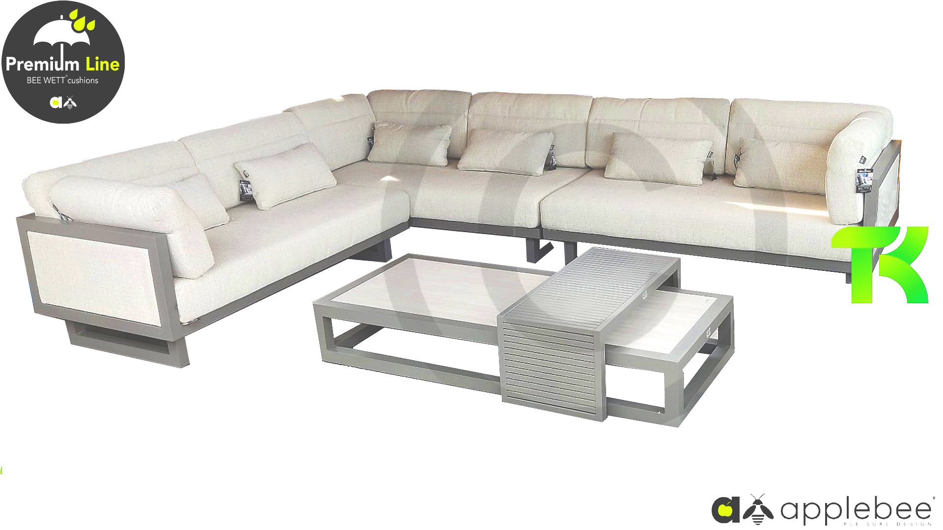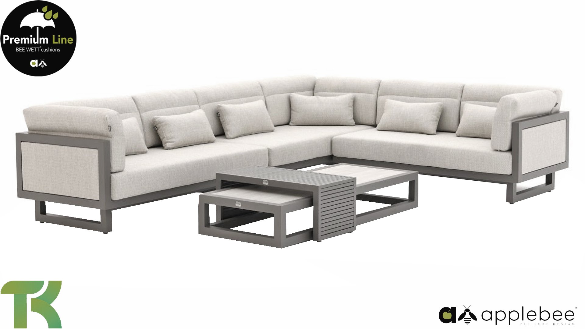 Apple Bee Santorini Lounge: Wenn Sie ein elegantes und kubistisches Lounge-Set mögen, aber keine Kompromisse bei Launen eingehen wollen … schauen Sie hier, das Santorini! Ein schlanker Vierkantrohrrahmen aus Aluminium, pulverbeschichtet in warmem Taupe. Dieses Set ist in zwei Versionen erhältlich. Der Unterschied liegt in den Paneelen in den Armen und im Rücken, die wie ein Gemälde vom Rahmen eingerahmt zu sein scheinen. In der ersten Version ist das Panel mit einem schönen gemischten Seil umwickelt. Dadurch bleibt das Set luftig mit einem zeitgemäßen Look. Die andere Version hat gepolsterte Paneele im gleichen Stoff wie die Kissen. Das verleiht dem Set sofort mehr Klasse und Luxus. Die Arm- und Rückenkissen des Santorini sind etwas Besonderes und biegen sich leicht über die Armlehnen. Sie verleihen den ansonsten klaren Linien einen weichen Touch. Dadurch können Sie sich auch bequem hinlegen. Bequeme Lendenkissen sind im Lieferumfang des Santorini enthalten. So können Sie sich voll und ganz einleben und auch an kühleren Tagen ein gemütliches Plätzchen schaffen.
