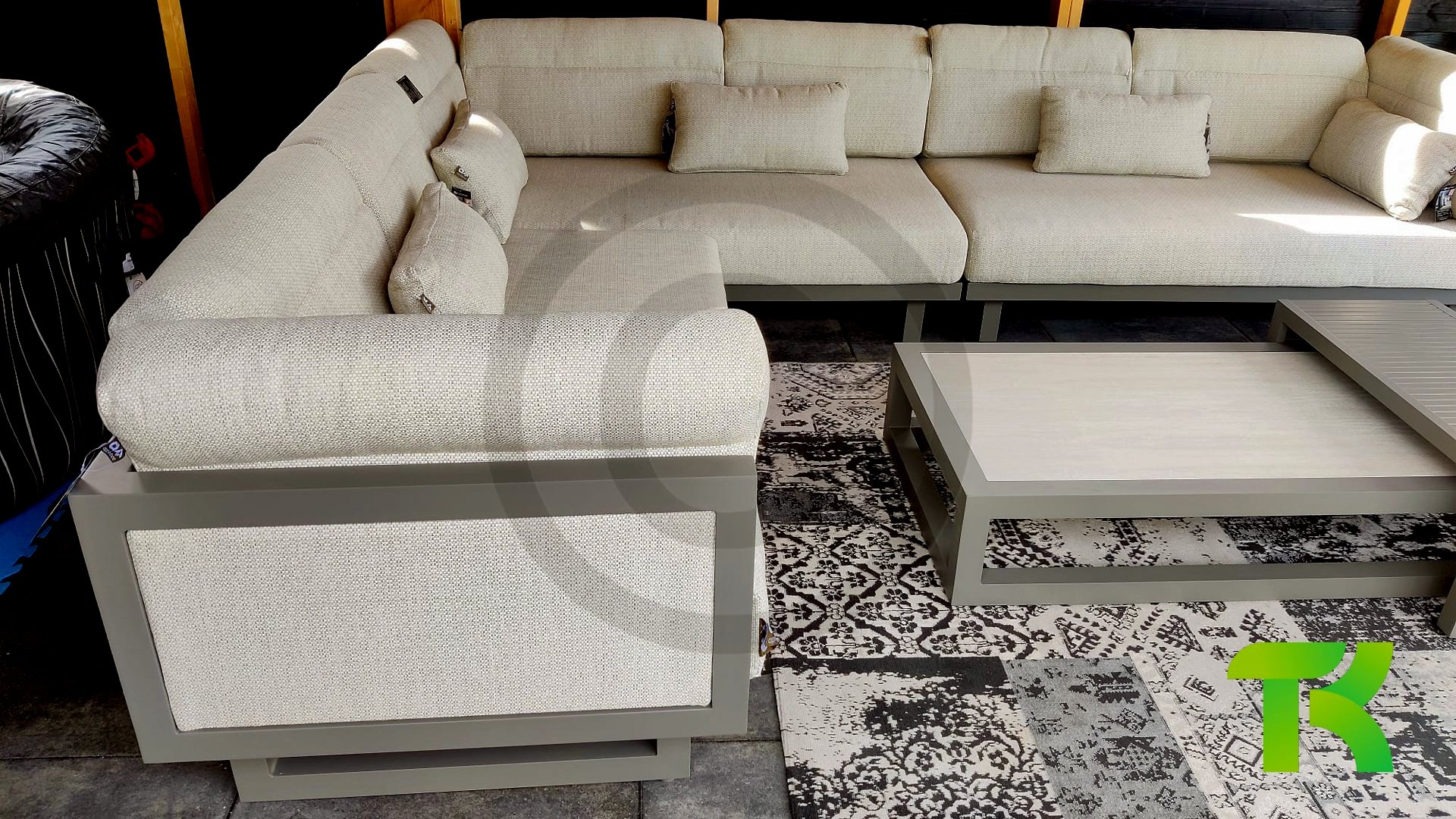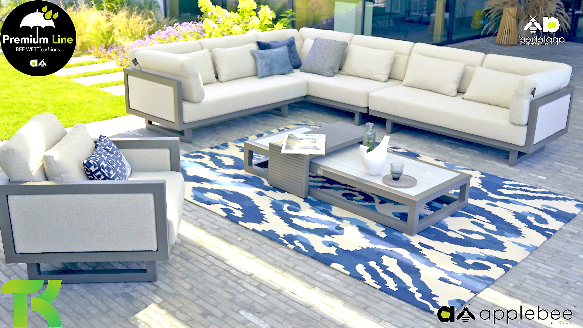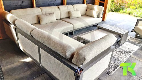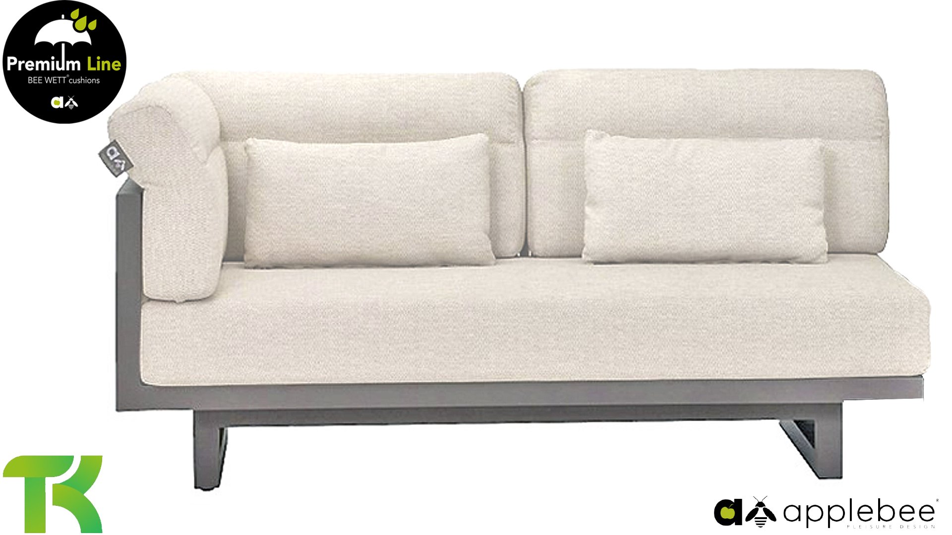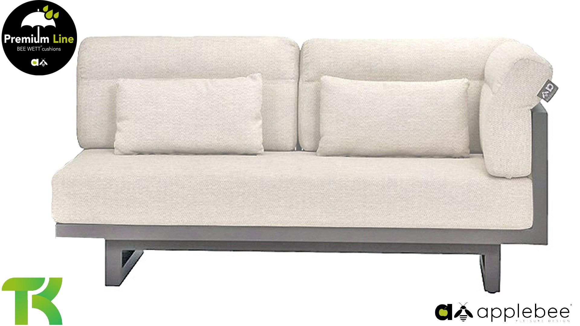 Apple Bee Santorini Lounge: Wenn Sie ein elegantes und kubistisches Lounge-Set mögen, aber keine Kompromisse bei Launen eingehen wollen … schauen Sie hier, das Santorini! Ein schlanker Vierkantrohrrahmen aus Aluminium, pulverbeschichtet in warmem Taupe. Dieses Set ist in zwei Versionen erhältlich. Der Unterschied liegt in den Paneelen in den Armen und im Rücken, die wie ein Gemälde vom Rahmen eingerahmt zu sein scheinen. In der ersten Version ist das Panel mit einem schönen gemischten Seil umwickelt. Dadurch bleibt das Set luftig mit einem zeitgemäßen Look. Die andere Version hat gepolsterte Paneele im gleichen Stoff wie die Kissen. Das verleiht dem Set sofort mehr Klasse und Luxus. Die Arm- und Rückenkissen des Santorini sind etwas Besonderes und biegen sich leicht über die Armlehnen. Sie verleihen den ansonsten klaren Linien einen weichen Touch. Dadurch können Sie sich auch bequem hinlegen. Bequeme Lendenkissen sind im Lieferumfang des Santorini enthalten. So können Sie sich voll und ganz einleben und auch an kühleren Tagen ein gemütliches Plätzchen schaffen.