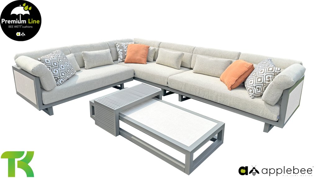 Die Apple Bee Santorini Kaffeetisch-Gruppe, dessen Basis aus Aluminium in der Farbe Quarz besteht. Die Platte des 155 cm langen Tisches ist aus Keramik in der Farbe Travetino. Eine elegante Kombination, besonders mit dem AppleBee Santorini Lounge!